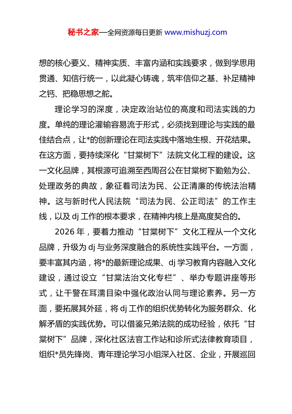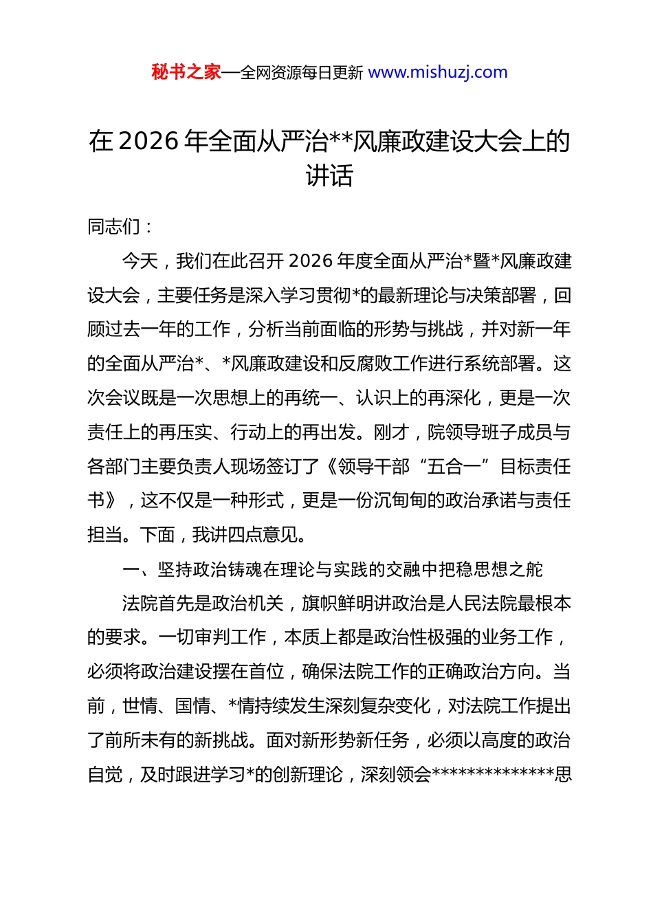 秘书之家—全网资源每日更新 www.mishuzj.com在 2026 年全面从严治**风廉政建设大会上的讲话同志们:今天,我们在此召开 2026 年度全面从严治*暨*风廉政建设大会,主要任务是深入学习贯彻*的最新理论与决策部署,回顾过去一年的工作,分析当前面临的形势与挑战,并对新一年的全面从严治*、*风廉政建设和反腐败工作进行系统部署。这次会议既是一次思想上的再统一、认识上的再深化,更是一次责任上的再压实、行动上的再出发。刚才,院领导班子成员与各部门主要负责人现场签订了《领导干部“五合一”目标责任书》,这不仅是一种形式,更是一份沉甸甸的政治承诺与责任担当。下面,我讲四点意见。一、坚持政治铸魂在理论与实践的交融中把稳思想之舵法院首先是政治机关,旗帜鲜明讲政治是人民法院最根本的要求。一切审判工作,本质上都是政治性极强的业务工作,必须将政治建设摆在首位,确保法院工作的正确政治方向。当前,世情、国情、*情持续发生深刻复杂变化,对法院工作提出了前所未有的新挑战。面对新形势新任务,必须以高度的政治自觉,及时跟进学习*的创新理论,深刻领会**************思秘书之家—全网资源每日更新 www.mishuzj.com想的核心要义、精神实质、丰富内涵和实践要求,做到学思用贯通、知信行统一,以此凝心铸魂,筑牢信仰之基、补足精神之钙、把稳思想之舵。理论学习的深度,决定政治站位的高度和司法实践的力度。单纯的理论灌输容易流于形式,必须找到理论与实践的最佳结合点,让*的创新理论在司法实践中落地生根、开花结果。在这方面,要持续深化“甘棠树下”法院文化工程的建设。这一文化品牌,其根源可追溯至西周召公在甘棠树下勤勉为公、处理政务的典故,象征着司法为民、公正清廉的传统法治精神。这与新时代人民法院“司法为民、公正司法”的工作主线,以及 dj 工作的根本要求,在精神内核上是高度契合的。2026 年,要着力推动“甘棠树下”文化工程从一个文化品牌,升级为 dj 与业务深度融合的系统性实践平台。一方面,要丰富其内涵,将*的最新理论成果、dj 学习教育内容融入文化建设,通过设立“甘棠法治文化专栏”、举办专题讲座等形式,让干警在耳濡目染中强化政治认同与理论素养。另一方面,要拓展其外延,将 dj 工作的组织优势转化为服务群众、化解矛盾的实践优势。可以借鉴兄弟法院的成功经验,依托“甘棠树下”品牌,深化社区法官工作站和诊所式法律教育项目,组织*员先锋岗、青年理论学习小组深入社区、企业,开展巡回秘书之家—全网资源每日更新 www.mishuzj.com审判、普法宣传、矛盾源头化解等工作。通过这种方式,将政治理论学习的成果,直接转化为提升群众司法获得感的具体行动,形成“总品牌领航定向、分品牌聚力赋能”的生动格局,真正实现 dj 工作与审判业务在目标上同向、在部署上同步、在成效上同显。二、聚焦主责主业在全流程的监督中彰显公正之要司法公正是社会公平正义的最后一道防线,而立案、审判、执行的全流程监督管理,是守护这道防线的核心机制。如果监督管理存在漏洞,司法权力就可能被滥用,司法公正就无从谈起。2026 年是院里部署的“正风肃纪年”,其核心要义,就是要以最坚决的态度、最严密的措施,抓实立审执各环节的监督管理,全面压实管*治*责任,确保司法权在阳光下规范、廉洁、高效运行。强化监督管理,不能停留在口号上,必须有科学、精准、可量化的抓手。当前,全国法院系统正在深化审判质量管理指标体系改革,其核心导向就是以科学的指标体系作为“体检表”,引导司法工作回归本源,实现质量、效率与效果的统一。我们要紧跟这一改革步伐,运用好审判质效关键绩效指标(kpi)这一现代管理工具。例如,“案-件比”指标,其数值的高低直接反映了案件在审理过程中是否出现不必要的程序空秘书之家—全网资源每日更新 www.mishuzj.com转和衍生诉讼,是衡量审判工作质量、效率和效果的综合性指标。还有“审限内结案率”,它直接关系到当事人的诉讼体验和司法效率;“生效案件改判率”和“发回重审率”,则从反向揭示了审判质量可能存在的短板;“执行到位率”更是直接体现司法效果和胜诉当事人权益实现的关...