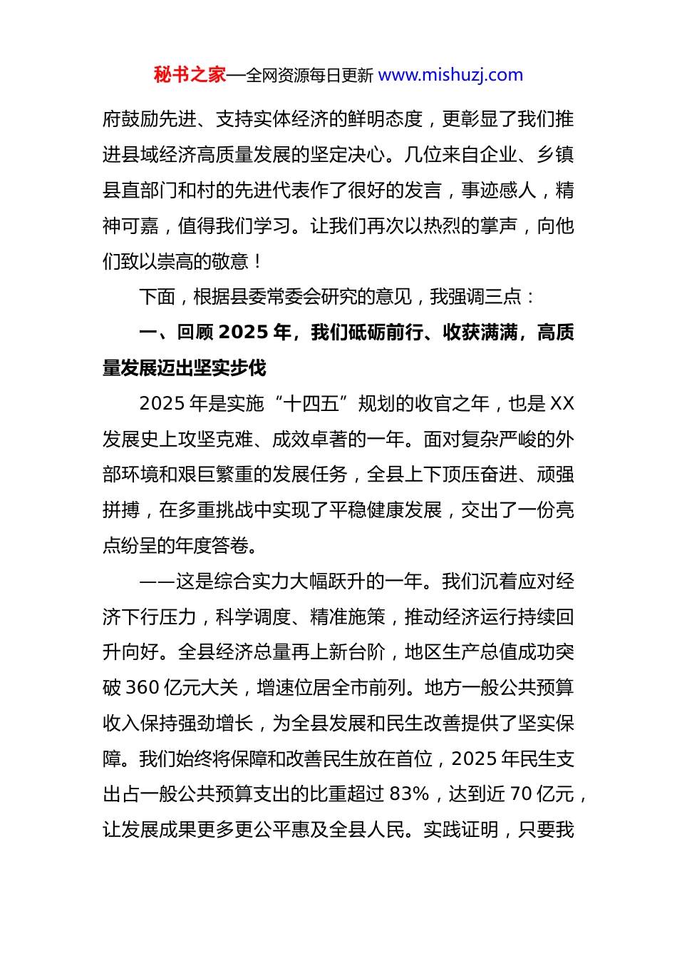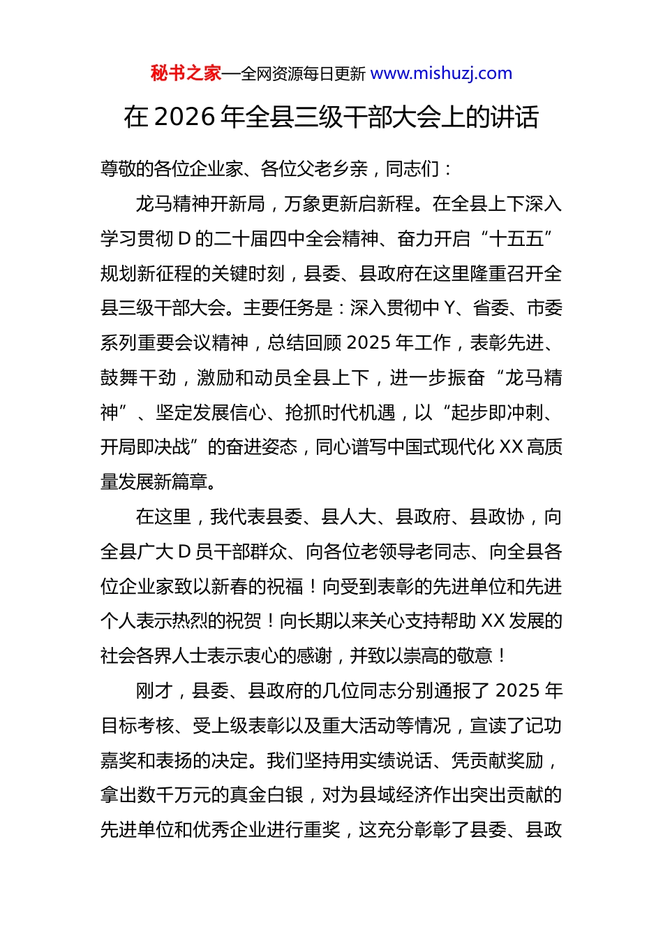 秘书之家—全网资源每日更新 www.mishuzj.com在 2026 年全县三级干部大会上的讲话尊敬的各位企业家、各位父老乡亲,同志们:龙马精神开新局,万象更新启新程。在全县上下深入学习贯彻 D 的二十届四中全会精神、奋力开启“十五五”规划新征程的关键时刻,县委、县政府在这里隆重召开全县三级干部大会。主要任务是:深入贯彻中 Y、省委、市委系列重要会议精神,总结回顾 2025 年工作,表彰先进、鼓舞干劲,激励和动员全县上下,进一步振奋“龙马精神”、坚定发展信心、抢抓时代机遇,以“起步即冲刺、开局即决战”的奋进姿态,同心谱写中国式现代化 XX 高质量发展新篇章。在这里,我代表县委、县人大、县政府、县政协,向全县广大 D 员干部群众、向各位老领导老同志、向全县各位企业家致以新春的祝福!向受到表彰的先进单位和先进个人表示热烈的祝贺!向长期以来关心支持帮助 XX 发展的社会各界人士表示衷心的感谢,并致以崇高的敬意!刚才,县委、县政府的几位同志分别通报了 2025 年目标考核、受上级表彰以及重大活动等情况,宣读了记功嘉奖和表扬的决定。我们坚持用实绩说话、凭贡献奖励,拿出数千万元的真金白银,对为县域经济作出突出贡献的先进单位和优秀企业进行重奖,这充分彰彰了县委、县政秘书之家—全网资源每日更新 www.mishuzj.com府鼓励先进、支持实体经济的鲜明态度,更彰显了我们推进县域经济高质量发展的坚定决心。几位来自企业、乡镇县直部门和村的先进代表作了很好的发言,事迹感人,精神可嘉,值得我们学习。让我们再次以热烈的掌声,向他们致以崇高的敬意!下面,根据县委常委会研究的意见,我强调三点:一、回顾 2025 年,我们砥砺前行、收获满满,高质量发展迈出坚实步伐2025 年是实施“十四五”规划的收官之年,也是 XX发展史上攻坚克难、成效卓著的一年。面对复杂严峻的外部环境和艰巨繁重的发展任务,全县上下顶压奋进、顽强拼搏,在多重挑战中实现了平稳健康发展,交出了一份亮点纷呈的年度答卷。——这是综合实力大幅跃升的一年。我们沉着应对经济下行压力,科学调度、精准施策,推动经济运行持续回升向好。全县经济总量再上新台阶,地区生产总值成功突破 360 亿元大关,增速位居全市前列。地方一般公共预算收入保持强劲增长,为全县发展和民生改善提供了坚实保障。我们始终将保障和改善民生放在首位,2025 年民生支出占一般公共预算支出的比重超过 83%,达到近 70 亿元,让发展成果更多更公平惠及全县人民。实践证明,只要我秘书之家—全网资源每日更新 www.mishuzj.com们坚持发展第一要务不动摇,就一定能战胜任何艰难险阻,推动县域经济航船行稳致远。——这是项目引擎强劲轰鸣的一年。我们始终坚持“项目为王”,以“大干项目、干大项目”的雄心壮志,推动有效投资实现量质齐升。总投资超百亿元的 XX 绿色建材基地项目取得决定性进展,关键的物流大动脉——XX 港XX 港区绿色建材码头已于去年顺利通过竣工验收,长距离运输廊道等控制性工程全面推进,一个现代化的“绿色矿山”即将全面投产运营,为我县工业经济注入澎湃动力。备受瞩目的 XX 抽水蓄能电站项目,在完成所有前期审批后,已于 2025 年 6 月举行了隆重的工程启动推进会,全面进入主体工程建设阶段。这两大百亿级项目的“双轮驱动”彻底重塑了 XX 的产业格局和发展能级。同时,我们全年招商引资和项目争投成果丰硕,一大批强链、补链、延链的优质项目成功落地,为高质量发展积蓄了强大后劲。实践证明,项目建设是高质量发展的“生命线”,只要我们紧抓项目不放松,就一定能掌握发展的主动权。——这是民生福祉持续增进的一年。我们深入践行以人民为中心的发展思想,聚焦群众“急难愁盼”,用心用情办好民生实事。教育事业再传佳音,高考成绩持续辉煌城乡教育资源配置更加均衡。健康 XX 建设扎实推进,县人秘书之家—全网资源每日更新 www.mishuzj.com民医院创“三甲”工作稳步开展,基层医疗服务能力显著提升。城乡人居环境焕然一新,“共同缔造”理念深入人心,一批老旧小区完成改造,数千套还建房交付使用,城乡路网持续完善,群众的获得感、...