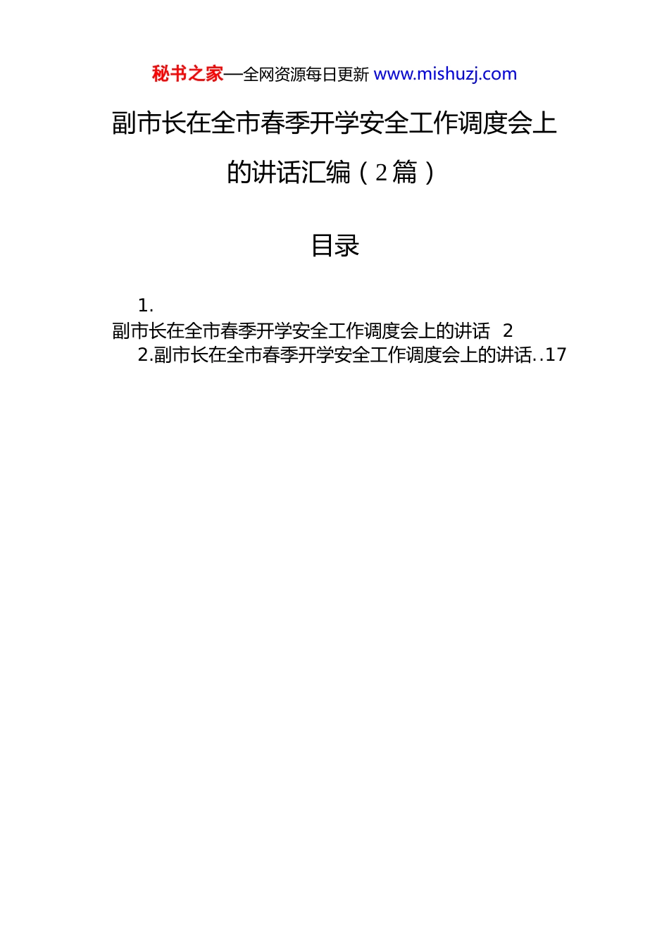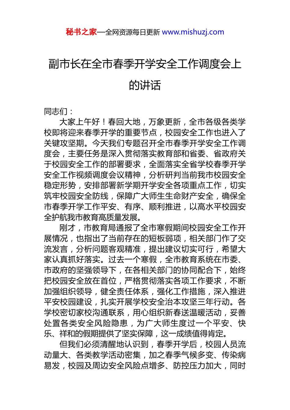 秘书之家—全网资源每日更新 www.mishuzj.com副市长在全市春季开学安全工作调度会上的讲话汇编(2 篇)目录1.副市长在全市春季开学安全工作调度会上的讲话 22.副市长在全市春季开学安全工作调度会上的讲话..17秘书之家—全网资源每日更新 www.mishuzj.com副市长在全市春季开学安全工作调度会上的讲话同志们:大家上午好!春回大地,万象更新,全市各级各类学校即将迎来春季开学的重要节点,校园安全工作也进入了关键攻坚期。今天我们专题召开全市春季开学安全工作调度会,主要任务是深入贯彻落实教育部和省委、省政府关于校园安全工作的部署要求,全面落实全省学校春季开学安全工作视频调度会议精神,分析研判当前我市校园安全稳定形势,安排部署新学期开学安全各项重点工作,切实筑牢校园安全防线,保障广大师生生命财产安全,确保全市春季开学工作平安、有序、顺利推进,以高水平校园安全护航我市教育高质量发展。刚才,市教育局通报了全市寒假期间校园安全工作开展情况,也指出了当前存在的短板弱项,相关部门作了交流发言,分析问题客观精准,提出建议切实可行,希望大家认真抓好落实。过去一个寒假,全市教育系统在市委、市政府的坚强领导下,在各相关部门的协同配合下,始终把校园安全放在首位,严格贯彻落实各项工作要求,不断加强组织领导,健全责任体系,强化工作措施,深入推进平安校园建设,扎实开展学校安全治本攻坚三年行动。各学校密切家校沟通联系,用心组织新春送温暖活动,妥善处置各类安全风险隐患,为广大师生度过一个平安、快乐、祥和的假期提供了坚实保障,这一成绩值得肯定。但我们必须清醒地认识到,春季开学后,校园人员流动量大、各类教学活动密集,加之春季气候多变、传染病易发,校园及周边安全风险点增多、防控压力加大,同时秘书之家—全网资源每日更新 www.mishuzj.com全国两会召开在即,做好校园安保维稳工作责任重大、使命艰巨。从前期排查情况来看,我市部分学校还存在设施设备维护不及时、校园周边治理有死角、食品安全管控有漏洞、心理健康教育不深入等问题,这些问题都给校园安全埋下了隐患。各地各部门、各级各类学校必须提高政治站位,树牢“人民至上、生命至上”的理念,始终保持如履薄冰的警惕、如临深渊的警醒,坚决克服麻痹思想、侥幸心理、松劲心态,把校园安全工作摆在更加突出的位置,以“时时放心不下”的责任感,紧盯重点领域、关键环节、薄弱部位,抓实抓细各项安全工作措施,坚决守住校园安全底线,坚决防范各类校园安全事故发生。下面,就做好全市春季开学安全工作,我讲十个方面的意见:一、狠抓设施设备隐患排查,筑牢校园硬件安全屏障校园设施设备是开展教育教学活动的基础,其安全状况直接关系到师生的日常学习生活安全。各地各校要坚持问题导向,立即组织开展校园设施设备全方位、拉网式安全隐患排查整治,做到横向到边、纵向到底、不留死角、不漏盲区。重点对校园教学楼、宿舍楼、食堂、图书馆、实验室等建筑的结构安全、消防通道、疏散指示标志等进行全面检查,对年久失修、存在结构隐患的建筑,要立即停止使用并采取加固、修缮等措施,经专业检测合格后方可投入使用。对体育设施、游乐设施要逐一进行检修和维护,重点检查器械牢固度、防护措施是否到位,对损坏、老化的设施及时更换,防止学生活动时发生摔伤、碰伤等事故。要强化水电暖设施安全管理,对校园供电线路、配电箱、水泵、供暖管道等进行全面排查,及时更换老化线路、维修故障设备,严格规范用电、用水、用暖操作流程,防止发生触电、漏水、煤气泄漏等安全事故。要严格落实消防设施“每日检查、定期维护”制度,对灭火器、秘书之家—全网资源每日更新 www.mishuzj.com消防栓、消防水带、应急照明等消防设施进行全面检验,确保数量充足、性能完好、取用方便;同时要做好消防设施满负荷峰值调试,组织开展消防设施操作演练,让教职工熟练掌握使用方法。对教学设备尤其是实验室危化品存储设备、特种设备、电教设备等,要按照专业标准进行检查和调试,规范使用和管理流程,确保各类设施设备始终处于安全运行状态。对排查出的隐患要建立台账,明确整改责任人...