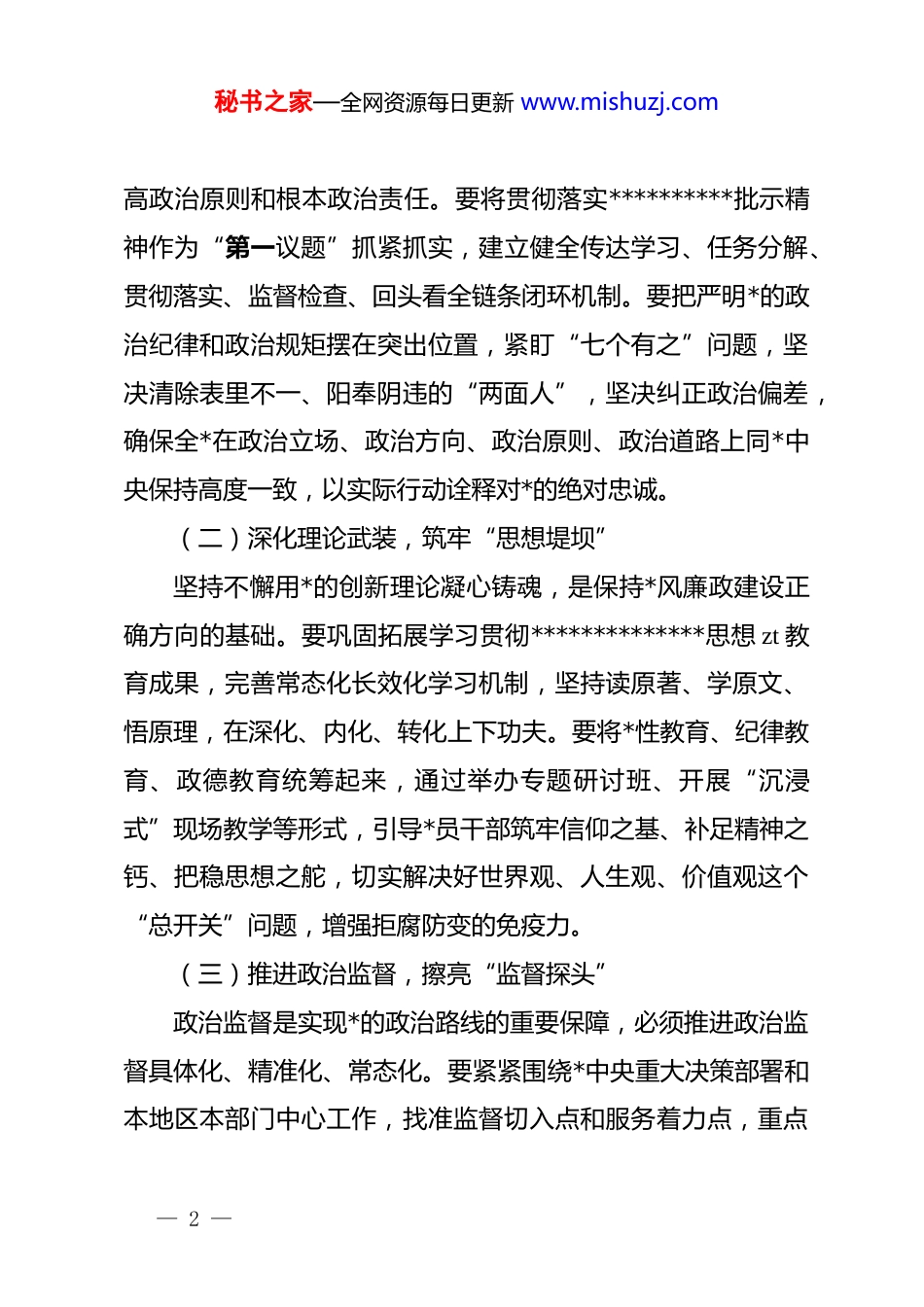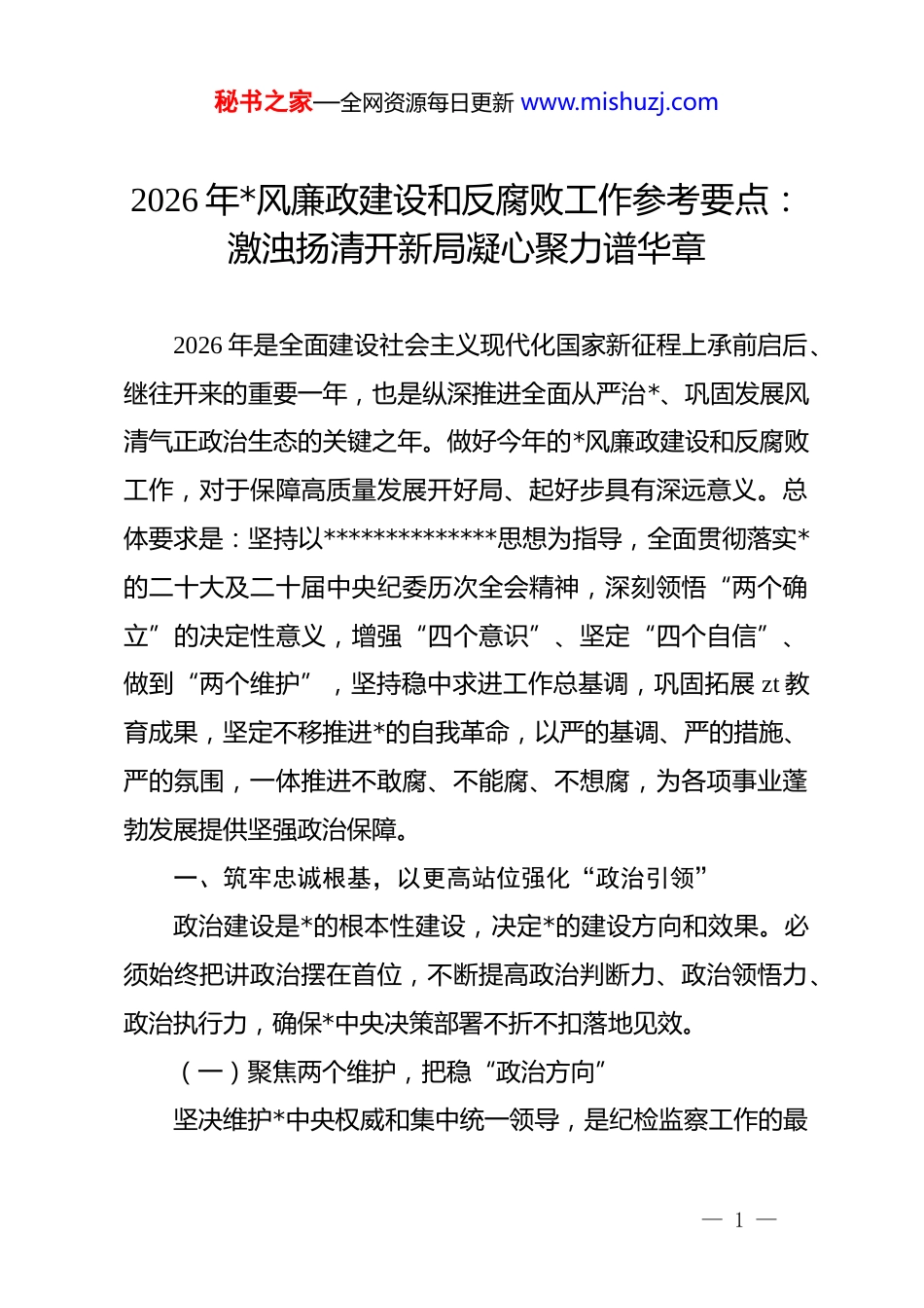 秘书之家—全网资源每日更新 www.mishuzj.com2026 年*风廉政建设和反腐败工作参考要点:激浊扬清开新局凝心聚力谱华章2026 年是全面建设社会主义现代化国家新征程上承前启后、继往开来的重要一年,也是纵深推进全面从严治*、巩固发展风清气正政治生态的关键之年。做好今年的*风廉政建设和反腐败工作,对于保障高质量发展开好局、起好步具有深远意义。总体要求是:坚持以**************思想为指导,全面贯彻落实*的二十大及二十届中央纪委历次全会精神,深刻领悟“两个确立”的决定性意义,增强“四个意识”、坚定“四个自信”、做到“两个维护”,坚持稳中求进工作总基调,巩固拓展 zt 教育成果,坚定不移推进*的自我革命,以严的基调、严的措施、严的氛围,一体推进不敢腐、不能腐、不想腐,为各项事业蓬勃发展提供坚强政治保障。一、筑牢忠诚根基,以更高站位强化“政治引领”政治建设是*的根本性建设,决定*的建设方向和效果。必须始终把讲政治摆在首位,不断提高政治判断力、政治领悟力、政治执行力,确保*中央决策部署不折不扣落地见效。(一)聚焦两个维护,把稳“政治方向”坚决维护*中央权威和集中统一领导,是纪检监察工作的最— 1 —秘书之家—全网资源每日更新 www.mishuzj.com高政治原则和根本政治责任。要将贯彻落实**********批示精神作为“第一议题”抓紧抓实,建立健全传达学习、任务分解、贯彻落实、监督检查、回头看全链条闭环机制。要把严明*的政治纪律和政治规矩摆在突出位置,紧盯“七个有之”问题,坚决清除表里不一、阳奉阴违的“两面人”,坚决纠正政治偏差,确保全*在政治立场、政治方向、政治原则、政治道路上同*中央保持高度一致,以实际行动诠释对*的绝对忠诚。(二)深化理论武装,筑牢“思想堤坝”坚持不懈用*的创新理论凝心铸魂,是保持*风廉政建设正确方向的基础。要巩固拓展学习贯彻**************思想 zt 教育成果,完善常态化长效化学习机制,坚持读原著、学原文、悟原理,在深化、内化、转化上下功夫。要将*性教育、纪律教育、政德教育统筹起来,通过举办专题研讨班、开展“沉浸式”现场教学等形式,引导*员干部筑牢信仰之基、补足精神之钙、把稳思想之舵,切实解决好世界观、人生观、价值观这个“总开关”问题,增强拒腐防变的免疫力。(三)推进政治监督,擦亮“监督探头”政治监督是实现*的政治路线的重要保障,必须推进政治监督具体化、精准化、常态化。要紧紧围绕*中央重大决策部署和本地区本部门中心工作,找准监督切入点和服务着力点,重点— 2 —秘书之家—全网资源每日更新 www.mishuzj.com加强对高质量发展、重大项目建设、民生保障等关键领域的监督检查。要建立健全政治监督台账,实行清单化管理、项目化推进,通过巡视巡察、专项检查、调研督导等方式,及时发现和纠正落实过程中的温差、落差、偏差,确保政令畅通、令行禁止,把监督优势转化为治理效能。二、保持高压态势,以更严尺度深化“标本兼治”反腐败斗争形势依然严峻复杂,必须保持战略定力,永远吹冲锋号。要坚持有腐必反、有贪必肃,深化标本兼治、系统施治,在铲除腐败滋生的土壤和条件上持续发力。(一)强化震慑效应,敢于“重拳出击”坚持无禁区、全覆盖、零容忍,始终保持惩治腐败的高压态势。要紧盯重点问题、重点领域、重点对象,严查政商勾连破坏政治生态和经济发展环境问题,重点整治金融、国企、能源、医药、基建工程和招投标等权力集中、资金密集、资源富集领域的腐败。要坚持受贿行贿一起查,完善对行贿人的联合惩戒机制,加大对行贿所获不正当利益的追缴和纠正力度。对于顶风违纪、不收敛不收手的,无论职务高低、贡献大小,一律从严查处,绝不姑息迁就,坚决通过“雷霆手段”遏制增量、清除存量。(二)扎紧制度笼子,严防“权力越界”— 3 —秘书之家—全网资源每日更新 www.mishuzj.com制度是管根本、管长远的,必须强化对权力运行的制约和监督。要针对查办案件中暴露出来的管理漏洞和制度短板,深入开展“以案促改、以案促治”,做好查办案件“后半篇文章”。要全面梳理廉政风险点,动态调整权力清单和责任清单,健全工程建设、物资采...