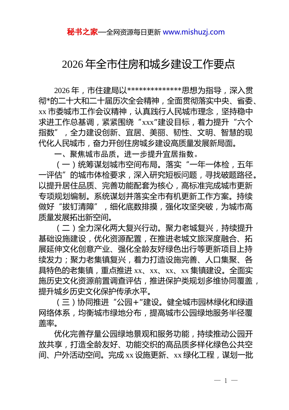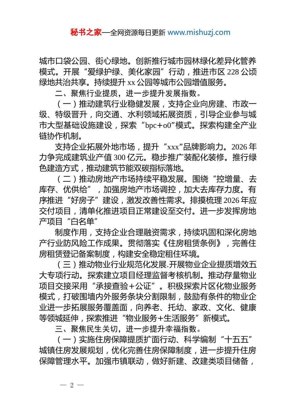 秘书之家—全网资源每日更新 www.mishuzj.com2026 年全市住房和城乡建设工作要点2026 年,市住建局以**************思想为指导,深入贯彻*的二十大和二十届历次全会精神,全面贯彻落实中央、省委、xx 市委城市工作会议精神,认真践行人民城市理念,坚持稳中求进工作总基调,紧紧围绕“xxx”建设目标,着力提升“六个指数”,全力建设创新、宜居、美丽、韧性、文明、智慧的现代化人民城市,奋力开创住房城乡建设高质量发展新局面。一、聚焦城市品质,进一步提升宜居指数。(一)统筹谋划城市空间布局。落实“一年一体检,五年一评估”的城市体检要求,深入研究短板问题,寻找破题路径。以提升居住品质、完善功能配套为核心,高标准完成城市更新专项规划编制。系统谋划并落实全市有机更新工作方案。持续做好“拔钉清障”,细化底数排摸,强化攻坚突破,为城市高质量发展拓出新空间。(二)全力深化两大复兴行动。聚力老城复兴,持续提升基础设施建设,优化资源配置,在推进老城文旅深度融合、拓展延伸文化创意产业、强化全龄友好绿色出行等更新项目上持续发力;聚力老集镇复兴,着力打造设施完善、人口集聚、各具特色的老集镇,重点推进 xx、xx、xx、xx 集镇建设。全面实施历史文化资源前置调查评估,推进保护类规划多维协同覆盖,提升城乡历史文化保护传承水平。(三)协同推进“公园+”建设。健全城市园林绿化和绿道网络体系,均衡城市绿地分布,提高城市公园绿地服务半径覆盖率。优化完善存量公园绿地景观和服务功能,持续推动公园开放共享,打造全龄友好、功能交织的高品质多样化绿色公共空间、户外活动空间。完成 xx 设施更新、xx 绿化工程,谋划一批— 1 —秘书之家—全网资源每日更新 www.mishuzj.com城市口袋公园、街心绿地。创新推行城市园林绿化差异化管养模式。开展“爱绿护绿、美化家园”行动,推进市区 228 公顷绿地共治共享。持续提升 xx 公园等城市公园增值服务。二、聚焦行业提质,进一步提升发展指数。(一)推动建筑行业稳健发展,支持企业向房建、市政一级、特级晋升,向交通、水利领域拓展资质,引导企业参与城市大型基础设施建设,探索“bpc+o0”模式。探索构建全产业链协作机制。支持企业拓展外地市场,提升“xxx”品牌影响力。2026 年力争完成建筑业产值 300 亿元。稳步推广装配化装修。推行绿色建造方式,推动建筑节能双碳指标落地。(二)推动房地产市场持续平稳发展。围绕“控增量、去库存、优供给”,加强房地产市场调控,加大去库存力度。有序推进“好房子”建设,激发改善性需求。排摸梳理 2026 年应交付项目,清单化推进项目正常建设至交付。进一步发挥房地产项目“白名单”制度作用,支持企业合理融资需求,持续巩固和深化房地产行业防风险工作成果。贯彻落实《住房租赁条例》,完善住房租赁登记备案制度,构建安全稳定租住环境。(三)推动物业行业规范化发展.开展物业企业提质增效五大专项行动。探索建立项目经理监督考核机制。推动存量物业项目交接采用“承接查验+公证”。积极探索片区化物业服务模式,打破围墙内外服务条块分割限制,鼓励有条件的物业企业进一步拓展服务覆盖面,向养老、托幼、家政、文化、健康等领城延伸,探索推进“物业服务+生活服务”新模式。三、聚焦民生关切,进一步提升幸福指数。(一)实施住房保障提质扩面行动、科学编制“十五五”城镇住房发展规划,优化完善住房保障制度,进一步提升住房保障管理水平。加强市镇联动,做好新建、改建类项目储备,— 2 —秘书之家—全网资源每日更新 www.mishuzj.com动态跟踪保租房房源出租使用,加快推动许村杭海新城保租房项目交付使用。推进收购存量已建成商品房用作保障性住房、安置房、宿舍、人才房等,加快 xxx 项目设计装修并投入使用。2026 年计划建设筹集保租房 1000 套,提升存量保租房房源租用管理。强化公共租赁住房兜底保障功能,稳步扩大农业转移及外来人口保障,创新探索 xxx 房源贯通使用,发放公租房租赁补贴2400p,实物配租 400 户。(二)实施民生实事高效推进行动。编制新一轮老旧小区综合改造计划,实施 xx、xx、xx 老旧小区...