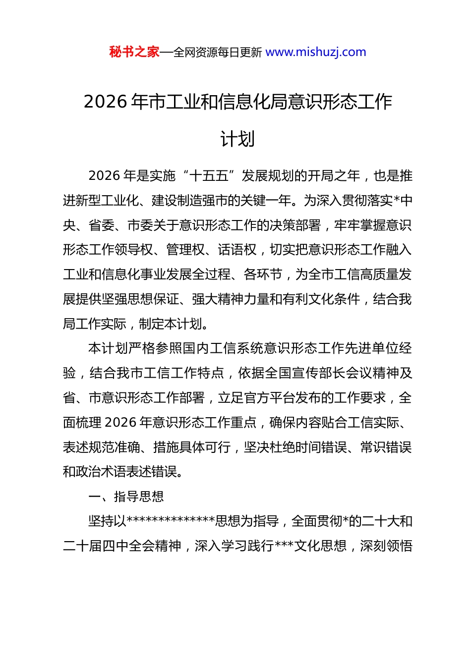 秘书之家—全网资源每日更新 www.mishuzj.com2026 年市工业和信息化局意识形态工作计划2026 年是实施“十五五”发展规划的开局之年,也是推进新型工业化、建设制造强市的关键一年。为深入贯彻落实*中央、省委、市委关于意识形态工作的决策部署,牢牢掌握意识形态工作领导权、管理权、话语权,切实把意识形态工作融入工业和信息化事业发展全过程、各环节,为全市工信高质量发展提供坚强思想保证、强大精神力量和有利文化条件,结合我局工作实际,制定本计划。本计划严格参照国内工信系统意识形态工作先进单位经验,结合我市工信工作特点,依据全国宣传部长会议精神及省、市意识形态工作部署,立足官方平台发布的工作要求,全面梳理 2026 年意识形态工作重点,确保内容贴合工信实际、表述规范准确、措施具体可行,坚决杜绝时间错误、常识错误和政治术语表述错误。一、指导思想坚持以**************思想为指导,全面贯彻*的二十大和二十届四中全会精神,深入学习践行***文化思想,深刻领悟秘书之家—全网资源每日更新 www.mishuzj.com“两个确立”的决定性意义,增强“四个意识”、坚定“四个自信”、做到“两个维护”。紧紧围绕市委、市政府中心工作和全局推进新型工业化、发展新质生产力、培育壮大先进制造业的核心任务,自觉肩负起举旗帜、聚民心、育新人、兴文化、展形象的使命任务,坚持稳中求进、守正创新,以强化理论武装为核心,以筑牢阵地防线为关键,以压实工作责任为保障,着力防范化解意识形态领域风险,着力巩固壮大主流思想舆论,着力培育弘扬工信精神,推动意识形态工作与工信业务深度融合、协同发力,为全市工业经济稳增长、产业结构优升级、数字转型促发展提供坚强意识形态支撑。二、工作目标2026 年,全局意识形态工作坚持高标准推进、高质量落实,实现“五个显著提升”,确保意识形态领域安全稳定、态势良好。(一)理论武装成效显著提升。*员干部对**************思想的政治认同、思想认同、理论认同、情感认同进一步增强,运用*的创新理论指导工信实践、破解发展难题的能力大幅提升,理论学习常态化、制度化、规范化水平持续提高。(二)责任落实效能显著提升。意识形态工作责任制全面压实,*组主体责任、书记第一责任人责任、分管领导直接责秘书之家—全网资源每日更新 www.mishuzj.com任、班子成员“一岗双责”落实到位,形成一级抓一级、层层抓落实的闭环工作格局,明责、履责、督责、问责机制更加健全。(三)阵地管理水平显著提升。各类意识形态阵地管理规范有序,信息发布审核机制严格落实,官网、政务新媒体、宣传栏等阵地导向正确、内容健康,无错误信息和不良内容传播,阵地引领作用充分发挥。(四)舆情防控能力显著提升。舆情监测、研判、处置机制更加完善,工信领域重点舆情快速响应、有效处置,网络生态治理效能持续优化,重大负面舆情得到坚决管控,全年无重大意识形态领域事件发生。(五)思想引领作用显著提升。社会主义核心价值观深入人心,工信系统干部职工思想统一、斗志昂扬,“务实担当、创新攻坚、产业报国”的工信精神广泛弘扬,企业、群众对工信工作的认可度和支持度持续提升,凝聚起推动工信事业高质量发展的强大合力。三、主要工作任务(一)深化理论铸魂工程,夯实思想根基坚持把*的创新理论学习作为意识形态工作的首要任务,结合工信工作实际,创新学习形式、丰富学习载体、强化学习实秘书之家—全网资源每日更新 www.mishuzj.com效,推动*的创新理论在工信系统入脑入心、落地生根。1. 强化核心理论学习。严格落实“第一议题”制度,将学习贯彻**************思想、******关于工业和信息化工作的重要讲话和****批示精神、******考察调研本地时的重要讲话****精神,纳入局*组理论学习中心组、机关*支部“三会一课”、主题*日核心学习内容,做到学习跟进、认识跟进、行动跟进。制定 2026 年度理论学习计划,明确学习重点、细化学习安排、严格学习要求,每月开展 1 次*组理论学习中心组集中学习研讨,每季度开展 1 次专题学习交流,机关*支部每月开展1 次集中学习、每季度开展 1 次专题研讨,推动理论学习常态化、...