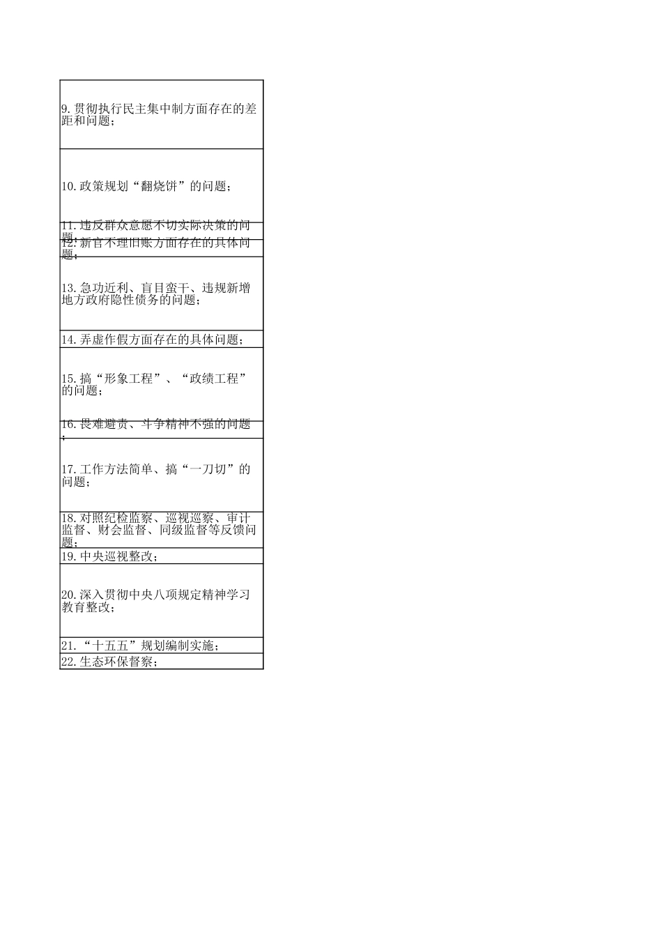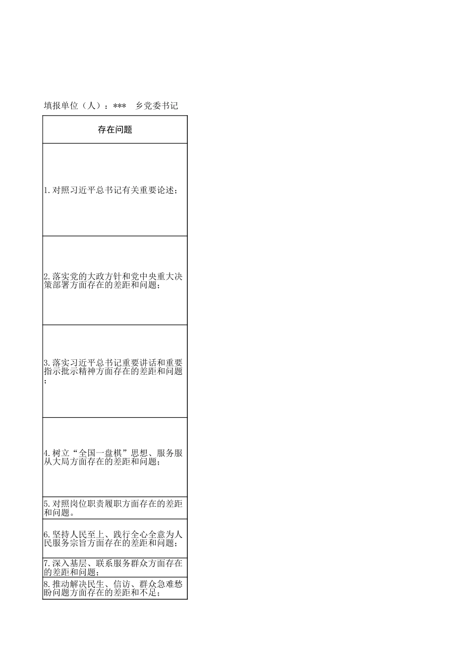 学习教育查摆问题清单存在问题填报单位(人):*** 乡党委书记 填报时间:1.对照习近平总书记有关重要论述;2.落实党的大政方针和党中央重大决策部署方面存在的差距和问题;3.落实习近平总书记重要讲话和重要指示批示精神方面存在的差距和问题;4.树立“全国一盘棋”思想、服务服从大局方面存在的差距和问题;5.对照岗位职责履职方面存在的差距和问题。6.坚持人民至上、践行全心全意为人民服务宗旨方面存在的差距和问题;7.深入基层、联系服务群众方面存在的差距和问题;8.推动解决民生、信访、群众急难愁盼问题方面存在的差距和不足;9.贯彻执行民主集中制方面存在的差距和问题;10.政策规划“翻烧饼”的问题;11.违反群众意愿不切实际决策的问题;12.新官不理旧账方面存在的具体问题;13.急功近利、盲目蛮干、违规新增地方政府隐性债务的问题;14.弄虚作假方面存在的具体问题;15.搞“形象工程”、“政绩工程”的问题;16.畏难避责、斗争精神不强的问题;17.工作方法简单、搞“一刀切”的问题;18.对照纪检监察、巡视巡察、审计监督、财会监督、同级监督等反馈问题;19.中央巡视整改;20.深入贯彻中央八项规定精神学习教育整改;21.“十五五”规划编制实施;22.生态环保督察;学习教育查摆问题清单具体表现党委书记 填报时间:1. 理论学习的深度和转化效果有待提升。班子集体学习习近平总书记相关重要论述存在“读过了、学过了”的现,但如何将其核心要义、立场观点方法精准转化为推动公司高质量发展的具体思路、工作举措和治理效能,思考不、结合不紧、招法不多。例如,在贯彻习近平总书记关于发展新质生产力的重要论述时,虽然组织了专题学习,但系统性谋划公司产业升级、技术创新路径方面,仍缺乏具有突破性的战略安排和资源倾斜,存在“上热下温”、行滞后问题。2. 对标对表的自觉性、精准性不足。在日常工作中,未能时时处处自觉以习近平总书记有关重要论述作为衡量工成效的根本标尺。例如,在推动混合所有制改革过程中,有时更多关注引入资本、完善治理结构等技术层面,对如通过混改更好坚持和加强党的全面领导、确保国有资产保值增值、服务国家战略的核心要求,理解把握不够精准,实举措不够扎实。1. 结合企业实际创造性落实有差距。对党中央关于深化国企改革、推动高质量发展等大政方针,有时存在机械传、照搬照套现象,未能紧密结合公司所处行业特点和自身发展阶段,制定出具有鲜明企业特色、可操作性强的实施案。例如,在落实创新驱动发展战略时,制定的科技创新规划与公司主营业务结合不够紧密,存在“两张皮”现象导致部分研发投入未能有效转化为市场竞争优势。2. 对决策部署的长期性、艰巨性认识不足。对一些需要久久为功、持续发力的党中央决策部署,存在急于求成或一阵风”思想。例如,在推动绿色低碳转型方面,初期部署较为积极,但在面临短期成本上升、技术路径不确定等力时,推进力度有所减弱,部分节能减排项目的长期投入和持续优化未能得到有效保障。1. 学习贯彻的系统性、穿透力不够。对习近平总书记就本行业、本领域作出的重要指示批示,虽然进行了传达学,但在向下穿透、向基层延伸、确保每一级领导干部和关键岗位人员都深刻领会、准确把握其精神实质和实践要求面,存在层层递减现象。例如,对总书记关于安全生产的重要指示,部分基层单位在落实中存在“以文件落实文件的情况,风险隐患排查治理的主动性和精细化程度仍有提升空间。2. 跟踪问效、闭环管理机制不健全。对贯彻落实总书记重要指示批示精神的情况,缺乏常态化的督查督办和效果估机制。例如,在落实某项关于产业布局的指示精神后,未能建立定期“回头看”机制,对落实过程中出现的新情、新问题研究解决不够及时,影响了落实效果的最大化。1. 局部利益与全局利益统筹不够。在谋划公司发展、争取项目资源时,有时更多从本公司、本板块的利益出发,服务国家区域协调发展战略、行业整体健康发展等大局需要的考虑不够充分。例如,在参与某跨区域重大项目时,于强调自身的经济回报和条件保障,在协同配合、让利共赢方面主动性不足。2. 对国家战略需求的响应不够主动敏锐。对中央关于保障产...