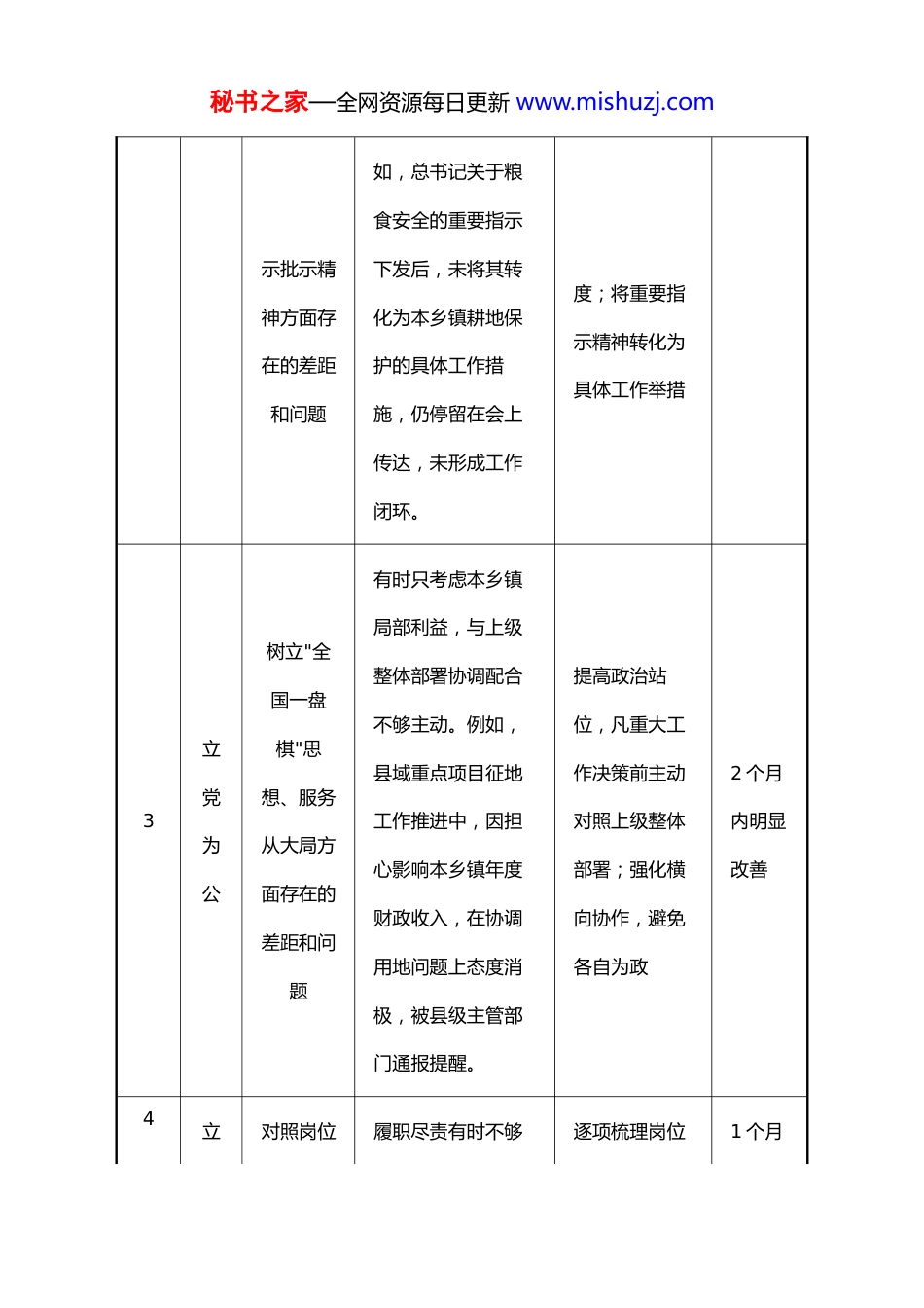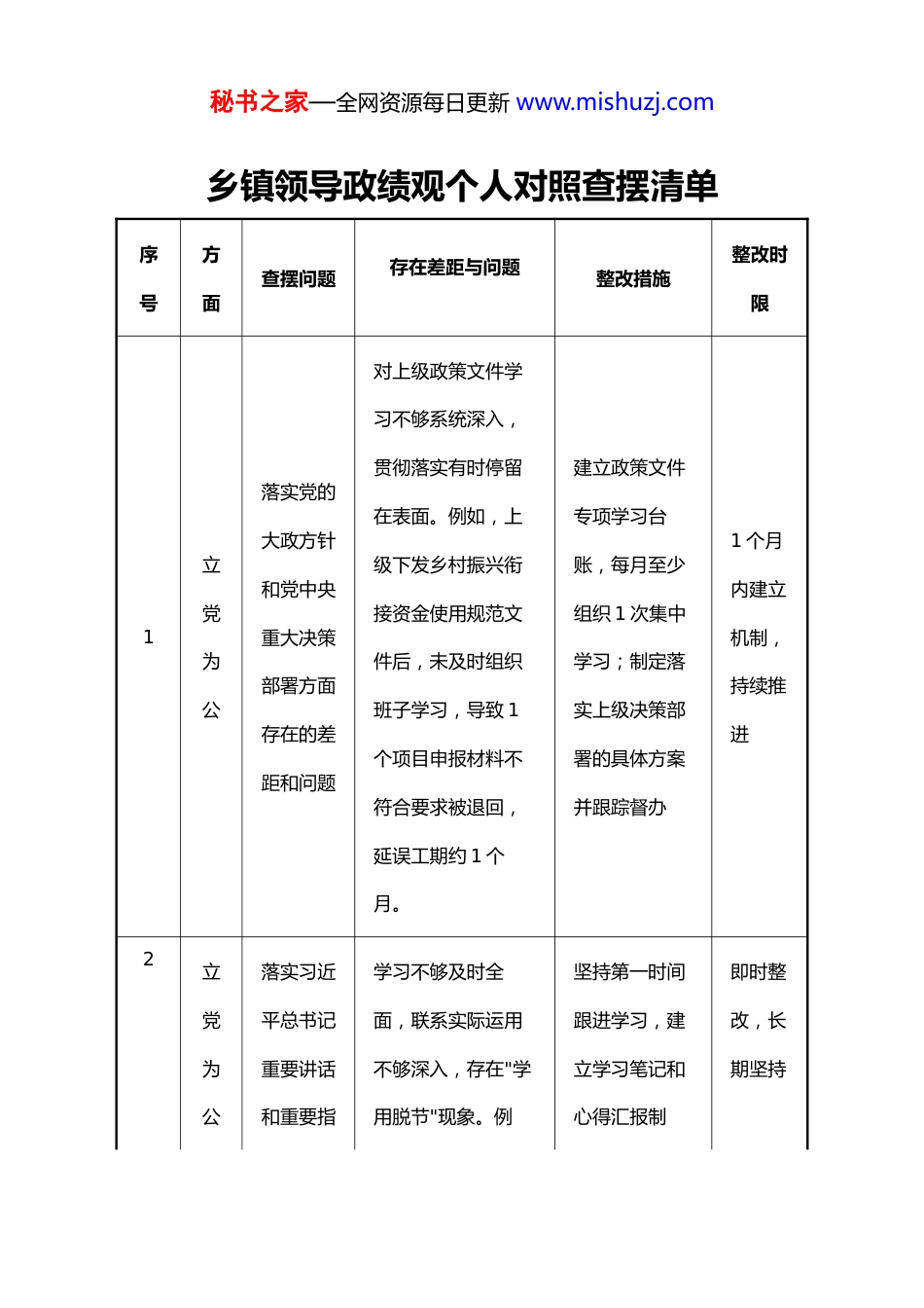 秘书之家—全网资源每日更新 www.mishuzj.com乡镇领导政绩观个人对照查摆清单序号方面查摆问题存在差距与问题整改措施整改时限1立党为公落实党的大政方针和党中央重大决策部署方面存在的差距和问题对上级政策文件学习不够系统深入,贯彻落实有时停留在表面。例如,上级下发乡村振兴衔接资金使用规范文件后,未及时组织班子学习,导致 1个项目申报材料不符合要求被退回,延误工期约 1 个月。建立政策文件专项学习台账,每月至少组织 1 次集中学习;制定落实上级决策部署的具体方案并跟踪督办1 个月内建立机制,持续推进2立党为公落实习近平总书记重要讲话和重要指学习不够及时全面,联系实际运用不够深入,存在"学用脱节"现象。例坚持第一时间跟进学习,建立学习笔记和心得汇报制即时整改,长期坚持秘书之家—全网资源每日更新 www.mishuzj.com示批示精神方面存在的差距和问题如,总书记关于粮食安全的重要指示下发后,未将其转化为本乡镇耕地保护的具体工作措施,仍停留在会上传达,未形成工作闭环。度;将重要指示精神转化为具体工作举措3立党为公树立"全国一盘棋"思想、服务从大局方面存在的差距和问题有时只考虑本乡镇局部利益,与上级整体部署协调配合不够主动。例如,县域重点项目征地工作推进中,因担心影响本乡镇年度财政收入,在协调用地问题上态度消极,被县级主管部门通报提醒。提高政治站位,凡重大工作决策前主动对照上级整体部署;强化横向协作,避免各自为政2 个月内明显改善4立对照岗位履职尽责有时不够逐项梳理岗位1 个月秘书之家—全网资源每日更新 www.mishuzj.com党为公职责履职方面存在的差距和问题精准,对重点工作跟进督导力度不足。例如,安全生产专项检查期间,因未亲自带队督导,导致辖区内 1处废弃矿坑安全隐患未被及时发现,被上级安全检查组指出。职责清单,对标落实;建立重点工作台账,定期自查履职情况内完成职责清单梳理5为民造福坚持人民至上、践行全心全意为人民服务宗旨方面存在的差距和问题有时工作出发点偏重完成任务指标,对群众实际需求回应不够及时。例如,某村反映饮水管道老化问题长达半年,因未纳入年度考核指标,一直未得到有效推动,直至群众集体上访建立群众诉求快速响应机制,每月至少开展 1 次下村入户走访,做到件件有回音1 个月内建立机制秘书之家—全网资源每日更新 www.mishuzj.com后才启动维修。6为民造福深入基层、联系服务群众方面存在的差距和问题下基层调研频次不足,与群众面对面沟通偏少,掌握基层实情不够全面。例如,因长期依赖村干部汇报,未亲自下村核实,导致对某村低保户实际生活困难情况掌握失真,年度民生资金分配出现偏差。建立定期下村制度,每月不少于 4 次深入村组;推行"民情日记"制度,如实记录群众反映问题即时整改,长期坚持7为民造福推动解决民生、信访、群众急难愁盼问题方面存在的差距和不足对信访积案化解推进力度不够,部分民生项目落地较慢。例如,辖区内1 户因宅基地纠纷引发的信访案件,已历时 2 年未彻底化解,因协调不力建立民生问题、信访问题台账,逐一明确责任人和完成时限;每月召开 1 次专题调度会2 个月内完成台账建立并推动问题化解秘书之家—全网资源每日更新 www.mishuzj.com导致当事人越级上访,造成不良影响。8科学决策贯彻执行民主集中制方面存在的差距和问题"三重一大"事项有时讨论不够充分,集体决策程序有待进一步规范。例如,某基础设施项目施工单位选定时,未严格经过班子集体研究,由个人直接拍板,事后被审计部门指出程序不规范。严格执行"三重一大"决策制度,凡重大事项必须经班子集体研究;完善会议记录存档制度1 个月内完成制度规范9科学决策政策规划"翻烧饼"的问题个别工作部署存在前后不一致、随意调整的情况,影响工作连续性。例如,乡镇产业发展规划在两年内经历加强工作谋划的系统性和前瞻性,重大政策出台前充分论证;建立政策执行跟踪评即时整改秘书之家—全网资源每日更新 www.mishuzj.com3 次大幅调整,导致已投入建设的农业园区配套设施闲置浪费,群众和企业意见较大。估机制,非必要不随意变更10科学决策违反群众意愿不切实...