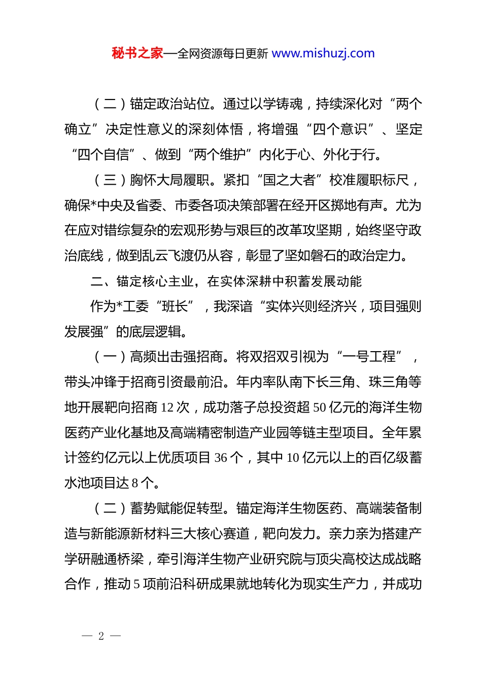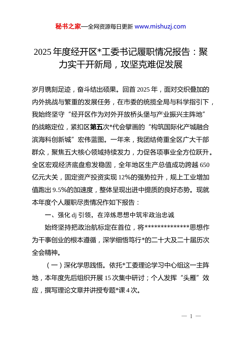 秘书之家—全网资源每日更新 www.mishuzj.com2025 年度经开区*工委书记履职情况报告:聚力实干开新局,攻坚克难促发展岁月镌刻足迹,奋斗结出硕果。回首 2025 年,面对交织叠加的内外挑战与繁重的发展任务,在市委的统揽全局与科学指引下,我始终坚守“经开区作为对外开放桥头堡与产业振兴主阵地”的战略定位,紧扣区第五次*代会擘画的“构筑国际化产城融合滨海科创新城”宏伟蓝图。一年来,我团结倚重全区广大干部群众,聚焦五大核心领域持续发力,力促各项事业全方位跃升。全区宏观经济底盘愈发稳固,全年地区生产总值成功跨越 650亿元大关,固定资产投资实现 12%的强势拉升,规上工业增加值跑出 9.5%的加速度,整体呈现出进中提质的良好态势。现就本年度个人履职尽责情况作如下报告:一、强化 dj 引领,在淬炼思想中筑牢政治忠诚始终坚持把政治航标定在首位,将**************思想作为干事创业的根本遵循,深学细悟笃行*的二十大及二十届历次全会精神。(一)深化学思践悟。依托*工委理论学习中心组这一主阵地,本年度先后组织开展 15 次集中研讨;个人发挥“头雁”效应,撰写理论文章并讲授专题*课 4 次。— 1 —秘书之家—全网资源每日更新 www.mishuzj.com(二)锚定政治站位。通过以学铸魂,持续深化对“两个确立”决定性意义的深刻体悟,将增强“四个意识”、坚定“四个自信”、做到“两个维护”内化于心、外化于行。(三)胸怀大局履职。紧扣“国之大者”校准履职标尺,确保*中央及省委、市委各项决策部署在经开区掷地有声。尤为在应对错综复杂的宏观形势与艰巨的改革攻坚期,始终坚守政治底线,做到乱云飞渡仍从容,彰显了坚如磐石的政治定力。二、锚定核心主业,在实体深耕中积蓄发展动能作为*工委“班长”,我深谙“实体兴则经济兴,项目强则发展强”的底层逻辑。(一)高频出击强招商。将双招双引视为“一号工程”,带头冲锋于招商引资最前沿。年内率队南下长三角、珠三角等地开展靶向招商 12 次,成功落子总投资超 50 亿元的海洋生物医药产业化基地及高端精密制造产业园等链主型项目。全年累计签约亿元以上优质项目 36 个,其中 10 亿元以上的百亿级蓄水池项目达 8 个。(二)蓄势赋能促转型。锚定海洋生物医药、高端装备制造与新能源新材料三大核心赛道,靶向发力。亲力亲为搭建产学研融通桥梁,牵引海洋生物产业研究院与顶尖高校达成战略合作,推动 5 项前沿科研成果就地转化为现实生产力,并成功— 2 —秘书之家—全网资源每日更新 www.mishuzj.com孵化培育省级以上专精特新企业 11 家。(三)下沉一线优环境。牢固树立“项目为王”理念,创新推行“周度会商、月度亮屏”的闭环推进机制。常态化直奔项目建设现场“解剖麻雀”,精准破解滨海新材料产业园三期建设中的土地要素保障、能耗双控指标等掣肘难题,强力拉动省市两级重点项目年度投资完成率飙升至 110%以上。三、坚持双轮驱动,在产城共建中涵养宜居生态始终笃定产城融合是迈向高质量发展的必由之路,坚持产业升级与城市能级跃升同频共振。(一)织密基础设施网络。挂帅出征城建主战场,强势推进滨海大道扩容提质、智慧物流园服务配套等 10 项标杆性工程。全力拔除城市交通梗阻,打通城市“断头路”3 条;深化地下管网攻坚,铺设及改造污水管网 15 公里,有效提升城市承载力。(二)厚植民生福祉底色。坚守为民初心,确保一般性公共预算支出向民生领域倾斜力度稳居 80%以上。提速兑现民生承诺,保障开发区第一小学扩建工程、街道社区卫生服务中心提档升级等 6 个重点民生实事项目圆满收官,为辖区群众实质性新增优质学位 1200 个、医养结合床位 200 张。(三)精细涵养公共服务。围绕“全龄友好型”社会构建目标,深耕细作“15 分钟生活圈”辐射效能。年内高标准建成— 3 —秘书之家—全网资源每日更新 www.mishuzj.com社区微绿地与口袋公园 2 处,以微更新撬动大民生,让辖区群众的获得感与幸福感成色更足、更加充实。四、树牢底线意识,在除险保安中夯实善治根基发展决不能以牺牲安全为代价。我时刻保持如履薄冰的警醒,向科技借力,向基层赋能,全...