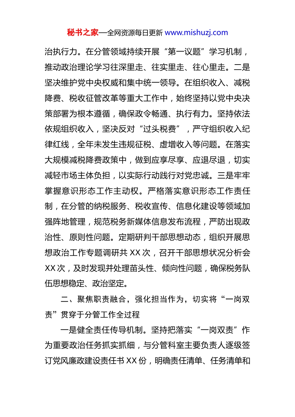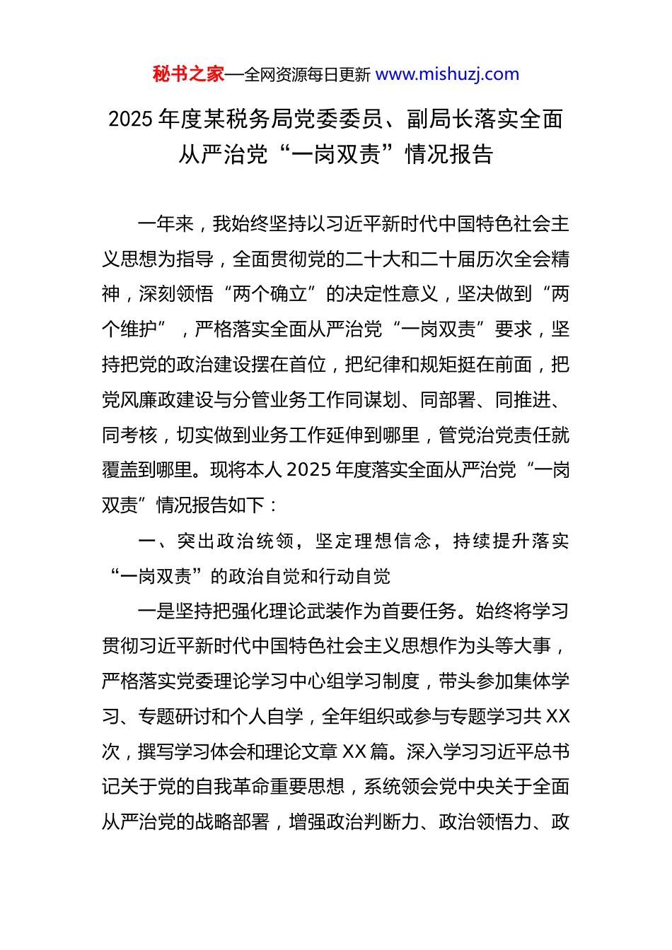 秘书之家—全网资源每日更新 www.mishuzj.com2025 年度某税务局党委委员、副局长落实全面从严治党“一岗双责”情况报告 一年来,我始终坚持以习近平新时代中国特色社会主义思想为指导,全面贯彻党的二十大和二十届历次全会精神,深刻领悟“两个确立”的决定性意义,坚决做到“两个维护”,严格落实全面从严治党“一岗双责”要求,坚持把党的政治建设摆在首位,把纪律和规矩挺在前面,把党风廉政建设与分管业务工作同谋划、同部署、同推进、同考核,切实做到业务工作延伸到哪里,管党治党责任就覆盖到哪里。现将本人 2025 年度落实全面从严治党“一岗双责”情况报告如下:一、突出政治统领,坚定理想信念,持续提升落实“一岗双责”的政治自觉和行动自觉一是坚持把强化理论武装作为首要任务。始终将学习贯彻习近平新时代中国特色社会主义思想作为头等大事,严格落实党委理论学习中心组学习制度,带头参加集体学习、专题研讨和个人自学,全年组织或参与专题学习共 XX次,撰写学习体会和理论文章 XX 篇。深入学习习近平总书记关于党的自我革命重要思想,系统领会党中央关于全面从严治党的战略部署,增强政治判断力、政治领悟力、政秘书之家—全网资源每日更新 www.mishuzj.com治执行力。在分管领域持续开展“第一议题”学习机制,推动政治理论学习往深里走、往实里走、往心里走。二是坚决维护党中央权威和集中统一领导。在组织收入、减税降费、税收征管改革等重大工作中,始终坚持以党中央决策部署为根本遵循,确保政令畅通、执行有力。坚持依法依规组织收入,坚决反对“过头税费”,严守组织收入纪律红线,全年未发生违规征税、虚增收入等问题。在落实大规模减税降费政策中,做到应享尽享、应退尽退,切实减轻市场主体负担,以实际行动践行对党忠诚。三是牢牢掌握意识形态工作主动权。严格落实意识形态工作责任制,在分管的纳税服务、税收宣传、信息化建设等领域加强阵地管理,规范税务新媒体信息发布流程,严防出现政治性、原则性问题。定期研判干部思想动态,组织开展思想政治工作专题调研共 XX 次,召开干部思想状况分析会XX 次,及时发现并处理苗头性、倾向性问题,确保税务队伍思想稳定、政治坚定。二、聚焦职责融合,强化担当作为,切实将“一岗双责”贯穿于分管工作全过程一是健全责任传导机制。坚持把落实“一岗双责”作为重要政治任务抓实抓细,与分管科室主要负责人逐级签订党风廉政建设责任书 XX 份,明确责任清单、任务清单和秘书之家—全网资源每日更新 www.mishuzj.com负面清单,形成横向到边、纵向到底的责任体系。全年主持召开分管领域党风廉政建设专题会议 XX 次,听取工作汇报 XX 次,及时研究解决重点难点问题。坚持将党风廉政建设纳入分管工作年度计划和绩效考核,实现与业务工作同部署、同检查、同考评。二是完善制度约束体系。聚焦税收执法权、审批权、资金使用权等关键环节,推动修订完善内部控制制度 XX 项,涵盖发票管理、退税审核、信息化项目管理、政府采购等方面,切实扎紧制度笼子。在纳税服务领域,持续优化“非接触式”办税流程,推行“承诺制”容缺办理和“智能导办+人工辅导”双轮驱动模式,有效减少自由裁量空间,防范服务风险。在项目建设中严格执行“三重一大”决策程序,全面落实公开招标、过程监督、绩效评价等机制,确保权力在阳光下运行。三是深化廉政风险防控。组织分管部门全面开展廉政风险点再排查再梳理,共识别高、中、低等级风险点 XX 个,制定防控措施 XX 条,建立动态更新机制。对发票代开、留抵退税、税务稽查等高风险岗位实行定期轮岗和交叉复核制度,全年实施岗位交流 XX 人次,有效防范廉政风险集聚。加强对第三方技术服务商的监督管理,建立服务质量评价和廉洁承诺机制,防止利益输送和权力寻租。三、严抓作风建设,强化纪律约束,不断涵养风清气秘书之家—全网资源每日更新 www.mishuzj.com正的政治生态一是驰而不息纠治“四风”。坚决贯彻落实纪律规定及其要求,紧盯元旦、春节、中秋、国庆等重要节点,开展廉洁提醒和专项检查 XX 次,发布廉政提示信息 XX 条,做到早提醒、早预防。坚决整...