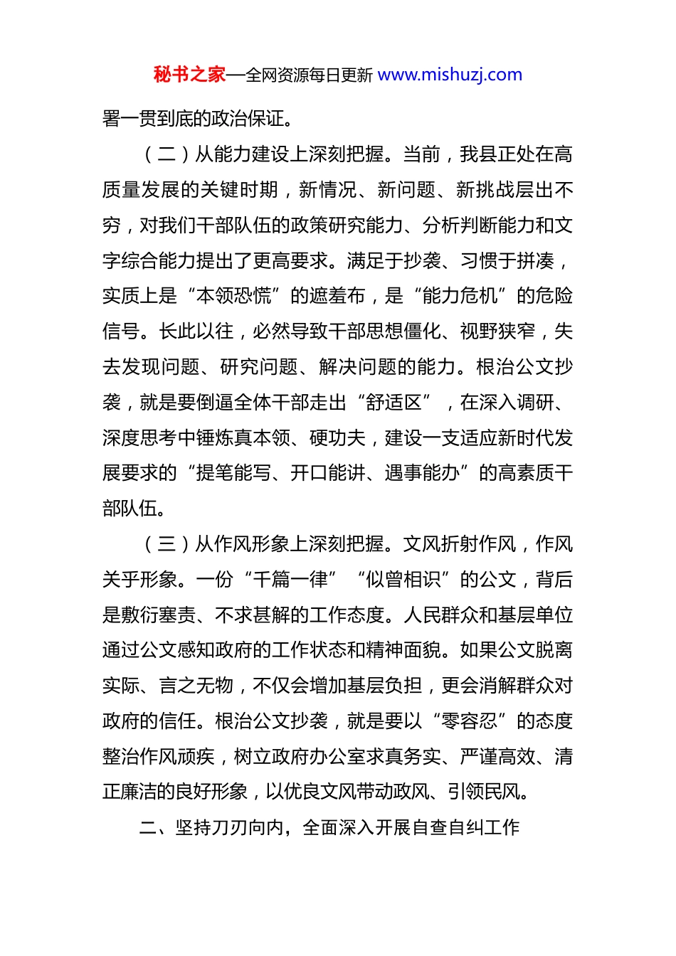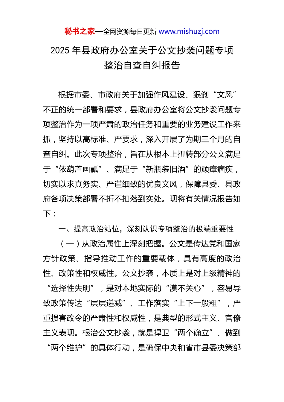 秘书之家—全网资源每日更新 www.mishuzj.com2025 年县政府办公室关于公文抄袭问题专项整治自查自纠报告 根据市委、市政府关于加强作风建设、狠刹“文风”不正的统一部署和要求,县政府办公室将公文抄袭问题专项整治作为一项严肃的政治任务和重要的业务建设工作来抓,坚持以高标准、严要求,深入开展了为期三个月的自查自纠。此次专项整治,旨在从根本上扭转部分公文满足于“依葫芦画瓢”、满足于“新瓶装旧酒”的顽瘴痼疾,切实以求真务实、严谨细致的优良文风,保障县委、县政府各项决策部署不折不扣落到实处。现将有关情况报告如下:一、提高政治站位,深刻认识专项整治的极端重要性(一)从政治属性上深刻把握。公文是传达党和国家方针政策、指导推动工作的重要载体,具有高度的政治性、政策性和权威性。公文抄袭,本质上是对上级精神的“选择性失明”,是对本地实际的“漠不关心”,容易导致政策传达“层层递减”、工作落实“上下一般粗”,严重损害政令的严肃性和权威性,是典型的形式主义、官僚主义表现。根治公文抄袭,就是捍卫“两个确立”、做到“两个维护”的具体行动,是确保中央和省市县委决策部秘书之家—全网资源每日更新 www.mishuzj.com署一贯到底的政治保证。(二)从能力建设上深刻把握。当前,我县正处在高质量发展的关键时期,新情况、新问题、新挑战层出不穷,对我们干部队伍的政策研究能力、分析判断能力和文字综合能力提出了更高要求。满足于抄袭、习惯于拼凑,实质上是“本领恐慌”的遮羞布,是“能力危机”的危险信号。长此以往,必然导致干部思想僵化、视野狭窄,失去发现问题、研究问题、解决问题的能力。根治公文抄袭,就是要倒逼全体干部走出“舒适区”,在深入调研、深度思考中锤炼真本领、硬功夫,建设一支适应新时代发展要求的“提笔能写、开口能讲、遇事能办”的高素质干部队伍。(三)从作风形象上深刻把握。文风折射作风,作风关乎形象。一份“千篇一律”“似曾相识”的公文,背后是敷衍塞责、不求甚解的工作态度。人民群众和基层单位通过公文感知政府的工作状态和精神面貌。如果公文脱离实际、言之无物,不仅会增加基层负担,更会消解群众对政府的信任。根治公文抄袭,就是要以“零容忍”的态度整治作风顽疾,树立政府办公室求真务实、严谨高效、清正廉洁的良好形象,以优良文风带动政风、引领民风。二、坚持刀刃向内,全面深入开展自查自纠工作秘书之家—全网资源每日更新 www.mishuzj.com(一)强化组织领导,压实工作责任。一是成立了由县政府办公室主任任组长,各分管副主任任副组长,各科室(中心)负责人为成员的专项整治工作领导小组,下设工作专班,负责具体组织实施、督促检查。二是制定了详尽的《县政府办公室公文抄袭问题专项整治工作方案》,明确了自查的阶段、范围、标准和责任追究办法,将责任层层分解,落实到岗、压实到人,形成了“一把手”负总责、分管领导具体抓、各科室负责人直接管、全体干部人人参与的工作格局。(二)明确排查范围,确保全面覆盖。此次自查范围涵盖了 2023 年以来县政府办公室起草、审核、印发的各类公文,重点聚焦工作计划、总结报告、领导讲话、调研报告、实施方案等综合性文稿。我们采取“科室自查、分管领导复核、专班抽查”三级排查机制,共计对近两年来的XX 余份文件进行了逐一梳理。其中,科室自查覆盖率达到100%,专班重点抽查了 XX 余份,确保了排查工作的广度与深度。(三)创新核查方式,提升甄别精度。为破解抄袭行为隐蔽性强、甄别难度大的问题,我们采取了“技术筛查+人工比对”相结合的方式。一是引入专业文本查重系统,对所有电子版文稿进行技术比对,初步筛查出重复率偏高秘书之家—全网资源每日更新 www.mishuzj.com的“问题线索”文稿。二是组织业务骨干成立文稿审核小组,对技术筛查出的文稿进行人工精细比对,不仅比对文字重复,更注重比对思路框架、核心观点和对策举措的雷同情况,综合判断是否存在抄袭、套用现象。通过这一方式,共甄别出存在不同程度套改、拼凑现象的文稿 XX 份。三、聚焦突出问题,深刻剖析问题产生的根源(一)思想认识存在偏差,惰性思维作...