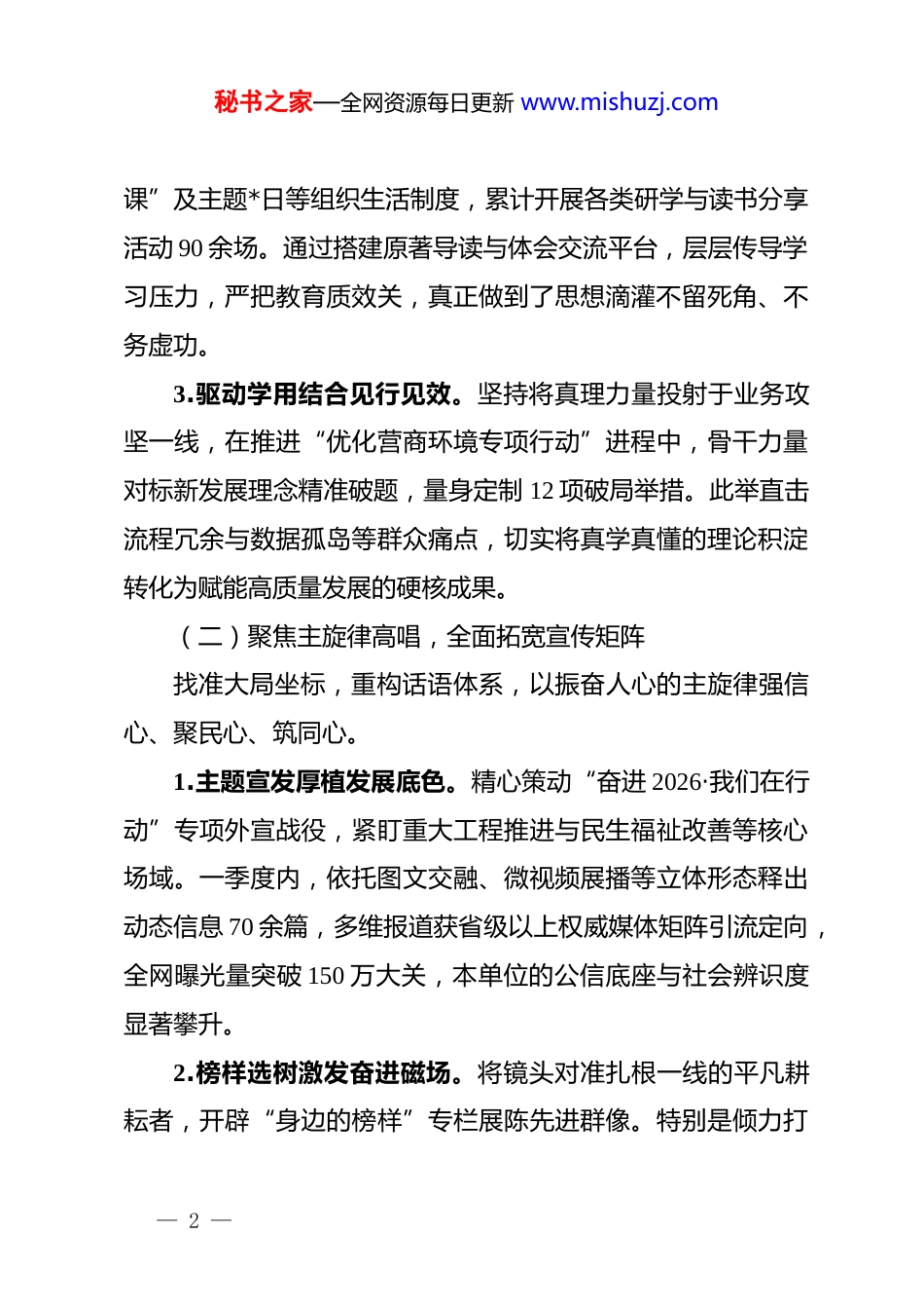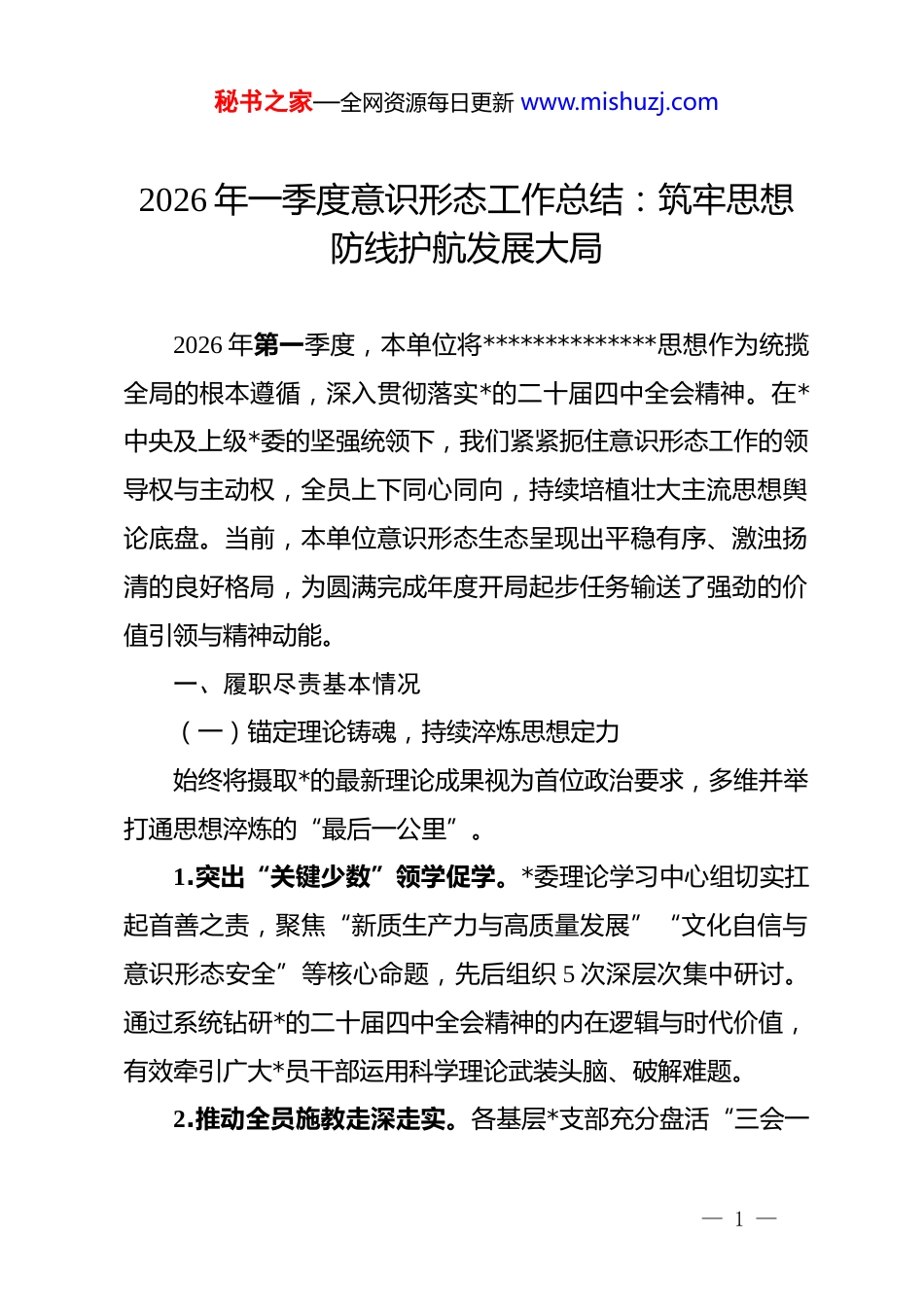 秘书之家—全网资源每日更新 www.mishuzj.com2026 年一季度意识形态工作总结:筑牢思想防线护航发展大局2026 年第一季度,本单位将**************思想作为统揽全局的根本遵循,深入贯彻落实*的二十届四中全会精神。在*中央及上级*委的坚强统领下,我们紧紧扼住意识形态工作的领导权与主动权,全员上下同心同向,持续培植壮大主流思想舆论底盘。当前,本单位意识形态生态呈现出平稳有序、激浊扬清的良好格局,为圆满完成年度开局起步任务输送了强劲的价值引领与精神动能。一、履职尽责基本情况(一)锚定理论铸魂,持续淬炼思想定力始终将摄取*的最新理论成果视为首位政治要求,多维并举打通思想淬炼的“最后一公里”。1.突出“关键少数”领学促学。*委理论学习中心组切实扛起首善之责,聚焦“新质生产力与高质量发展”“文化自信与意识形态安全”等核心命题,先后组织 5 次深层次集中研讨。通过系统钻研*的二十届四中全会精神的内在逻辑与时代价值,有效牵引广大*员干部运用科学理论武装头脑、破解难题。2.推动全员施教走深走实。各基层*支部充分盘活“三会一— 1 —秘书之家—全网资源每日更新 www.mishuzj.com课”及主题*日等组织生活制度,累计开展各类研学与读书分享活动 90 余场。通过搭建原著导读与体会交流平台,层层传导学习压力,严把教育质效关,真正做到了思想滴灌不留死角、不务虚功。3.驱动学用结合见行见效。坚持将真理力量投射于业务攻坚一线,在推进“优化营商环境专项行动”进程中,骨干力量对标新发展理念精准破题,量身定制 12 项破局举措。此举直击流程冗余与数据孤岛等群众痛点,切实将真学真懂的理论积淀转化为赋能高质量发展的硬核成果。(二)聚焦主旋律高唱,全面拓宽宣传矩阵找准大局坐标,重构话语体系,以振奋人心的主旋律强信心、聚民心、筑同心。1.主题宣发厚植发展底色。精心策动“奋进 2026·我们在行动”专项外宣战役,紧盯重大工程推进与民生福祉改善等核心场域。一季度内,依托图文交融、微视频展播等立体形态释出动态信息 70 余篇,多维报道获省级以上权威媒体矩阵引流定向,全网曝光量突破 150 万大关,本单位的公信底座与社会辨识度显著攀升。2.榜样选树激发奋进磁场。将镜头对准扎根一线的平凡耕耘者,开辟“身边的榜样”专栏展陈先进群像。特别是倾力打— 2 —秘书之家—全网资源每日更新 www.mishuzj.com造的纪实微视频《初心》,在内网生态中斩获超 10 万次点播浏览。用鲜活事迹唤醒初心使命,强力引爆了全体人员建功立业的先锋意识与担当情怀。3.舆论场域掌控精准高效。面对公众聚焦的民生敏感议题,严格遵循信息披露规范,依托官方端口实现权威定调。同步抽调业务精干力量跟进政策释疑,第一时间剥离模糊认知,纾解社会疑虑,在互动博弈中稳稳锚定主导权,涵养了风清气正的外部环境。(三)严密阵地防线,构筑坚不可摧的安全堡垒秉持底线思维,落实严管基调,全方位扫除风险盲区,坚决捍卫意识形态绝对安全。1.织密数字空间管控网。将网络意识形态工作责任制视为铁律,对门户网站与官微等发声窗口全面上紧“三审三校”制度发条。首季安全过滤并发布各类资讯 300 余条,实现内容差错“零容忍”。并行推进媒介素养培育,组织开展 2 期网络安全攻防实训,有效升级了全员的数字安全免疫力。2.扎牢实体活动防火墙。针对讲坛、沙龙、学术报告等线下思想交汇场所,实施全口径报备前置审查。一季度严审把关内部集会 18 场次,坚决斩断任何错误思潮的渗透链路,确保所有发声渠道基调昂扬、政治标尺不偏。— 3 —秘书之家—全网资源每日更新 www.mishuzj.com3.夯实齐抓共管基本盘。岁首即向各业务序列及下属机构制发《2026 年度意识形态工作责任书》进行契约化管理。将其作为干部政治画像与年度实绩检验的硬指标,理顺了*委统揽、条块联动、协同发力的治理逻辑,促使各项防御管控指令直达末端。二、当前管网治网与思想淬炼面临的隐患挑战在检视工作成效的同时,我们必须警醒,当前意识形态斗争的复杂性依然存在,部分短板弱项亟待定点清创。一是多元思潮暗流涌动,思想定力遭遇隐形冲击。伴随算法推荐与去中心...