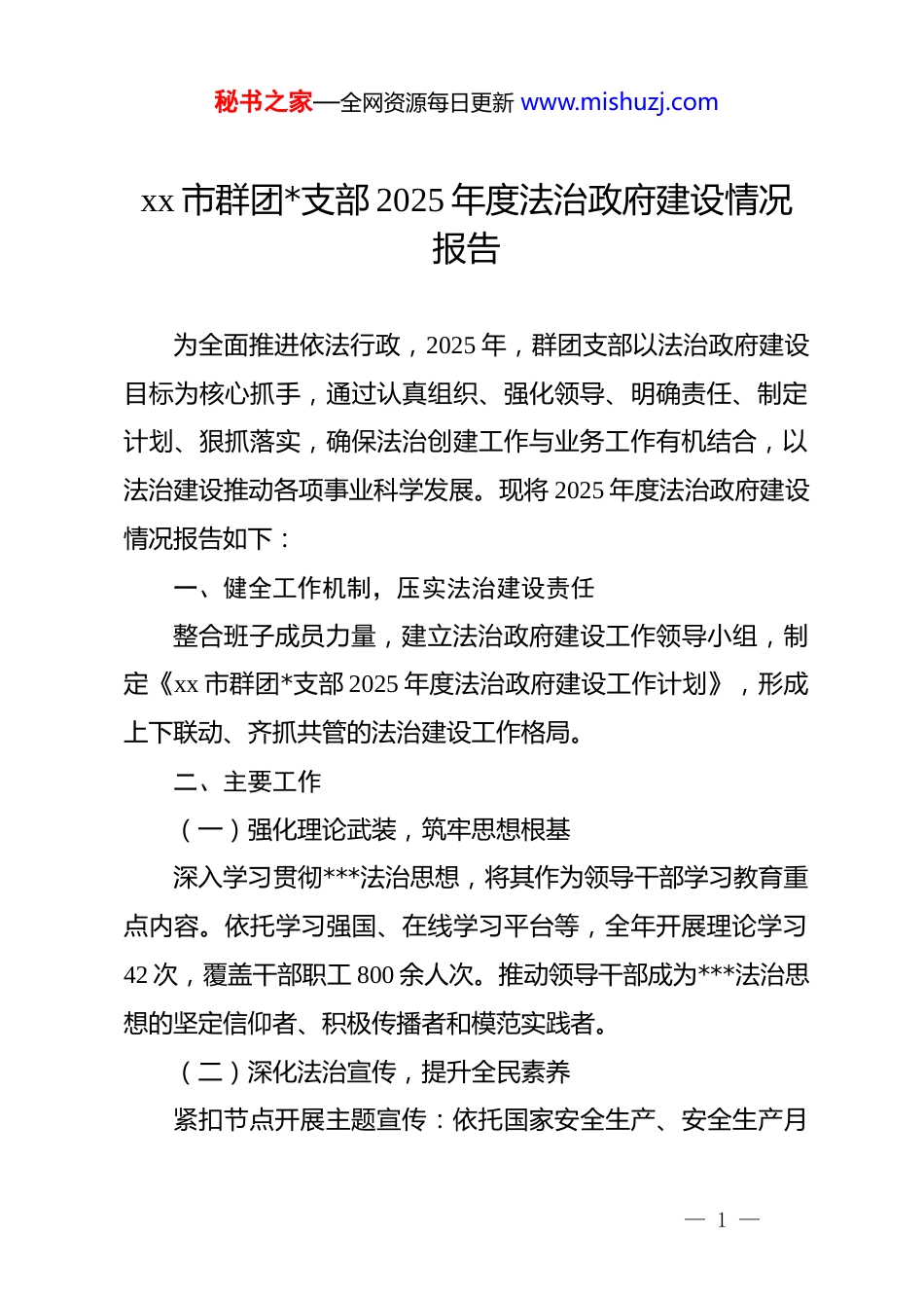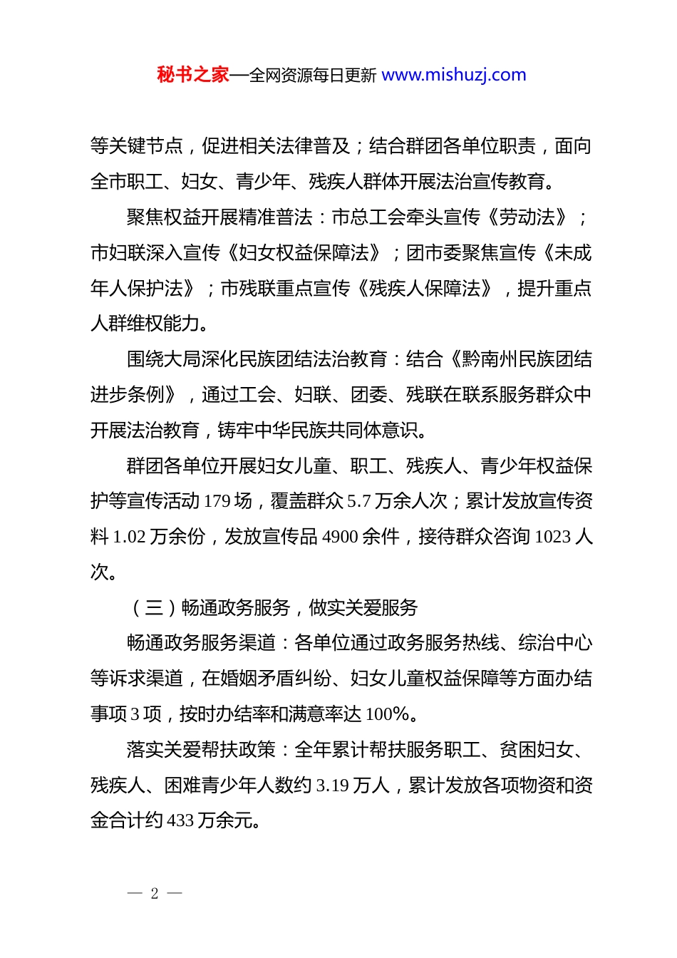 秘书之家—全网资源每日更新 www.mishuzj.comxx 市群团*支部 2025 年度法治政府建设情况报告为全面推进依法行政,2025 年,群团支部以法治政府建设目标为核心抓手,通过认真组织、强化领导、明确责任、制定计划、狠抓落实,确保法治创建工作与业务工作有机结合,以法治建设推动各项事业科学发展。现将 2025 年度法治政府建设情况报告如下:一、健全工作机制,压实法治建设责任整合班子成员力量,建立法治政府建设工作领导小组,制定《xx 市群团*支部 2025 年度法治政府建设工作计划》,形成上下联动、齐抓共管的法治建设工作格局。二、主要工作(一)强化理论武装,筑牢思想根基深入学习贯彻***法治思想,将其作为领导干部学习教育重点内容。依托学习强国、在线学习平台等,全年开展理论学习42 次,覆盖干部职工 800 余人次。推动领导干部成为***法治思想的坚定信仰者、积极传播者和模范实践者。(二)深化法治宣传,提升全民素养紧扣节点开展主题宣传:依托国家安全生产、安全生产月— 1 —秘书之家—全网资源每日更新 www.mishuzj.com等关键节点,促进相关法律普及;结合群团各单位职责,面向全市职工、妇女、青少年、残疾人群体开展法治宣传教育。聚焦权益开展精准普法:市总工会牵头宣传《劳动法》;市妇联深入宣传《妇女权益保障法》;团市委聚焦宣传《未成年人保护法》;市残联重点宣传《残疾人保障法》,提升重点人群维权能力。围绕大局深化民族团结法治教育:结合《黔南州民族团结进步条例》,通过工会、妇联、团委、残联在联系服务群众中开展法治教育,铸牢中华民族共同体意识。群团各单位开展妇女儿童、职工、残疾人、青少年权益保护等宣传活动 179 场,覆盖群众 5.7 万余人次;累计发放宣传资料 1.02 万余份,发放宣传品 4900 余件,接待群众咨询 1023 人次。(三)畅通政务服务,做实关爱服务畅通政务服务渠道:各单位通过政务服务热线、综治中心等诉求渠道,在婚姻矛盾纠纷、妇女儿童权益保障等方面办结事项 3 项,按时办结率和满意率达 100%。落实关爱帮扶政策:全年累计帮扶服务职工、贫困妇女、残疾人、困难青少年人数约 3.19 万人,累计发放各项物资和资金合计约 433 万余元。— 2 —秘书之家—全网资源每日更新 www.mishuzj.com(四)加强*内学习,严明纪律规矩重点学习《*章》《中国共产*廉洁自律准则》《中国共产dj 律处分条例》《中国共产*问责条例》《中国共产**内监督条例》《关于新形势下*内政治生活的若干准则》等*内法规,增强纪律意识和规矩意识。全年开展学习 21 次,覆盖*员干部职工 100 余人次。三、存在的不足及下一步工作方向(一)存在的不足重视程度有待提高,工作实效有待增强:法治政府创建工作推进不均衡,部分单位对普法工作重视不足,工作措施落实不到位,存在流于形式现象;学法用法与法治实践结合不紧,法治教育内容与实际工作需求衔接不紧密,存在脱节情况,影响宣传教育实际效果。工作力量相对不足,统筹协调有待加强:普法工作涉及面广、任务繁重,现有工作力量与任务量不匹配,导致工作中统筹不足、重点不突出;受人员力量限制,存在顾此失彼现象,普法整体质量和效果待提升。工作机制不够完善,协同推进有待强化:跨部门、跨领域协作机制不够健全,联动开展法治建设工作的合力不足;部分工作流程和制度执行存在短板,影响工作质效。— 3 —秘书之家—全网资源每日更新 www.mishuzj.com(二)下一步工作方向解决思想认识和工作实效问题:将普法工作作为基础性、常态化工作抓实抓细,杜绝应付心态;梳理总结过往普法经验,开展群众喜闻乐见的宣传活动,确保法治教育不走场。解决力量不足和统筹难题:紧跟司法局等部门工作节奏,配合做好宣传发动与组织落实;遇大型活动或复杂法律问题,邀请法律顾问、司法人员及志愿者参与,弥补专业和人手不足,实现分工协作、高效推进。解决学用脱节问题:宣传内容聚焦婚姻家庭、邻里纠纷权益保障等实际问题,用通俗易懂语言讲解法律,让群众觉得法律管用,营造办事依法、遇事找法、解决问题用法、化解矛盾靠法的良好氛围。健全工作机制,强化协同联动...