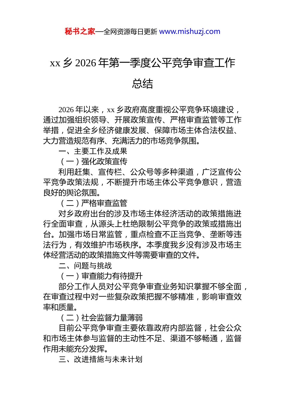 秘书之家—全网资源每日更新 www.mishuzj.comxx 乡 2026 年第一季度公平竞争审查工作总结2026 年以来,xx 乡政府高度重视公平竞争环境建设,通过加强组织领导、开展政策宣传、严格审查监管等工作举措,促进全乡经济健康发展、保障市场主体合法权益、大力营造规范有序、充满活力的市场竞争氛围。一、主要工作及成果(一)强化政策宣传利用赶集、宣传栏、公众号等多种渠道,广泛宣传公平竞争政策法规,不断提升市场主体公平竞争意识,营造良好的舆论氛围。(二)严格审查监管对乡政府出台的涉及市场主体经济活动的政策措施进行全面审查,从源头上杜绝限制公平竞争的政策或措施出台。加强市场日常监管,重点检查不正当竞争、垄断等违法行为,有效维护市场秩序。本季度我乡没有涉及市场主体经营活动的政策措施文件等需要审查的文件。二、问题与挑战(一)审查能力有待提升部分工作人员对公平竞争审查业务知识掌握不够全面,在审查过程中对一些复杂政策把握不够精准,影响审查效率和质量。(二)社会监督力量薄弱目前公平竞争审查主要依靠政府内部监督,社会公众和市场主体参与监督的主动性不足、渠道不够畅通,监督作用未能充分发挥。三、改进措施与未来计划秘书之家—全网资源每日更新 www.mishuzj.com(一)加强业务培训。定期组织工作人员参加公平竞争审查业务培训,邀请专家授课,开展案例分析研讨,不断提高工作人员审查能力和水平。(二)拓宽监督渠道。建立健全公平竞争审查投诉举报受理回应机制,在乡政务服务中心设立投诉举报窗口,同时开通线上举报渠道,鼓励社会公众和市场主体积极参与监督。(三)深化审查工作。持续推进公平竞争审查工作,对存量政策措施进行定期核查清理,确保市场公平竞争环境长期稳定;加强与上级部门和其他乡镇沟通交流,学习先进经验,不断完善工作机制。 xx 市 xx 区 xx 乡人民政府 2026 年 3 月 9 日