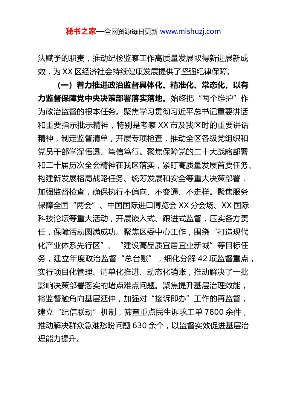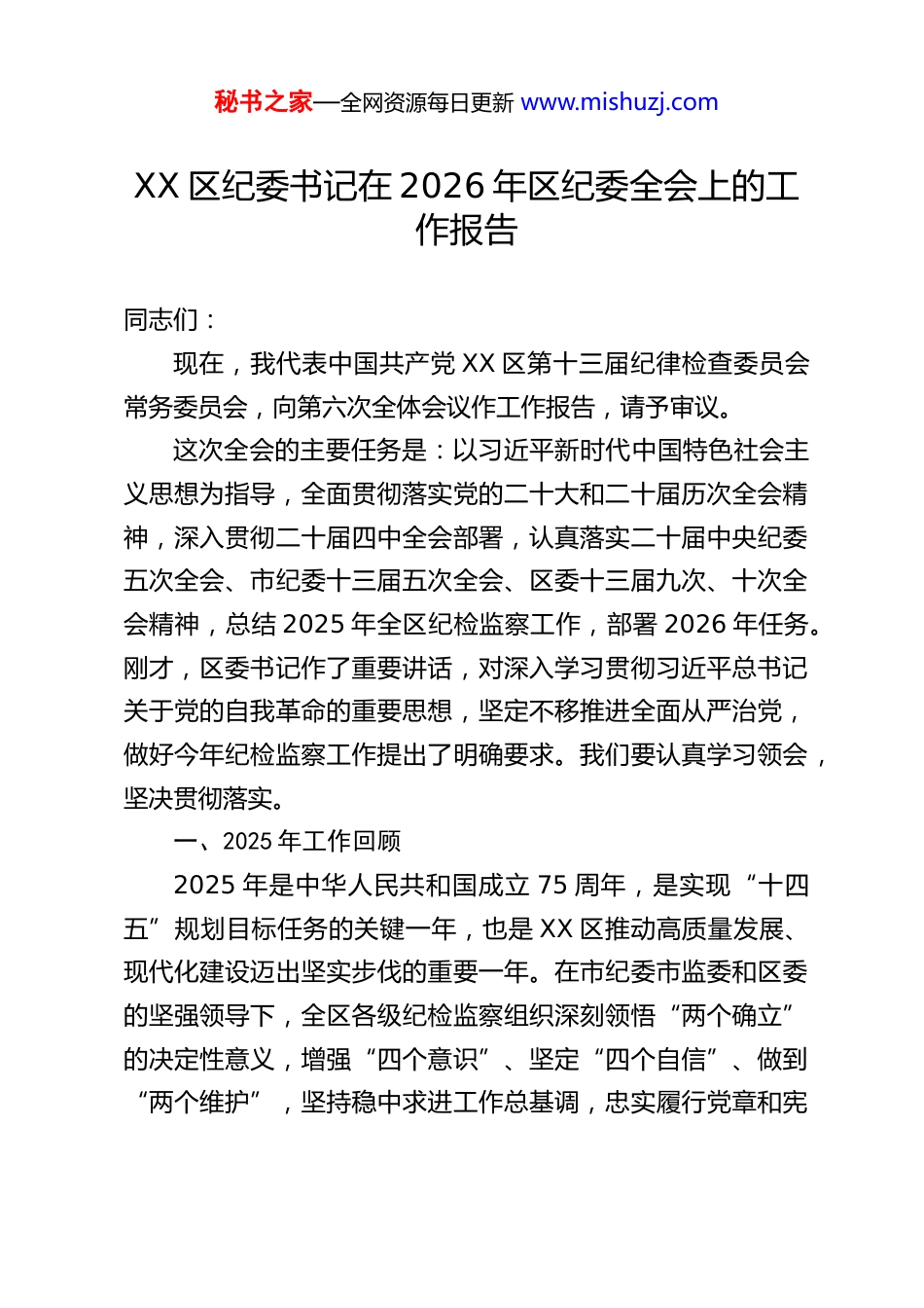 秘书之家—全网资源每日更新 www.mishuzj.comXX 区纪委书记在 2026 年区纪委全会上的工作报告同志们:现在,我代表中国共产党 XX 区第十三届纪律检查委员会常务委员会,向第六次全体会议作工作报告,请予审议。这次全会的主要任务是:以习近平新时代中国特色社会主义思想为指导,全面贯彻落实党的二十大和二十届历次全会精神,深入贯彻二十届四中全会部署,认真落实二十届中央纪委五次全会、市纪委十三届五次全会、区委十三届九次、十次全会精神,总结 2025 年全区纪检监察工作,部署 2026 年任务。刚才,区委书记作了重要讲话,对深入学习贯彻习近平总书记关于党的自我革命的重要思想,坚定不移推进全面从严治党,做好今年纪检监察工作提出了明确要求。我们要认真学习领会,坚决贯彻落实。一、2025 年工作回顾2025 年是中华人民共和国成立 75 周年,是实现“十四五”规划目标任务的关键一年,也是 XX 区推动高质量发展、现代化建设迈出坚实步伐的重要一年。在市纪委市监委和区委的坚强领导下,全区各级纪检监察组织深刻领悟“两个确立”的决定性意义,增强“四个意识”、坚定“四个自信”、做到“两个维护”,坚持稳中求进工作总基调,忠实履行党章和宪秘书之家—全网资源每日更新 www.mishuzj.com法赋予的职责,推动纪检监察工作高质量发展取得新进展新成效,为 XX 区经济社会持续健康发展提供了坚强纪律保障。(一)着力推进政治监督具体化、精准化、常态化,以有力监督保障党中央决策部署落实落地。始终把“两个维护”作为政治监督的根本任务。聚焦学习贯彻习近平总书记重要讲话和重要指示批示精神,特别是考察 XX 市及我区时的重要讲话精神,制定监督清单,开展专项检查,推动全区各级党组织和党员干部学深悟透、笃信笃行。聚焦保障党的二十大战略部署和二十届历次全会精神在我区落实,紧盯高质量发展首要任务、构建新发展格局战略任务、统筹发展和安全等重大决策部署,加强监督检查,确保执行不偏向、不变通、不走样。聚焦服务保障全国“两会”、中国国际进口博览会 XX 分会场、XX 国际科技论坛等重大活动,开展嵌入式、跟进式监督,压实各方责任,保障活动圆满成功。聚焦区委中心工作,围绕“打造现代化产业体系先行区”、“建设高品质宜居宜业新城”等目标任务,建立年度政治监督“总台账”,细化分解 42 项监督重点,实行项目化管理、清单化推进、动态化销账,推动解决了一批影响决策部署落实的堵点难点问题。聚焦提升基层治理效能,将监督触角向基层延伸,加强对“接诉即办”工作的再监督,建立“纪信联动”机制,筛查重点民生诉求工单 7800 余件,推动解决群众急难愁盼问题 630 余个,以监督实效促进基层治理能力提升。秘书之家—全网资源每日更新 www.mishuzj.com(二)着力推进作风建设常态化、长效化,以优良党风政风引领社风民风持续向好。坚持党性党风党纪一起抓,把严的基调、严的措施、严的氛围长期坚持下去。深化纪律教育,协助区委召开全区警示教育大会,通报典型案例,用身边事教育身边人。升级改造 XX 区廉政教育基地,挖掘本土红色文化和廉洁文化资源,新建“清风长廊”等教育阵地,全年接待各级党员干部参观学习 1250 批次、4.2 万余人次,筑牢拒腐防变思想防线。锲而不舍落实中央八项规定及其实施细则精神,对享乐主义、奢靡之风露头就打,深挖细查隐形变异问题。2025年,全区共查处违反中央八项规定精神问题 XX 起,批评教育帮助和处理 XX 人,其中给予党纪政务处分 XX 人,分 XX 批对XX 起典型案例进行通报曝光,持续释放越往后执纪越严的强烈信号。重点纠治形式主义、官僚主义,围绕为基层减负、优化营商环境、推动政策落实等,开展专项整治,严肃查处不担当、不作为、乱作为、假作为问题 XX 起,推动建立健全长效机制XX 项。开展“清风护航”行动,选取 XX 家重点企业作为营商环境监测点,严肃查处吃拿卡要、推诿扯皮等损害营商环境行为,推动构建亲清统一的新型政商关系。(三)着力强化反腐败高压震慑,一体推进不敢腐、不能腐、不想腐。始终保持零容忍震慑不变、高压惩治力量常在。2025 年,...