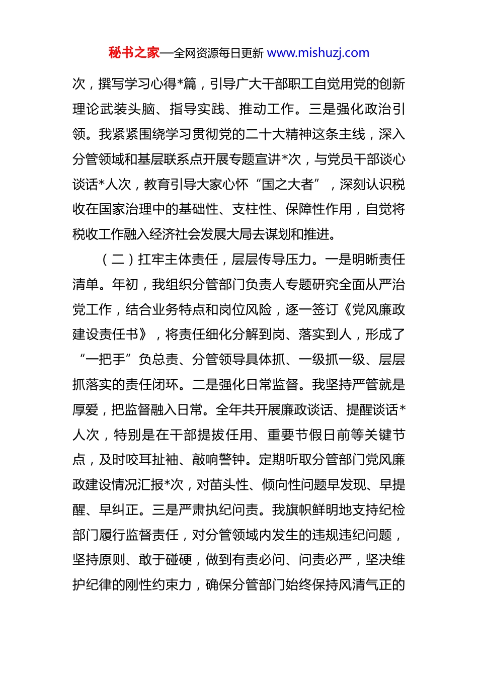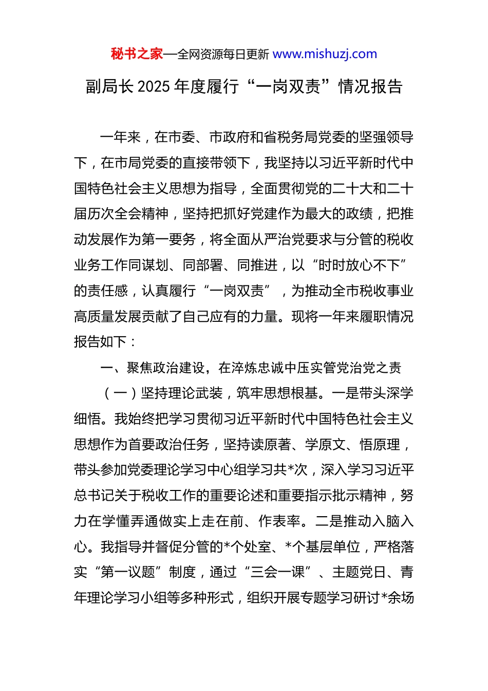秘书之家—全网资源每日更新 www.mishuzj.com副局长 2025 年度履行“一岗双责”情况报告 一年来,在市委、市政府和省税务局党委的坚强领导下,在市局党委的直接带领下,我坚持以习近平新时代中国特色社会主义思想为指导,全面贯彻党的二十大和二十届历次全会精神,坚持把抓好党建作为最大的政绩,把推动发展作为第一要务,将全面从严治党要求与分管的税收业务工作同谋划、同部署、同推进,以“时时放心不下”的责任感,认真履行“一岗双责”,为推动全市税收事业高质量发展贡献了自己应有的力量。现将一年来履职情况报告如下:一、聚焦政治建设,在淬炼忠诚中压实管党治党之责(一)坚持理论武装,筑牢思想根基。一是带头深学细悟。我始终把学习贯彻习近平新时代中国特色社会主义思想作为首要政治任务,坚持读原著、学原文、悟原理,带头参加党委理论学习中心组学习共*次,深入学习习近平总书记关于税收工作的重要论述和重要指示批示精神,努力在学懂弄通做实上走在前、作表率。二是推动入脑入心。我指导并督促分管的*个处室、*个基层单位,严格落实“第一议题”制度,通过“三会一课”、主题党日、青年理论学习小组等多种形式,组织开展专题学习研讨*余场秘书之家—全网资源每日更新 www.mishuzj.com次,撰写学习心得*篇,引导广大干部职工自觉用党的创新理论武装头脑、指导实践、推动工作。三是强化政治引领。我紧紧围绕学习贯彻党的二十大精神这条主线,深入分管领域和基层联系点开展专题宣讲*次,与党员干部谈心谈话*人次,教育引导大家心怀“国之大者”,深刻认识税收在国家治理中的基础性、支柱性、保障性作用,自觉将税收工作融入经济社会发展大局去谋划和推进。(二)扛牢主体责任,层层传导压力。一是明晰责任清单。年初,我组织分管部门负责人专题研究全面从严治党工作,结合业务特点和岗位风险,逐一签订《党风廉政建设责任书》,将责任细化分解到岗、落实到人,形成了“一把手”负总责、分管领导具体抓、一级抓一级、层层抓落实的责任闭环。二是强化日常监督。我坚持严管就是厚爱,把监督融入日常。全年共开展廉政谈话、提醒谈话*人次,特别是在干部提拔任用、重要节假日前等关键节点,及时咬耳扯袖、敲响警钟。定期听取分管部门党风廉政建设情况汇报*次,对苗头性、倾向性问题早发现、早提醒、早纠正。三是严肃执纪问责。我旗帜鲜明地支持纪检部门履行监督责任,对分管领域内发生的违规违纪问题,坚持原则、敢于碰硬,做到有责必问、问责必严,坚决维护纪律的刚性约束力,确保分管部门始终保持风清气正的秘书之家—全网资源每日更新 www.mishuzj.com良好政治生态。(三)深化作风建设,培塑过硬队伍。一是持续纠治“四风”。我带头严格执行纪律规定及其要求,坚决反对形式主义、官僚主义。针对基层反映的文山会海、督考过频等问题,牵头进行了专项清理,精简会议*个,合并督查考核事项*项,切实为基层松绑减负。二是弘扬务实之风。我大力倡导“事经我手请放心、文经我手无差错”的实干精神,教育引导干部职工深入基层一线、深入纳税人缴费人中间,察实情、出实招、求实效。全年深入企业、社区、办税服务厅等基层一线开展调研共*余次,现场解决各类难题*个。三是激励担当作为。我坚持严管与厚爱相结合,在政治上关心、工作上支持、生活上关怀干部职工,对在急难险重任务中表现突出的干部及时予以肯定和表扬,旗帜鲜明地为敢于担当、踏实做事的干部撑腰鼓劲,营造了干事创业、争先创优的浓厚氛围。二、聚焦中心大局,在履职尽责中彰显税收担当之要(一)全力以赴抓组织收入,夯实财力保障之基。一是坚持依法征收。我始终牢记“为国聚财、为民收税”的神圣使命,坚决贯彻依法治税原则,依法依规组织税费收入。面对复杂严峻的宏观经济形势,我带领分管部门加强税收经济分析研判,密切跟踪重点税源、重点行业、重点秘书之家—全网资源每日更新 www.mishuzj.com企业变化,确保税费收入应收尽收。全年累计组织税费收入*亿元,为地方经济社会发展提供了坚实的财力保障。二是提升收入质量。我们注重税费收入的质量和可持续性,坚决不收“过头税费”,坚决守住不减收、不...