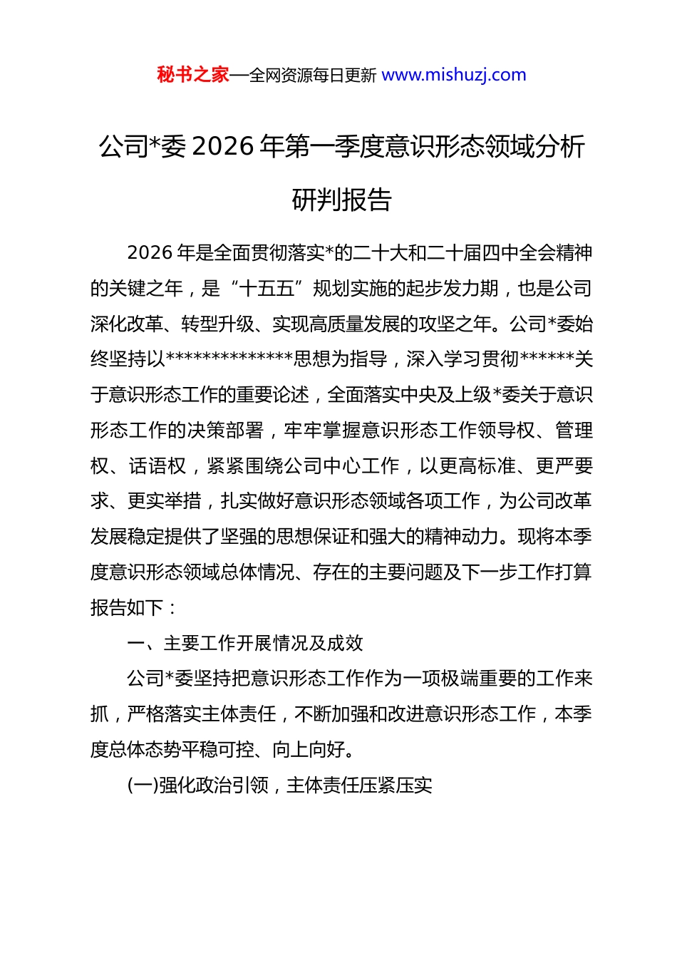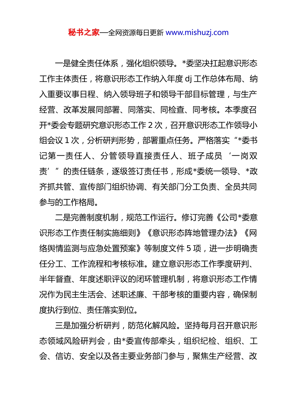 秘书之家—全网资源每日更新 www.mishuzj.com公司*委 2026 年第一季度意识形态领域分析研判报告2026 年是全面贯彻落实*的二十大和二十届四中全会精神的关键之年,是“十五五”规划实施的起步发力期,也是公司深化改革、转型升级、实现高质量发展的攻坚之年。公司*委始终坚持以**************思想为指导,深入学习贯彻******关于意识形态工作的重要论述,全面落实中央及上级*委关于意识形态工作的决策部署,牢牢掌握意识形态工作领导权、管理权、话语权,紧紧围绕公司中心工作,以更高标准、更严要求、更实举措,扎实做好意识形态领域各项工作,为公司改革发展稳定提供了坚强的思想保证和强大的精神动力。现将本季度意识形态领域总体情况、存在的主要问题及下一步工作打算报告如下:一、主要工作开展情况及成效公司*委坚持把意识形态工作作为一项极端重要的工作来抓,严格落实主体责任,不断加强和改进意识形态工作,本季度总体态势平稳可控、向上向好。(一)强化政治引领,主体责任压紧压实秘书之家—全网资源每日更新 www.mishuzj.com一是健全责任体系,强化组织领导。*委坚决扛起意识形态工作主体责任,将意识形态工作纳入年度 dj 工作总体布局、纳入重要议事日程、纳入领导班子和领导干部目标管理,与生产经营、改革发展同部署、同落实、同检查、同考核。本季度召开*委会专题研究意识形态工作 2 次,召开意识形态工作领导小组会议 1 次,分析研判形势,部署重点任务。严格落实“*委书记第一责任人、分管领导直接责任人、班子成员‘一岗双责’”的责任链条,逐级签订责任书,形成*委统一领导、*政齐抓共管、宣传部门组织协调、有关部门分工负责、全员共同参与的工作格局。二是完善制度机制,规范工作运行。修订完善《公司*委意识形态工作责任制实施细则》《意识形态阵地管理办法》《网络舆情监测与应急处置预案》等制度文件 5 项,进一步明确责任分工、工作流程和考核标准。建立意识形态工作季度研判、半年督查、年度述职评议的闭环管理机制,将意识形态工作情况作为民主生活会、述职述廉、干部考核的重要内容,确保制度执行到位、责任落实到位。三是加强分析研判,防范化解风险。坚持每月召开意识形态领域风险研判会,由*委宣传部牵头,组织纪检、组织、工会、信访、安全以及各主要业务部门参与,聚焦生产经营、改秘书之家—全网资源每日更新 www.mishuzj.com革调整、队伍稳定、信访举报、网络舆情等重点领域,进行动态监测和综合分析。本季度累计排查各类风险点 12 个,针对职工关切的热点难点问题,如薪酬体系优化、岗位调整适配、安全生产压力等,及时回应、有效疏导,妥善处理内部矛盾隐患 8 起,未发生重大意识形态安全事件。(二)深化理论武装,思想根基持续巩固一是抓实“第一议题”,提升政治能力。坚持将学习贯彻**************思想、******最新重要讲话和****批示精神作为*委会、理论学习中心组学习的“第一议题”,及时传达学习*中央重大决策部署和上级*委工作要求。本季度组织*委理论学习中心组集体学习 3 次,专题研讨 2 次,重点围绕*的二十届四中全会精神、“十五五”规划纲要中关于国资国企改革发展的部署要求、发展新质生产力、推动高质量发展等主题进行深入学习研讨,引导领导干部深刻领悟“两个确立”的决定性意义,增强“四个意识”、坚定“四个自信”、做到“两个维护”。二是创新学习载体,增强教育实效。各基层*组织依托“三会一课”、主题*日等,采取集中学习、专题辅导、在线答题、知识竞赛、现场教学等多种形式,持续加强理论武装和形势政策教育。本季度各*支部共开展各类学习活动 150 余场次,覆秘书之家—全网资源每日更新 www.mishuzj.com盖*员职工 3000 余人次。组织开展“开局‘十五五’、奋进新征程”主题宣传教育活动,举办劳模先进事迹报告会、青年职工座谈会,用身边事教育身边人,凝聚奋进力量。三是拓展教育覆盖面,筑牢共同思想基础。在抓好*员干部教育的同时,注重加强对青年职工、技术骨干、外派人员、劳务派遣人员等群体的思想引导。利用公司内网、微信公众号、宣传栏、电子屏等平台,开设理论学习专栏,推...