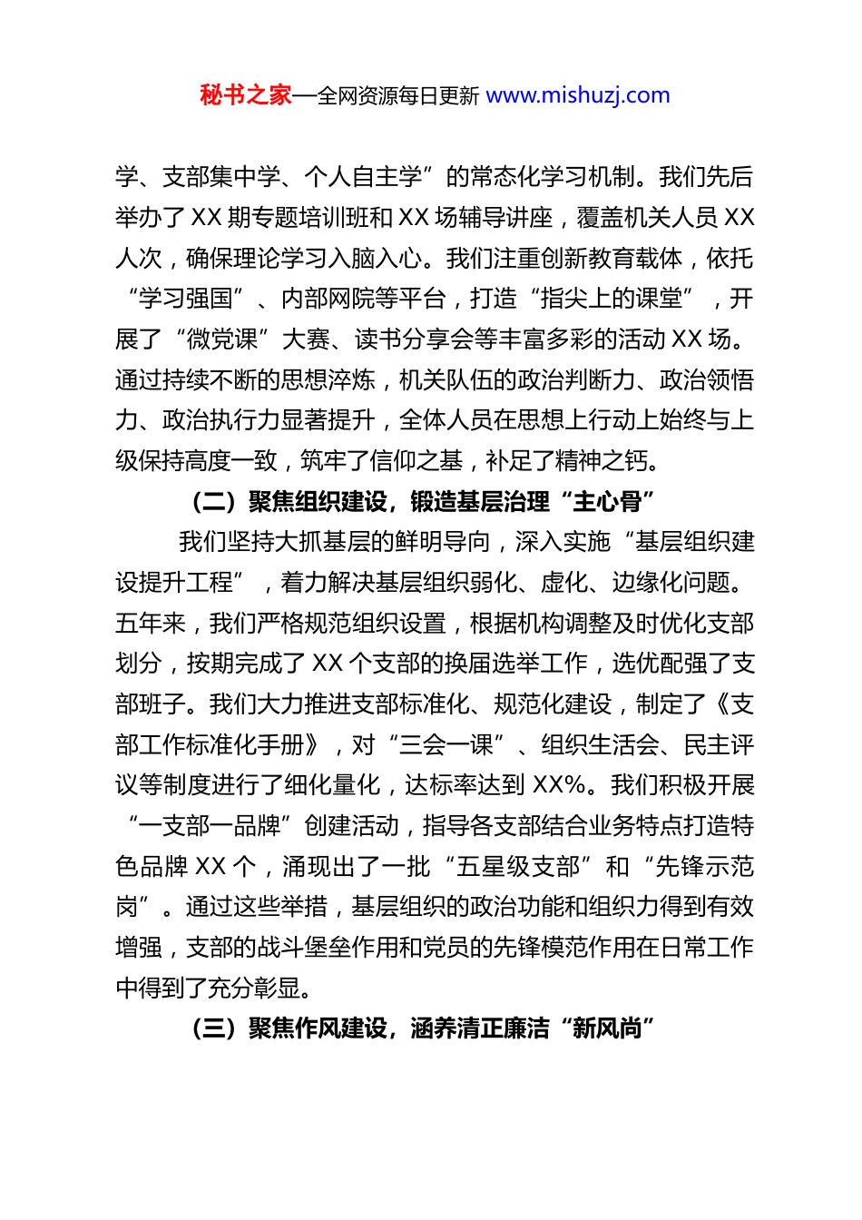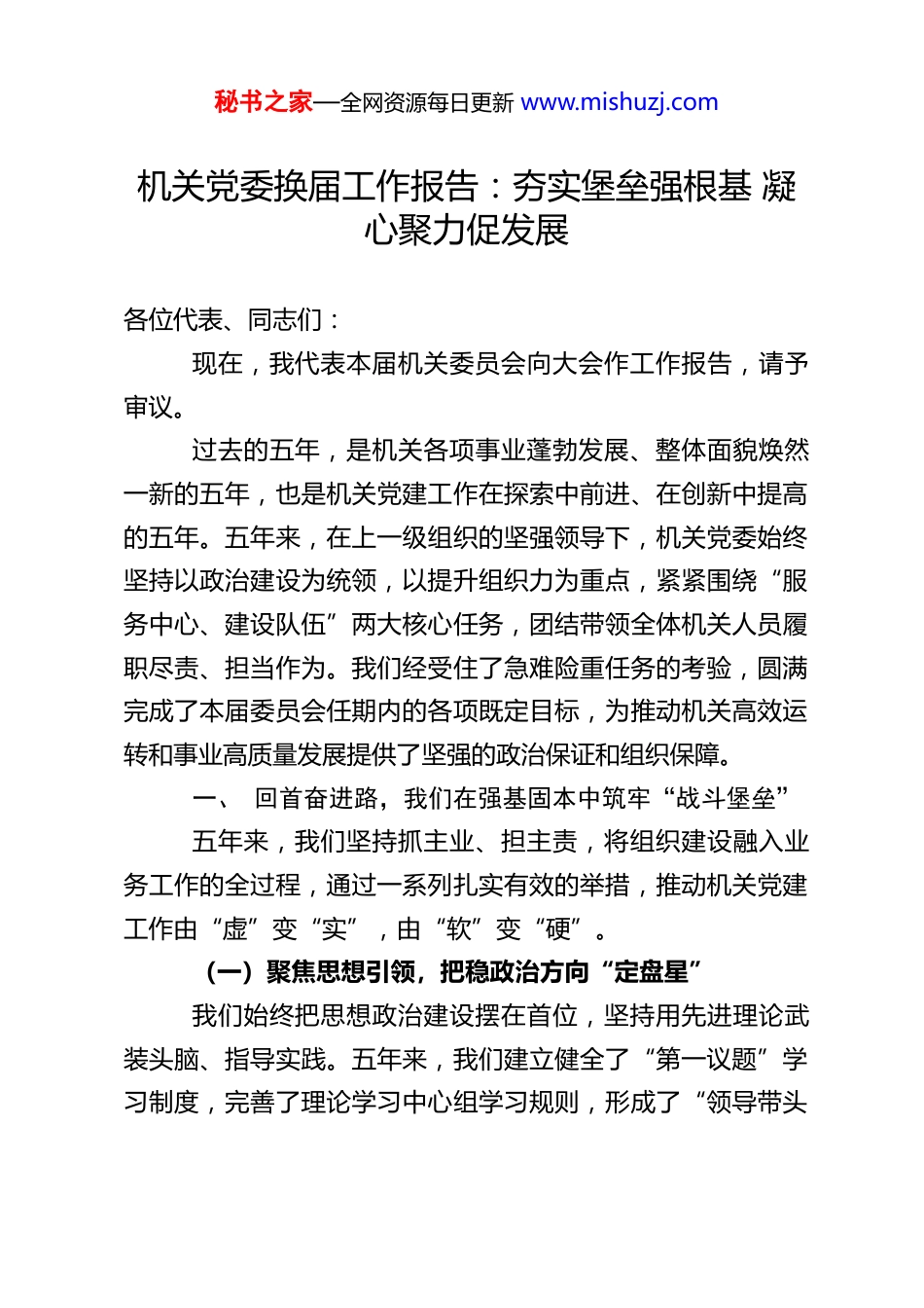 秘书之家—全网资源每日更新 www.mishuzj.com机关党委换届工作报告:夯实堡垒强根基 凝心聚力促发展各位代表、同志们:现在,我代表本届机关委员会向大会作工作报告,请予审议。过去的五年,是机关各项事业蓬勃发展、整体面貌焕然一新的五年,也是机关党建工作在探索中前进、在创新中提高的五年。五年来,在上一级组织的坚强领导下,机关党委始终坚持以政治建设为统领,以提升组织力为重点,紧紧围绕“服务中心、建设队伍”两大核心任务,团结带领全体机关人员履职尽责、担当作为。我们经受住了急难险重任务的考验,圆满完成了本届委员会任期内的各项既定目标,为推动机关高效运转和事业高质量发展提供了坚强的政治保证和组织保障。一、 回首奋进路,我们在强基固本中筑牢“战斗堡垒”五年来,我们坚持抓主业、担主责,将组织建设融入业务工作的全过程,通过一系列扎实有效的举措,推动机关党建工作由“虚”变“实”,由“软”变“硬”。(一)聚焦思想引领,把稳政治方向“定盘星”我们始终把思想政治建设摆在首位,坚持用先进理论武装头脑、指导实践。五年来,我们建立健全了“第一议题”学习制度,完善了理论学习中心组学习规则,形成了“领导带头秘书之家—全网资源每日更新 www.mishuzj.com学、支部集中学、个人自主学”的常态化学习机制。我们先后举办了 XX 期专题培训班和 XX 场辅导讲座,覆盖机关人员 XX人次,确保理论学习入脑入心。我们注重创新教育载体,依托“学习强国”、内部网院等平台,打造“指尖上的课堂”,开展了“微党课”大赛、读书分享会等丰富多彩的活动 XX 场。通过持续不断的思想淬炼,机关队伍的政治判断力、政治领悟力、政治执行力显著提升,全体人员在思想上行动上始终与上级保持高度一致,筑牢了信仰之基,补足了精神之钙。(二)聚焦组织建设,锻造基层治理“主心骨”我们坚持大抓基层的鲜明导向,深入实施“基层组织建设提升工程”,着力解决基层组织弱化、虚化、边缘化问题。五年来,我们严格规范组织设置,根据机构调整及时优化支部划分,按期完成了 XX 个支部的换届选举工作,选优配强了支部班子。我们大力推进支部标准化、规范化建设,制定了《支部工作标准化手册》,对“三会一课”、组织生活会、民主评议等制度进行了细化量化,达标率达到 XX%。我们积极开展“一支部一品牌”创建活动,指导各支部结合业务特点打造特色品牌 XX 个,涌现出了一批“五星级支部”和“先锋示范岗”。通过这些举措,基层组织的政治功能和组织力得到有效增强,支部的战斗堡垒作用和党员的先锋模范作用在日常工作中得到了充分彰显。(三)聚焦作风建设,涵养清正廉洁“新风尚”秘书之家—全网资源每日更新 www.mishuzj.com我们始终保持正风肃纪的高压态势,持之以恒纠“四风”、树新风,努力营造风清气正的政治生态。五年来,我们层层压实全面从严治党主体责任,制定了《机关党风廉政建设责任清单》,每年组织签订《廉政承诺书》XX 份,构建了横向到边、纵向到底的责任体系。我们坚持教育在先、警示在前,定期开展廉政谈话和警示教育活动,组织观看警示教育片 XX场,参观廉政教育基地 XX 次,用身边事教育身边人。我们深化运用监督执纪“四种形态”,特别是第一种形态,对苗头性、倾向性问题早发现、早提醒、早处置,累计开展谈心谈话 XX人次。同时,我们大力开展机关作风整顿,重点整治“庸懒散浮拖”等顽疾,机关效能显著提升,服务对象的满意度连年攀升。(四)聚焦深度融合,激活事业发展“新引擎”我们坚决破除“两张皮”现象,坚持围绕中心抓党建、抓好党建促业务,推动党建工作与业务工作深度融合、同频共振。五年来,我们围绕机关重点难点任务,组建了 XX 支“党员突击队”和“攻坚小组”,在重大项目建设、突发事件处置、专项整治行动等急难险重任务中冲锋在前。我们深入开展“机关接地气、干部走基层”活动,组织机关人员与基层单位、社区结对共建,累计开展志愿服务活动 XX 次,解决基层实际困难 XX 件。我们建立了党建与业务同谋划、同部署、同落实、同考核的运行机制,把业务工作的难点作为党建工作的重点,秘书之家—全网...
