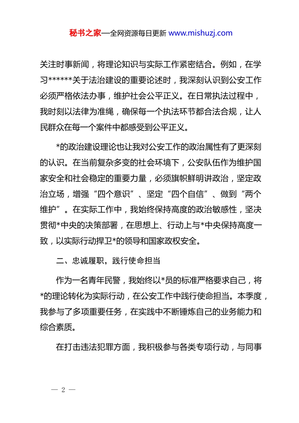 秘书之家—全网资源每日更新 www.mishuzj.com2025 年第三季度青年民警入党积极分子思想汇报敬爱的*组织:在 2025 年第三季度,通过学习、实践和自我反思,我在思想上经历了深刻的洗礼,对*的信仰更加坚定,对公安事业的责任感和使命感也更加强烈。现将这一季度的思想情况向*组织汇报如下。一、理论铸魂,照亮从警征程本季度,我持续深入学习*的政治理论,尤其是**************思想,努力领悟其核心要义与精神实质。这一伟大思想如同一座熠熠生辉的灯塔,为我们在新时代的公安工作指明了前进的方向。通过学习,我深刻认识到它的科学性和指导性,它不仅是对中国特色社会主义建设经验的高度总结,更为我们实现中华民族伟大复兴的中国梦提供了坚实的理论支撑。在学习过程中,我积极参加*组织组织的集中学习和交流活动,与同志们共同探讨、相互启发,从不同角度加深对*的理论的理解。同时,我坚持自主学习,阅读相关的理论著作和文件,— 1 —秘书之家—全网资源每日更新 www.mishuzj.com关注时事新闻,将理论知识与实际工作紧密结合。例如,在学习******关于法治建设的重要论述时,我深刻认识到公安工作必须严格依法办事,维护社会公平正义。在日常执法过程中,我时刻以法律为准绳,确保每一个执法环节都合法合规,让人民群众在每一个案件中都感受到公平正义。*的政治建设理论也让我对公安工作的政治属性有了更深刻的认识。在当前复杂多变的社会环境下,公安队伍作为维护国家安全和社会稳定的重要力量,必须旗帜鲜明讲政治,坚定政治立场,增强“四个意识”、坚定“四个自信”、做到“两个维护”。在实际工作中,我始终保持高度的政治敏感性,坚决贯彻*中央的决策部署,在思想上、行动上与*中央保持高度一致,以实际行动捍卫*的领导和国家政权安全。二、忠诚履职,践行使命担当作为一名青年民警,我始终以*员的标准严格要求自己,将*的理论转化为实际行动,在公安工作中践行使命担当。本季度,我参与了多项重要任务,在实践中不断锤炼自己的业务能力和综合素质。在打击违法犯罪方面,我积极参与各类专项行动,与同事— 2 —秘书之家—全网资源每日更新 www.mishuzj.com们密切配合,严厉打击各类违法犯罪活动。例如,在一次打击盗窃犯罪的行动中,我们通过细致的侦查和艰苦的蹲守,成功抓获了一个盗窃团伙,为群众挽回了经济损失。在这个过程中,我深刻体会到了公安工作的艰辛和重要性,也更加坚定了我打击违法犯罪、维护社会稳定的决心。在维护社会秩序方面,我积极参与各类安保工作,确保重大活动和重要场所的安全。在一次大型活动的安保工作中,我和同事们提前制定了详细的安保方案,加强了对活动现场的巡逻和管控,确保了活动的顺利进行。通过这次安保工作,我提高了应对突发事件的能力,也更加深刻地认识到了公安工作在维护社会秩序中的重要作用。在服务群众方面,我始终牢记为人民服务的宗旨,积极为群众排忧解难。本季度,我参与了社区警务工作,深入社区了解群众的需求和困难,为群众提供帮助和服务。例如,在一次走访中,我了解到一位老人因为子女不在身边,生活上存在一些困难。我主动帮助老人解决了生活中的一些实际问题,并定期看望老人,让老人感受到了*和政府的关怀。通过这些工作,我进一步密切了与群众的联系,增强了群众对公安工作的信任和支持。— 3 —秘书之家—全网资源每日更新 www.mishuzj.com三、反思自省,砥砺*性修养在本季度的思想成长过程中,我始终坚持自我反思,不断审视自己的言行,查找存在的不足。通过反思,我认识到自己在工作中还存在一些不足之处,例如在处理复杂问题时,有时会缺乏耐心和细心,导致工作效率不高;在与群众沟通交流时,有时会缺乏方法和技巧,影响了工作效果。这些问题提醒我,*性修养是一个长期的过程,需要不断地学习和实践。为了提高自己的*性修养,我加强了对 dj*规的学习,严格遵守 d 的纪律和规矩,自觉接受*组织的监督和管理。同时,我积极参加*组织组织的廉政教育活动,深刻剖析反面典型案例,从中汲取教训,筑牢廉洁自律的思想防线。在思想品德修养方面,我以诚实守信、敬业奉献为准则,努力在工作和生活...