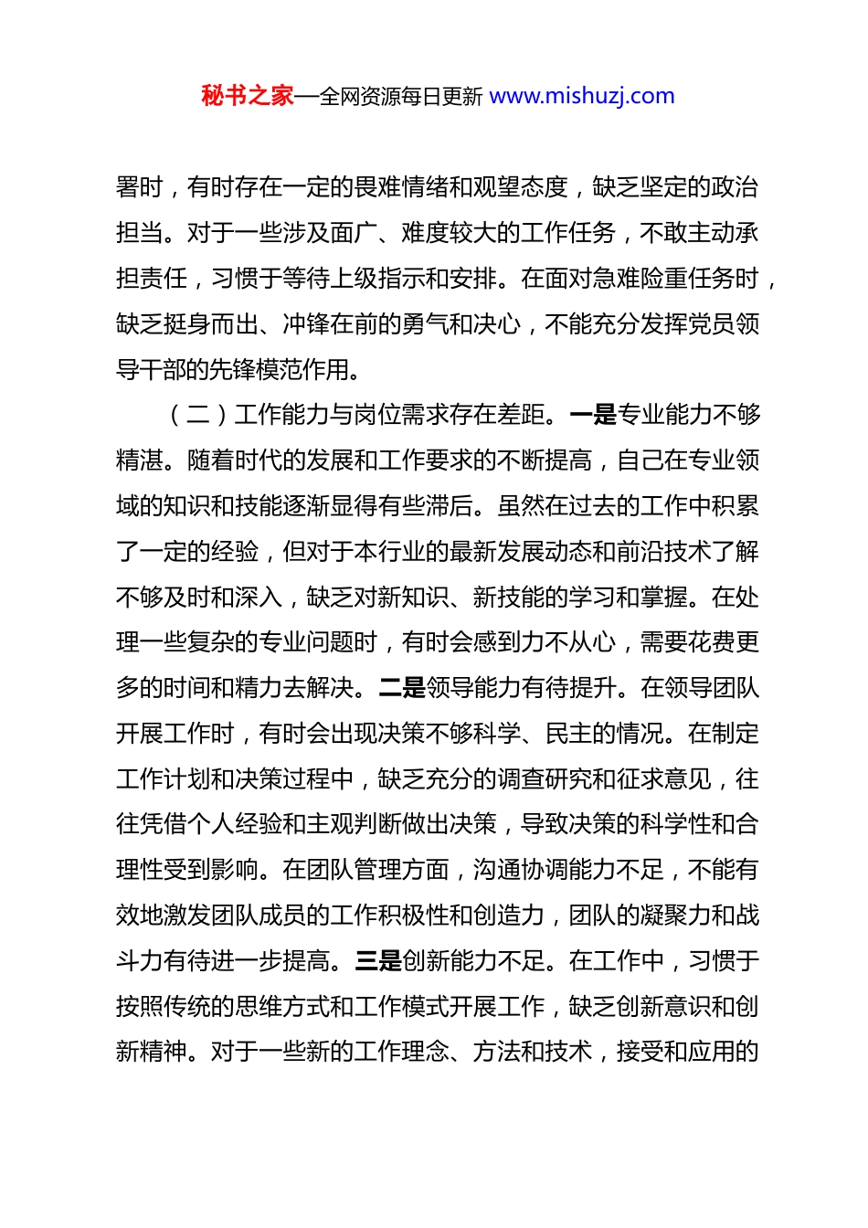 秘书之家—全网资源每日更新 www.mishuzj.com2025 年度领导干部个人对照检查材料 根据相关要求,结合年度工作目标与岗位职责要求,本人通过系统梳理、深度反思,现将个人履职情况对照检查如下。一、主要问题检视(一)政治素养与时代要求存在落差。一是政治理论学习深度不足。在日常政治理论学习中,虽然能够积极参加各类集中学习活动,按时完成规定的学习任务,但学习往往停留在表面,缺乏深入的思考和研究。对于党的创新理论,如习近平新时代中国特色社会主义思想的学习,多是泛泛而读,对其中的核心要义、精神实质和实践要求理解不够透彻,未能真正做到学深悟透、融会贯通。在学习过程中,存在实用主义倾向,往往是为了应付工作中的问题而进行学习,缺乏系统性和全面性。二是政治敏锐性和鉴别力有待提高。在面对复杂多变的政治形势和社会现象时,政治敏锐性不够强,不能及时准确地识别和判断其中潜在的政治风险和问题。对于一些错误思潮和言论,缺乏足够的警惕性和批判精神,不能旗帜鲜明地进行抵制和斗争。在实际工作中,有时会因为政治鉴别力不足,而导致对一些问题的处理出现偏差,影响了工作的政治效果。三是政治担当意识不够强烈。在贯彻落实党的路线方针政策和上级决策部秘书之家—全网资源每日更新 www.mishuzj.com署时,有时存在一定的畏难情绪和观望态度,缺乏坚定的政治担当。对于一些涉及面广、难度较大的工作任务,不敢主动承担责任,习惯于等待上级指示和安排。在面对急难险重任务时,缺乏挺身而出、冲锋在前的勇气和决心,不能充分发挥党员领导干部的先锋模范作用。(二)工作能力与岗位需求存在差距。一是专业能力不够精湛。随着时代的发展和工作要求的不断提高,自己在专业领域的知识和技能逐渐显得有些滞后。虽然在过去的工作中积累了一定的经验,但对于本行业的最新发展动态和前沿技术了解不够及时和深入,缺乏对新知识、新技能的学习和掌握。在处理一些复杂的专业问题时,有时会感到力不从心,需要花费更多的时间和精力去解决。二是领导能力有待提升。在领导团队开展工作时,有时会出现决策不够科学、民主的情况。在制定工作计划和决策过程中,缺乏充分的调查研究和征求意见,往往凭借个人经验和主观判断做出决策,导致决策的科学性和合理性受到影响。在团队管理方面,沟通协调能力不足,不能有效地激发团队成员的工作积极性和创造力,团队的凝聚力和战斗力有待进一步提高。三是创新能力不足。在工作中,习惯于按照传统的思维方式和工作模式开展工作,缺乏创新意识和创新精神。对于一些新的工作理念、方法和技术,接受和应用的秘书之家—全网资源每日更新 www.mishuzj.com速度较慢,不能及时将其融入到实际工作中。在面对工作中的困难和问题时,缺乏创新思维和解决问题的能力,往往采取保守的方法来应对,导致工作效率不高,效果不佳。(三)工作作风与务实要求存在差距一是工作态度不够严谨。在工作中,有时会存在粗心大意、敷衍了事的情况。对于一些重要的工作任务,没有认真对待,缺乏严谨的工作态度和高度的责任感。在处理文件、数据等工作时,有时会出现错误和疏漏,给工作带来了一定的影响。在工作中,还存在拖延现象,不能按时完成工作任务,导致工作效率低下。二是工作执行力不够强。在执行上级决策部署和工作任务时,有时会出现打折扣、搞变通的情况。对于一些工作要求,没有严格按照规定的标准和时间节点去落实,存在应付了事的现象。在工作中,缺乏雷厉风行、真抓实干的工作作风,对于一些工作中的困难和问题,不能及时采取有效的措施加以解决,导致工作进展缓慢。三是调查研究不够深入。在工作中,虽然也会开展一些调查研究活动,但往往流于形式,缺乏深入的分析和研究。在调查研究过程中,往往只是走马观花地看一下,没有真正深入到基层和群众中去了解实际情况,听取他们的意见和建议。对于秘书之家—全网资源每日更新 www.mishuzj.com调查研究中发现的问题,没有进行深入的分析和思考,不能提出切实可行的解决方案,导致调查研究的成果不能有效地转化为工作决策和措施。(四)廉洁自律与纪律要求存在差距。一是廉洁意识不够牢固。在日常...