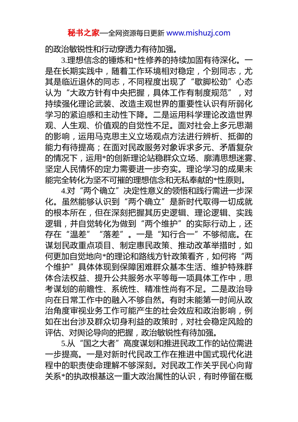秘书之家—全网资源每日更新 www.mishuzj.com2025 年组织生活会批评与自我批评意见集锦(132 条)1.理论学习的系统性和主动性有待加强。一是存在“任务性”学习倾向。满足于完成集体学习、专题报告等“规定动作”,个人自学计划性不强、投入时间不足,对**************思想的时代背景、核心要义、精神实质、丰富内涵、实践要求的整体性把握不够系统全面。二是存在“选择性”学习现象。对******关于民政工作的重要论述学习较多,但对其中蕴含的世界观、方法论以及经济、政治、文化、社会、生态文明等各领域的论述学习不够均衡深入导致理论视野不够开阔。三是存在“浅表化”学习问题。读原著、学原文、悟原理的韧劲不足,对一些新思想、新论断、新要求的理解停留于字面,缺乏追根溯源的钻研精神,未能完全做到融会贯通、入脑入心。2.理论联系实际的紧密度和转化度有待提升。一是运用*的创新理论指导民政实践不够自觉。未能完全将**************思想中蕴含的立场、观点、方法,如坚持人民至上、坚持问题导向、坚持系统观念等,创造性地运用到破解民政事业发展难题中去。例如,在应对人口老龄化、健全分层分类社会救助体系、创新基层社区治理模式、推进慈善事业健康发展等重大课题上,如何运用*的创新理论寻找突破口、制定新策略,思考不够深入,举措创新不足。二是政治判断力、政治领悟力、政治执行力有待强化。从政治高度观察和分析民政业务工作的能力尚有欠缺,有时就业务谈业务,未能始终将民政工作置于国家发展大局、全市中心工作中去考量和推进,在履行基本民生保障、基层社会治理、基本社会服务等职责时,贯彻落实上级决策部署秘书之家—全网资源每日更新 www.mishuzj.com的政治敏锐性和行动穿透力有待加强。3.理想信念的锤炼和*性修养的持续加固有待深化。一是在长期实践中,随着工作环境相对稳定,个别同志,尤其是临近退休的同志,不同程度出现了“歇脚松劲”心态认为“大政方针有中央把握,具体工作有制度规范”,对持续强化理论武装、改造主观世界的重要性认识有所弱化学习的紧迫感和主动性下降。二是运用科学理论改造世界观、人生观、价值观的自觉性不足。面对社会上多元思潮的影响,运用马克思主义立场观点方法进行辨析、抵御的能力有待提高;在面对民政服务对象诉求多元、矛盾复杂的情况下,运用*的创新理论站稳群众立场、廓清思想迷雾、坚定人民情怀的定力需要进一步夯实。理论学习的成果未能完全转化为坚不可摧的理想信念和无私奉献的*性原则。4.对“两个确立”决定性意义的领悟和践行需进一步深化。虽然能够认识到“两个确立”是新时代取得一切成就的根本所在,但在深刻把握其历史逻辑、理论逻辑、实践逻辑,并自觉转化为做到“两个维护”的实际行动上,还存在“温差”“落差”。一是“知行合一”不够彻底。在谋划民政重点项目、制定惠民政策、推动改革举措时,如何更加自觉地向*的理论和路线方针政策看齐,如何将“两个维护”具体体现到保障困难群众基本生活、维护特殊群体合法权益、提升公共服务水平等每一项具体工作中,思考谋划的前瞻性、系统性、精准性尚有不足。二是政治导向在日常工作中的融入不够自然。有时未能第一时间从政治角度审视业务工作可能产生的社会效应和政治影响,例如在出台涉及群众切身利益的政策时,对社会稳定风险的评估、对舆论导向的把握,政治敏锐性有待加强。5.从“国之大者”高度谋划和推进民政工作的站位需进一步提高。一是对新时代民政工作在推进中国式现代化进程中的职责使命理解不够深刻。对民政工作关乎民心向背关系*的执政根基这一重大政治属性的认识,有时停留在概秘书之家—全网资源每日更新 www.mishuzj.com念层面,未能完全内化为“时时放心不下”的责任感和“民政为民、民政爱民”的强烈使命感。二是在服务大局中找准民政定位不够精准。围绕国家重大战略和全市发展中心任务,如何发挥民政部门在保障基本民生、助力乡村振兴、促进社会和谐等方面的独特作用,主动对接、系统谋划、精准发力的能力有待提升。工作有时局限于完成上级交办任务和常规业务,服务国家大局、全市发展的切入点和贡献度不够突出。6.机关 dj 与民...
