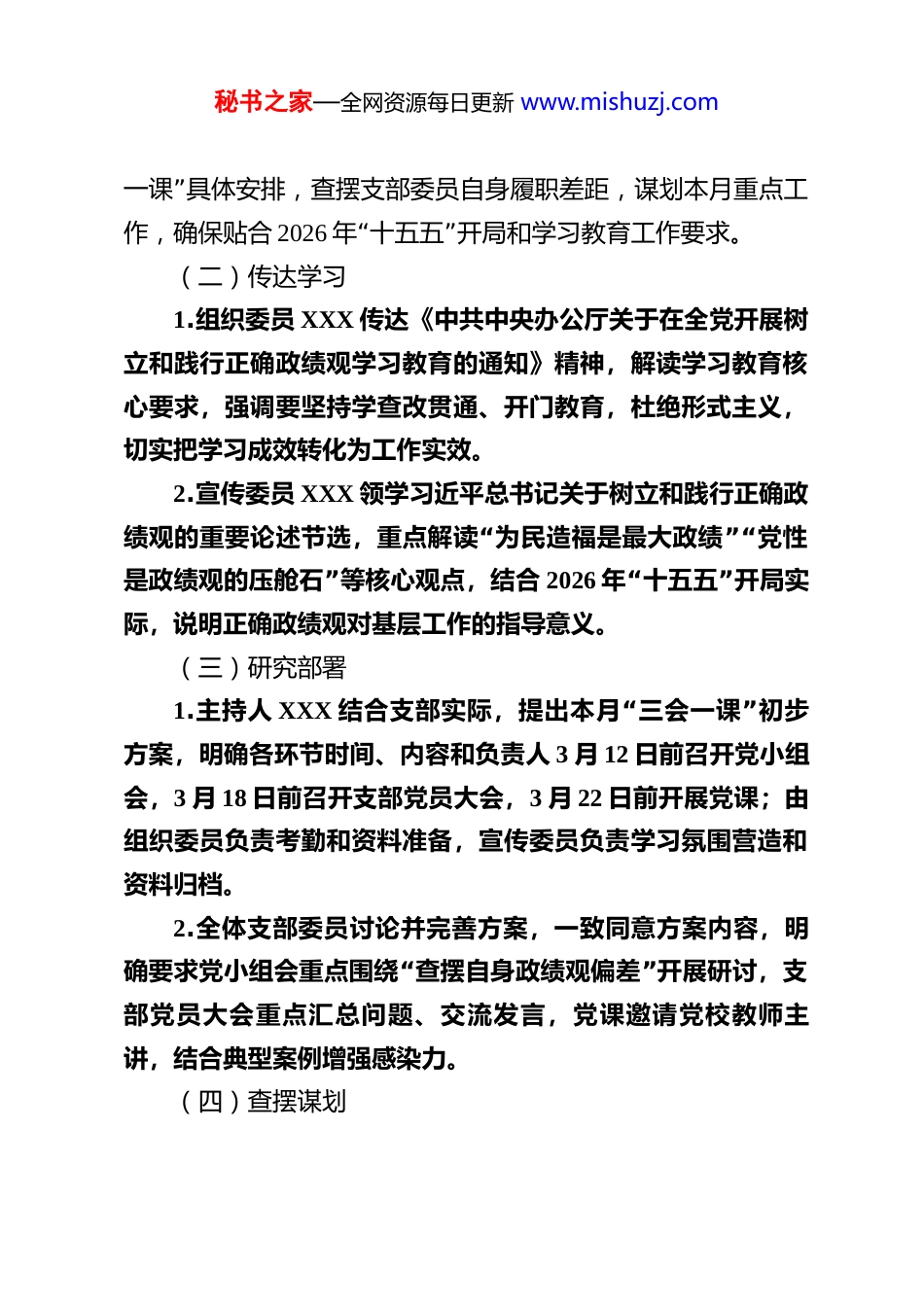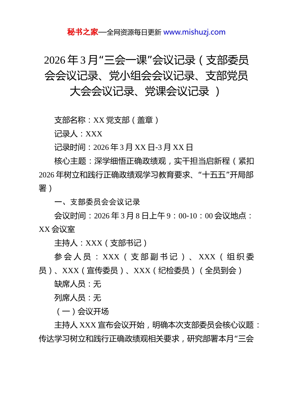 秘书之家—全网资源每日更新 www.mishuzj.com2026 年 3“”月 三会一课 会议记录(支部委员会会议记录、党小组会会议记录、支部党员大会会议记录、党课会议记录 )支部名称:XX 党支部(盖章)记录人:XXX记录时间:2026 年 3 月 XX 日-3 月 XX 日核心主题:深学细悟正确政绩观,实干担当启新程(紧扣2026“”年树立和践行正确政绩观学习教育要求、 十五五 开局部署)一、支部委员会会议记录会议时间:2026 年 3 月 8 日上午 9:00-10:00 会议地点:XX 会议室主持人:XXX(支部书记)参 会 人 员 : XXX ( 支 部 副 书 记 ) 、 XXX ( 组 织 委员)、XXX(宣传委员)、XXX(纪检委员)(全员到会)缺席人员:无列席人员:无(一)会议开场主持人 XXX 宣布会议开始,明确本次支部委员会核心议题:“传达学习树立和践行正确政绩观相关要求,研究部署本月 三会秘书之家—全网资源每日更新 www.mishuzj.com”一课 具体安排,查摆支部委员自身履职差距,谋划本月重点工作,确保贴合 2026“”年 十五五 开局和学习教育工作要求。(二)传达学习1.组织委员 XXX 传达《中共中央办公厅关于在全党开展树立和践行正确政绩观学习教育的通知》精神,解读学习教育核心要求,强调要坚持学查改贯通、开门教育,杜绝形式主义,切实把学习成效转化为工作实效。2.宣传委员 XXX 领学习近平总书记关于树立和践行正确政“绩观的重要论述节选,重点解读 为民造福是最大政绩”“党性”是政绩观的压舱石 等核心观点,结合 2026“”年 十五五 开局实际,说明正确政绩观对基层工作的指导意义。(三)研究部署1.主持人 XXX“”结合支部实际,提出本月 三会一课 初步方案,明确各环节时间、内容和负责人 3 月 12 日前召开党小组会,3 月 18 日前召开支部党员大会,3 月 22 日前开展党课;由组织委员负责考勤和资料准备,宣传委员负责学习氛围营造和资料归档。2.全体支部委员讨论并完善方案,一致同意方案内容,明“”确要求党小组会重点围绕 查摆自身政绩观偏差 开展研讨,支部党员大会重点汇总问题、交流发言,党课邀请党校教师主讲,结合典型案例增强感染力。(四)查摆谋划秘书之家—全网资源每日更新 www.mishuzj.com1.支部委员逐一对照正确政绩观要求,查摆自身履职不足:(1)XXX(支部书记):“”存在 重部署、轻跟踪 的倾向,对支部党员践行正确政绩观的督促指导不够深入,后续将加强常态化检视。(2)XXX(支部副书记):深入基层调研不够经常,对群众急难愁盼问题掌握不够全面,政绩观践行与群众需求结合不够紧密。(3)其他支部委员分别结合分管工作,查摆形式主义、实干担当不足等方面的具体问题,并简要说明整改思路。2.研究支部层面践行正确政绩观举措:“”结合 十五五 开局部署,本月重点推进基层民生走访、政策宣传落实两项工作,由支部委员牵头,党员带头参与,切实为群众办实事。(五)会议总结主持人 XXX 强调,支部委员要发挥示范引领作用,带头学习、带头查摆、带头整改;“”要严格落实本月 三会一课 方案,紧扣学习教育要求,杜绝走过场,确保全体党员深刻领悟正确“”政绩观内涵,推动党建与业务深度融合,为 十五五 开好局提供组织保障。会议宣布结束。二、党小组会会议记录会议时间:2026 年 3 月 12 日下午 2:30-3:20 会议地点:XX 党小组活动室主持人:XXX(党小组长)秘书之家—全网资源每日更新 www.mishuzj.com参会人员:XX 党小组全体党员(XXX、XXX、XXX 等,共 8人)缺席人员:XXX(病假,已提前报备,后续将补课)列席人员:XXX(入党积极分子)(一)会议开场主持人 XXX 宣布会议开始,明确本次党小组会主题:深入学习正确政绩观核心要义,对照要求查摆自身差距,明确整改举措和本月行动任务,落实支部委员会部署要求。(二)集中学习1.主持人 XXX 带领全体参会人员,再次学习习近平总书记关于树立和践行正确政绩观的重要论述,结合本小组岗位实“”际,解读 如何把正确政绩观融入日常工作 ,强调要坚决杜“”“”绝 重痕迹、轻实效急功近利 等问题。2....