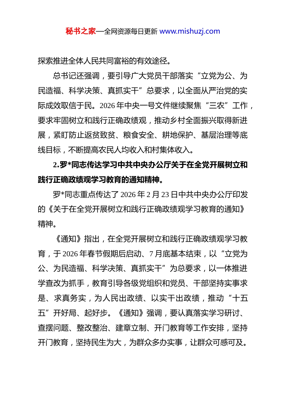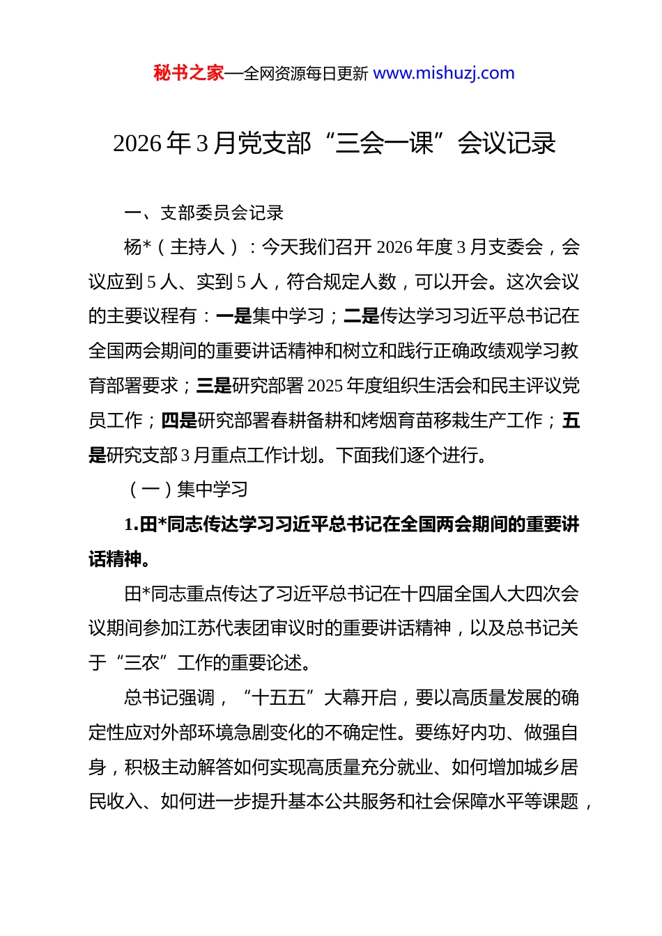 秘书之家—全网资源每日更新 www.mishuzj.com2026 年 3 月党支部“三会一课”会议记录 一、支部委员会记录杨*(主持人):今天我们召开 2026 年度 3 月支委会,会议应到 5 人、实到 5 人,符合规定人数,可以开会。这次会议的主要议程有:一是集中学习;二是传达学习习近平总书记在全国两会期间的重要讲话精神和树立和践行正确政绩观学习教育部署要求;三是研究部署 2025 年度组织生活会和民主评议党员工作;四是研究部署春耕备耕和烤烟育苗移栽生产工作;五是研究支部 3 月重点工作计划。下面我们逐个进行。(一)集中学习1.田*同志传达学习习近平总书记在全国两会期间的重要讲话精神。田*同志重点传达了习近平总书记在十四届全国人大四次会议期间参加江苏代表团审议时的重要讲话精神,以及总书记关于“三农”工作的重要论述。总书记强调,“十五五”大幕开启,要以高质量发展的确定性应对外部环境急剧变化的不确定性。要练好内功、做强自身,积极主动解答如何实现高质量充分就业、如何增加城乡居民收入、如何进一步提升基本公共服务和社会保障水平等课题,秘书之家—全网资源每日更新 www.mishuzj.com探索推进全体人民共同富裕的有效途径。总书记还强调,要引导广大党员干部落实“立党为公、为民造福、科学决策、真抓实干”总要求,以全面从严治党的实际成效取信于民。2026 年中央一号文件继续聚焦“三农”工作,要求牢固树立和践行正确政绩观,推动乡村全面振兴取得新进展,紧盯防止返贫致贫、粮食安全、耕地保护、基层治理等底线目标,不断提高农民人均收入和村集体收入。2.罗*同志传达学习中共中央办公厅关于在全党开展树立和践行正确政绩观学习教育的通知精神。罗*同志重点传达了 2026 年 2 月 23 日中共中央办公厅印发的《关于在全党开展树立和践行正确政绩观学习教育的通知》精神。《通知》指出,在全党开展树立和践行正确政绩观学习教育,于 2026 年春节假期后启动、7 月底基本结束,以“立党为公、为民造福、科学决策、真抓实干”为总要求,以一体推进学查改为抓手,教育引导各级党组织和党员、干部坚持实事求是、求真务实,为人民出政绩、以实干出政绩,推动“十五五”开好局、起好步。《通知》强调,要认真落实学习研讨、查摆问题、整改整治、建章立制、开门教育等工作安排,坚持开门教育,坚持民生为大,为群众多办实事,让群众可感可及。秘书之家—全网资源每日更新 www.mishuzj.com3.向*同志传达学习 2026 年中央一号文件精神。向*同志重点传达了 2026 年中央一号文件关于推动乡村全面振兴的重要部署。文件强调,要牢固树立和践行正确政绩观,以党建引领推动乡村全面振兴,紧紧抓住防止返贫致贫、粮食安全、耕地保护三条底线,持续壮大农村集体经济,不断拓宽农民增收致富渠道。要大力发展特色优势产业,推动农文旅深度融合发展,让农民在产业链上增收致富。要加强农村基层党组织建设,充分发挥党支部的战斗堡垒作用和党员的先锋模范作用,以高质量党建引领高质量乡村振兴。(二)传达学习全国两会精神和树立践行正确政绩观学习教育部署要求杨*(支部书记):习近平总书记在全国两会上的重要讲话和中央一号文件精神,为我们做好农村工作提供了根本遵循。结合我村实际,我就贯彻落实讲几点意见。“十五五”开局之年,我们**村要在乡党委政府的坚强领导下,以树立和践行正确政绩观学习教育为契机,进一步强化党建引领,扎实推进乡村全面振兴。当前,烤烟是我村最重要的支柱产业,也是农民增收最直接、最有效的渠道,3 月正是烤烟育苗移栽的关键时节,支部要带领党员干部冲在生产一线,以实际行动践行正确政绩观,切实把为民造福落实到带领群众秘书之家—全网资源每日更新 www.mishuzj.com增产增收的具体工作中。田*(组织委员):建议支部把学习贯彻全国两会精神与开展树立和践行正确政绩观学习教育有机结合,制定切实可行的工作方案,确保学习教育在我村扎实推进、取得实效。罗*(宣传委员):建议通过村务公开栏、村民微信群等渠道,及时宣传全国两会精神和树立和践行正确政绩观学习教育的重要意义,让党员群众知晓、支持和参与...