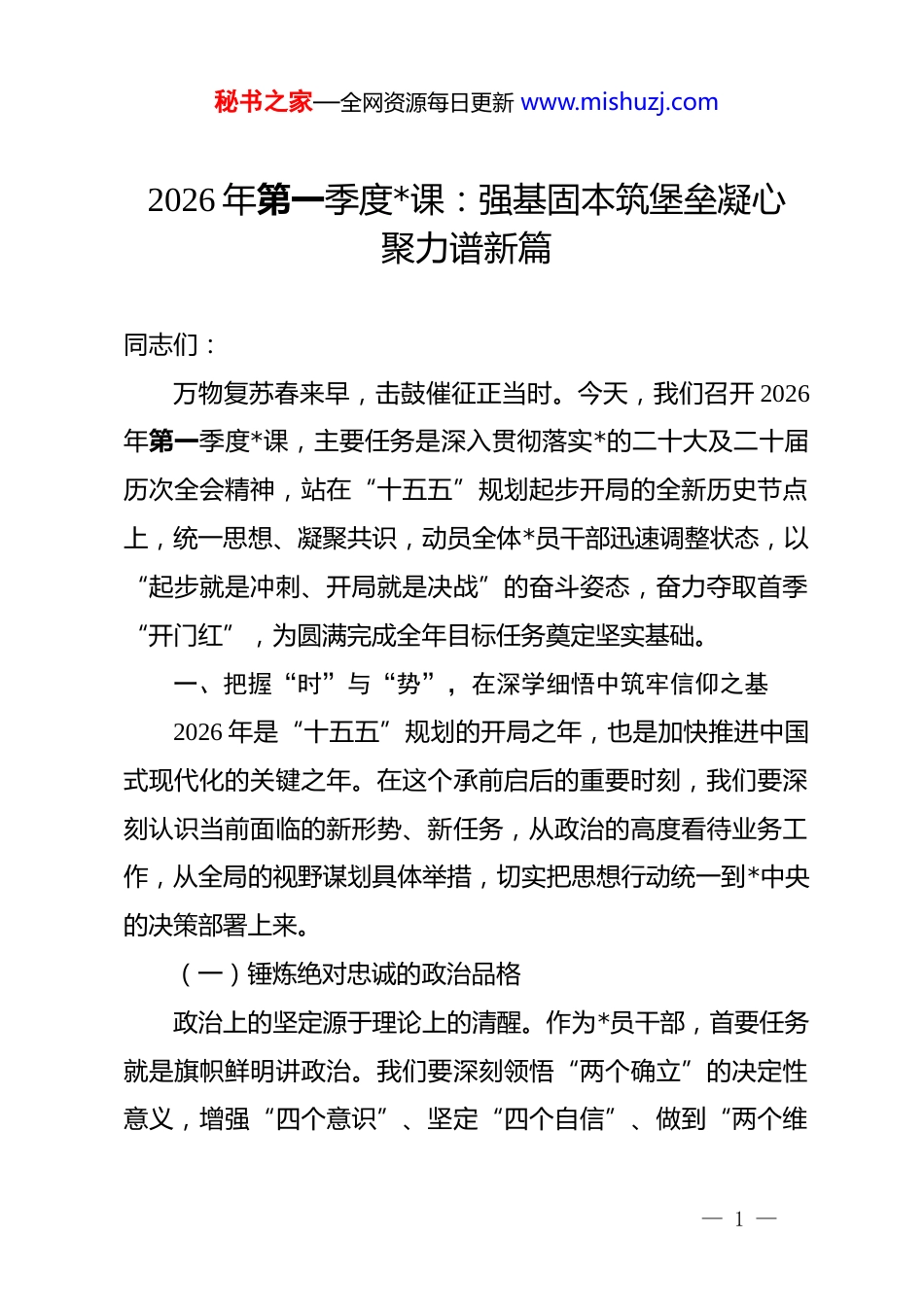 秘书之家—全网资源每日更新 www.mishuzj.com2026 年第一季度*课:强基固本筑堡垒凝心聚力谱新篇同志们:万物复苏春来早,击鼓催征正当时。今天,我们召开 2026年第一季度*课,主要任务是深入贯彻落实*的二十大及二十届历次全会精神,站在“十五五”规划起步开局的全新历史节点上,统一思想、凝聚共识,动员全体*员干部迅速调整状态,以“起步就是冲刺、开局就是决战”的奋斗姿态,奋力夺取首季“开门红”,为圆满完成全年目标任务奠定坚实基础。一、把握“时”与“势”,在深学细悟中筑牢信仰之基2026 年是“十五五”规划的开局之年,也是加快推进中国式现代化的关键之年。在这个承前启后的重要时刻,我们要深刻认识当前面临的新形势、新任务,从政治的高度看待业务工作,从全局的视野谋划具体举措,切实把思想行动统一到*中央的决策部署上来。(一)锤炼绝对忠诚的政治品格政治上的坚定源于理论上的清醒。作为*员干部,首要任务就是旗帜鲜明讲政治。我们要深刻领悟“两个确立”的决定性意义,增强“四个意识”、坚定“四个自信”、做到“两个维— 1 —秘书之家—全网资源每日更新 www.mishuzj.com护”。这绝不是一句空洞的口号,而是要体现在具体的行动中,体现在对*中央决策部署的不折不扣执行上。在第一季度,我们要重点开展“政治体检”,每位*员都要对照*章*规,对照先进典型,反躬自省:在面对急难险重任务时,是否冲锋在前?在面对利益诱惑时,是否坚守底线?我们要通过重温入*誓词、过“政治生日”等仪式感强的活动,不断唤醒入*初心,确保在任何时候、任何情况下,都能听*指挥、为*尽责。要坚决杜绝“低级红”“高级黑”,在言行举止上严守政治纪律和政治规矩,做政治上的明白人、老实人。(二)强化凝心铸魂的理论武装理论武装是 dj 工作的“压舱石”。我们要坚持把学习贯彻**************思想作为首要政治任务,在学懂弄通做实上下功夫。第一季度,我们要依托“三会一课”、主题*日等载体,制定系统的学习计划,重点研读关于高质量发展、新质生产力等方面的最新论述。学习不能搞形式主义,不能满足于“读了”“听了”,更要看“懂没懂”“信没信”“用没用”。我们要大力弘扬理论联系实际的马克思主义学风,坚持问题导向,把学习成果转化为解决实际问题的能力。比如,针对业务工作中遇到的瓶颈问题,我们要从*的创新理论中找方向、找方法、找答案,切实提高运用科学理论指导实践、推动工作的水平。— 2 —秘书之家—全网资源每日更新 www.mishuzj.com要建立学习考勤和成果晾晒机制,每名*员每季度至少撰写一篇高质量的心得体会,确保理论学习入脑入心、见行见效。(三)保持战略清醒的发展定力当前,世界百年未有之大变局加速演进,外部环境的复杂性、严峻性、不确定性上升,但我国经济回升向好、长期向好的基本趋势没有改变。我们要辩证看待当前的形势,既要看到困难和挑战,增强忧患意识;更要看到机遇和优势,增强必胜信心。对于我们单位而言,2026 年面临着新的发展机遇,同时也面临着更加激烈的竞争。我们要保持战略定力,不为一时波动所扰,不为困难险阻所惧,紧紧围绕年初确定的目标任务,一张蓝图绘到底。要善于从宏观政策中捕捉微观机遇,从行业变化中寻找突破口,切实把政策红利转化为发展实效。全体*员干部要树立“一盘棋”思想,无论是业务部门还是职能部门,都要在大局下行动,既各司其职、各负其责,又密切配合、协同作战,形成推动发展的强大合力。二、统筹“破”与“立”,在改革创新中激活发展之源发展出题目,改革做文章。面对新一轮科技革命和产业变革,我们不能因循守旧、固步自封,必须坚持守正创新,统筹好“破”与“立”的关系,以改革的办法解决发展中的问题,以创新的举措培育新的增长点,加快形成新质生产力,推动各— 3 —秘书之家—全网资源每日更新 www.mishuzj.com项工作实现高质量发展。(一)聚焦 dj 融合,破解“两张皮”难题dj 工作做实了就是生产力,做强了就是竞争力。我们要坚决破除“dj 业务两张皮”的陈旧观念,坚持 dj 工作和业务工作一起谋划、一起部署、一起落实、一起考核。首先,要找准融合的切入...