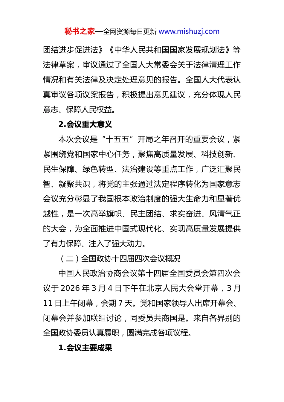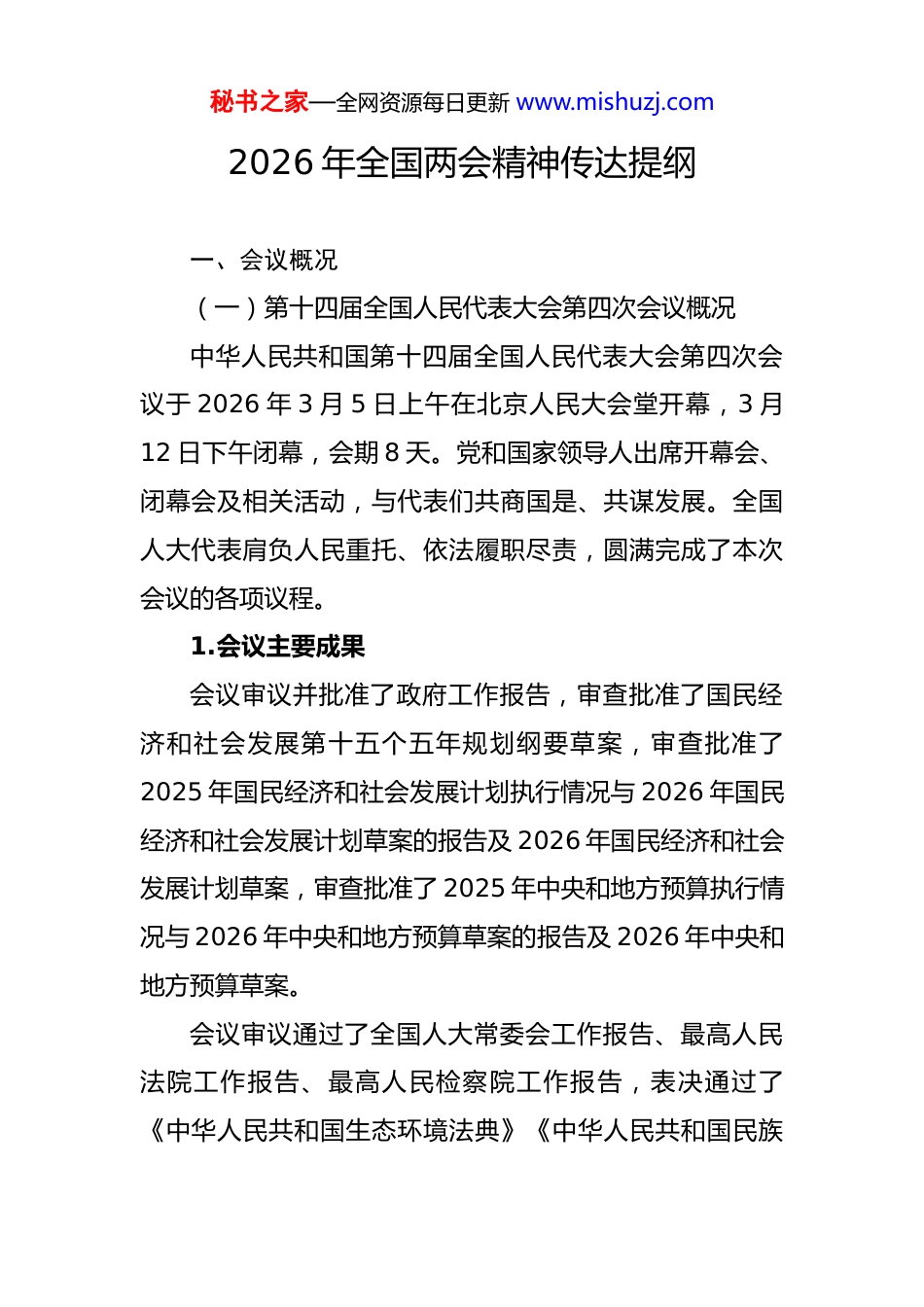 秘书之家—全网资源每日更新 www.mishuzj.com2026 年全国两会精神传达提纲一、会议概况(一)第十四届全国人民代表大会第四次会议概况中华人民共和国第十四届全国人民代表大会第四次会议于 2026 年 3 月 5 日上午在北京人民大会堂开幕,3 月12 日下午闭幕,会期 8 天。党和国家领导人出席开幕会、闭幕会及相关活动,与代表们共商国是、共谋发展。全国人大代表肩负人民重托、依法履职尽责,圆满完成了本次会议的各项议程。1.会议主要成果会议审议并批准了政府工作报告,审查批准了国民经济和社会发展第十五个五年规划纲要草案,审查批准了2025 年国民经济和社会发展计划执行情况与 2026 年国民经济和社会发展计划草案的报告及 2026 年国民经济和社会发展计划草案,审查批准了 2025 年中央和地方预算执行情况与 2026 年中央和地方预算草案的报告及 2026 年中央和地方预算草案。会议审议通过了全国人大常委会工作报告、最高人民法院工作报告、最高人民检察院工作报告,表决通过了《中华人民共和国生态环境法典》《中华人民共和国民族秘书之家—全网资源每日更新 www.mishuzj.com团结进步促进法》《中华人民共和国国家发展规划法》等法律草案,审议通过了全国人大常委会关于法律清理工作情况和有关法律及决定处理意见的报告。全国人大代表认真审议各项议案报告,积极提出意见建议,充分体现人民意志、保障人民权益。2.会议重大意义本次会议是“十五五”开局之年召开的重要会议,紧紧围绕党和国家中心任务,聚焦高质量发展、科技创新、民生保障、绿色转型、法治建设等重点工作,广泛汇聚民智、凝聚共识,将党的主张通过法定程序转化为国家意志会议充分彰显了我国根本政治制度的强大生命力和显著优越性,是一次高举旗帜、民主团结、求实奋进、风清气正的大会,为全面推进中国式现代化、实现高质量发展提供了有力保障、注入了强大动力。(二)全国政协十四届四次会议概况中国人民政治协商会议第十四届全国委员会第四次会议于 2026 年 3 月 4 日下午在北京人民大会堂开幕,3 月11 日上午闭幕,会期 7 天。党和国家领导人出席开幕会、闭幕会并参加联组讨论,同委员共商国是。来自各界别的全国政协委员认真履职,圆满完成各项议程。1.会议主要成果秘书之家—全网资源每日更新 www.mishuzj.com会议审议批准王沪宁代表政协第十四届全国委员会常务委员会所作工作报告,审议批准何报翔所作提案工作情况报告。委员们列席第十四届全国人民代表大会第四次会议,听取并讨论李强所作政府工作报告,讨论国民经济和社会发展第十五个五年规划纲要草案,听取并讨论最高人民法院工作报告、最高人民检察院工作报告,讨论生态环境法典草案、民族团结进步促进法草案、国家发展规划法草案及其他有关报告等,表示赞同并提出意见和建议。2.会议重大意义本次会议是“十五五”开局之年召开的重要会议,紧扣党和国家中心任务,聚焦高质量发展、科技创新、民生保障、绿色转型等重点议题,广泛凝聚共识、汇聚力量。会议充分彰显专门协商机构作用,是一次高举旗帜、凝心聚力、求实奋进、风清气正的大会,为推进中国式现代化汇聚了智慧与力量。二、习近平总书记在两会期间系列重要讲话精神(一)习近平总书记参加江苏代表团审议时的重要讲话精神习近平指出,发展新质生产力对于推动高质量发展、增强经济竞争力至关重要,江苏这方面基础较好,要努力走在前列。要一体推进教育科技人才发展,力争在加强原秘书之家—全网资源每日更新 www.mishuzj.com始创新和关键核心技术攻关、抢占科技制高点上实现新突破,在促进创新链产业链资金链人才链深度融合、推动科技成果高效转化应用上探索新途径,在优化提升传统产业培育壮大新兴产业、超前布局未来产业上开创新局面,在进一步深化改革、破除制约新质生产力发展的体制机制障碍上取得新成果。习近平强调,经济大省发展底盘稳、抵御外部冲击能力强,才能支撑全国经济大盘稳定。江苏要在增强经济韧性上持续用力。要练好内功、做强自身,全面融入全国统一大市场,助力畅通国内大循环。要扩大高水平对外开放广泛开拓全球市场,更好联通国际循环。...