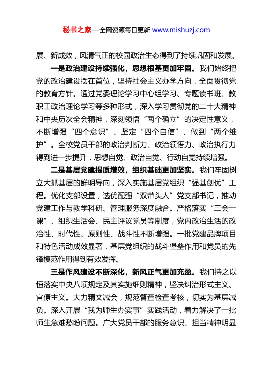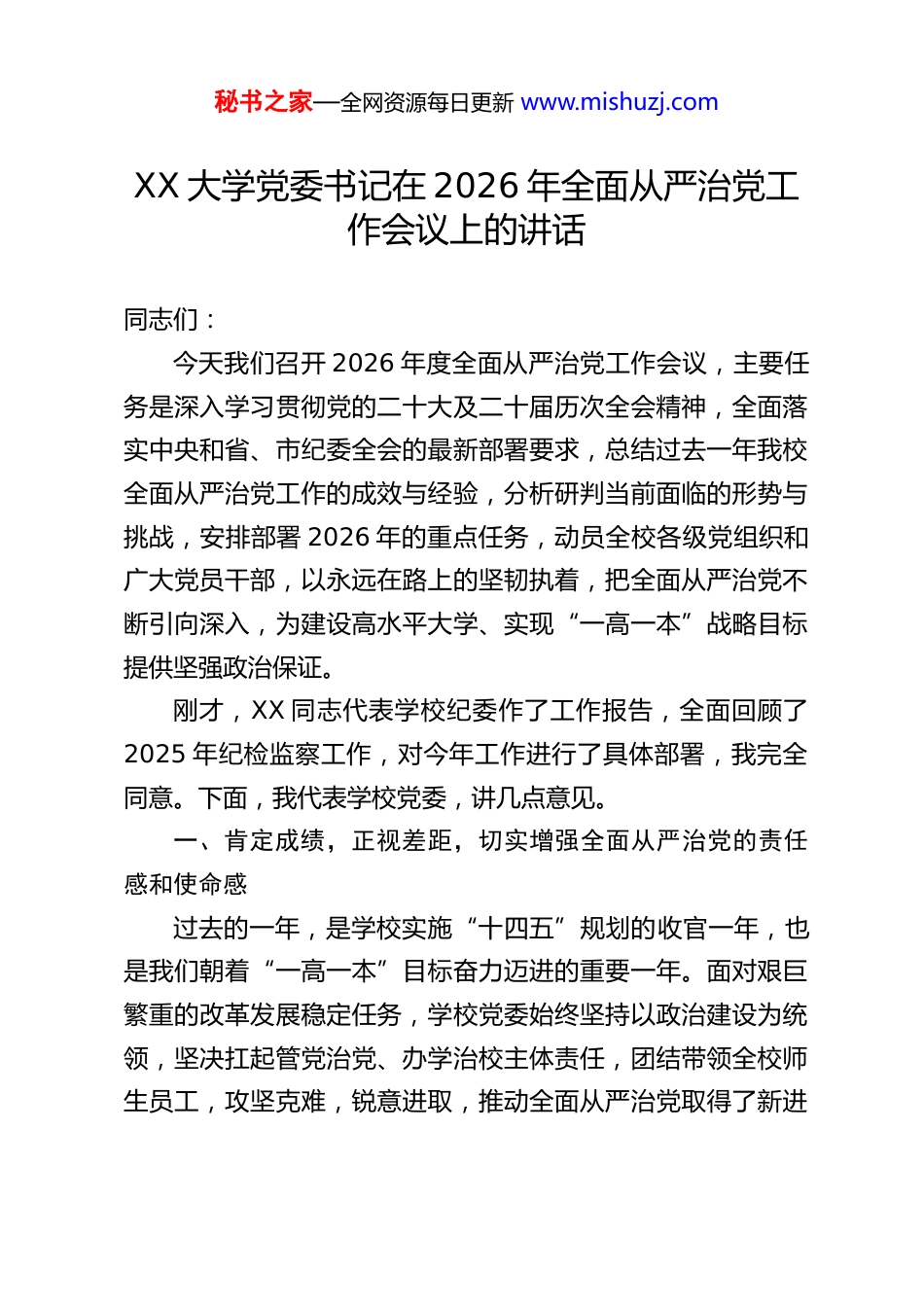 秘书之家—全网资源每日更新 www.mishuzj.comXX 大学党委书记在 2026 年全面从严治党工作会议上的讲话同志们:今天我们召开 2026 年度全面从严治党工作会议,主要任务是深入学习贯彻党的二十大及二十届历次全会精神,全面落实中央和省、市纪委全会的最新部署要求,总结过去一年我校全面从严治党工作的成效与经验,分析研判当前面临的形势与挑战,安排部署 2026 年的重点任务,动员全校各级党组织和广大党员干部,以永远在路上的坚韧执着,把全面从严治党不断引向深入,为建设高水平大学、实现“一高一本”战略目标提供坚强政治保证。刚才,XX 同志代表学校纪委作了工作报告,全面回顾了2025 年纪检监察工作,对今年工作进行了具体部署,我完全同意。下面,我代表学校党委,讲几点意见。一、肯定成绩,正视差距,切实增强全面从严治党的责任感和使命感过去的一年,是学校实施“十四五”规划的收官一年,也是我们朝着“一高一本”目标奋力迈进的重要一年。面对艰巨繁重的改革发展稳定任务,学校党委始终坚持以政治建设为统领,坚决扛起管党治党、办学治校主体责任,团结带领全校师生员工,攻坚克难,锐意进取,推动全面从严治党取得了新进秘书之家—全网资源每日更新 www.mishuzj.com展、新成效,风清气正的校园政治生态得到了持续巩固和发展。一是政治建设持续强化,思想根基更加牢固。我们始终把党的政治建设摆在首位,坚持社会主义办学方向,全面贯彻党的教育方针。通过党委理论学习中心组学习、专题读书班、教职工政治理论学习等多种形式,深入学习贯彻党的二十大精神和中央历次全会精神,深刻领悟“两个确立”的决定性意义,不断增强“四个意识”、坚定“四个自信”、做到“两个维护”。全校党员干部的政治判断力、政治领悟力、政治执行力得到进一步提升,思想自觉、政治自觉、行动自觉持续增强。二是基层党建提质增效,组织基础更加坚实。我们牢固树立大抓基层的鲜明导向,深入实施基层党组织“强基创优”工程。优化支部设置,选优配强“双带头人”党支部书记,推动党建工作与教学科研、管理服务深度融合。严格落实“三会一课”、组织生活会、民主评议党员等制度,党内政治生活的政治性、时代性、原则性、战斗性不断增强。一批党建品牌项目和特色活动成效显著,基层党组织的战斗堡垒作用和党员的先锋模范作用得到有效发挥。三是作风建设不断深化,新风正气更加充盈。我们持之以恒落实中央八项规定及其实施细则精神,坚决纠治形式主义、官僚主义。大力精文减会,规范督查检查考核,切实为基层减负。深入开展“我为师生办实事”实践活动,着力解决了一批师生急难愁盼问题。广大党员干部的服务意识、担当精神明显秘书之家—全网资源每日更新 www.mishuzj.com增强,求真务实、清正廉洁的新风正气在校园蔚然成风。四是纪律建设扎实推进,监督执纪更加精准。我们坚持把纪律规矩挺在前面,深化运用监督执纪“四种形态”,特别是用好用足“第一种形态”,抓早抓小、防微杜渐。加强廉政风险排查防控,完善重点领域和关键环节的监督机制。支持纪委履行监督责任,强化政治监督,做实日常监督。严肃查处违纪违法问题,持续释放越往后执纪越严的强烈信号,不敢腐、不能腐、不想腐的体制机制一体推进。五是责任落实更加有力,工作格局更加完善。我们健全完善“党委统一领导、党政齐抓共管、纪委组织协调、部门各负其责、依靠师生支持”的全面从严治党领导体制和工作机制。党委书记认真履行第一责任人职责,班子成员严格落实“一岗双责”,各级党组织书记切实担负起主体责任,层层传导压力,级级压实责任,形成了齐抓共管、协同推进的良好工作格局。在肯定成绩的同时,我们也要清醒地认识到,对照上级的要求,对照师生员工的期盼,对照建设高水平大学的目标,我校全面从严治党工作还存在一些差距和不足。主要表现在:一是在政治建设方面,个别党组织和党员干部的政治敏锐性和政治鉴别力还不够强,理论学习与工作实际结合不够紧密,用党的创新理论指导实践、推动工作的能力有待进一步提升。二是在责任落实方面,压力传导存在逐级递减现象,个别基层党组织和领导干部对全面从严治党...