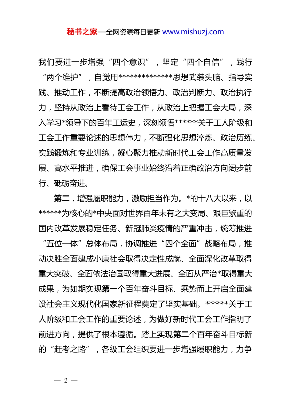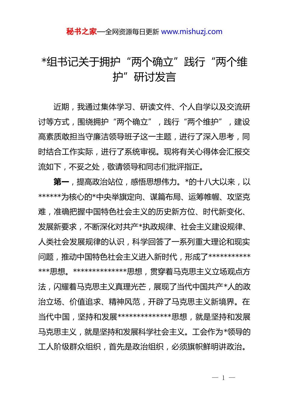 秘书之家—全网资源每日更新 www.mishuzj.com*组书记关于拥护“两个确立”践行“两个维护”研讨发言近期,我通过集体学习、研读文件、个人自学以及交流研讨等方式,围绕拥护“两个确立”,践行“两个维护”,建设高素质敢担当守廉洁领导班子这一主题,进行了深入思考,同时结合工作实际,进行了系统审视。现将有关心得体会汇报交流如下,不妥之处,敬请领导和同志们批评指正。第一,提高政治站位,感悟思想伟力。*的十八大以来,以******为核心的*中央举旗定向、谋篇布局、运筹帷幄、攻坚克难,准确把握中国特色社会主义的历史新方位、时代新变化、发展新要求,不断深化对共产*执政规律、社会主义建设规律、人类社会发展规律的认识,科学回答了一系列重大理论和现实问题,推动中国特色社会主义进入新时代,形成了**************思想。**************思想,贯穿着马克思主义立场观点方法,闪耀着马克思主义真理光芒,展现了当代中国共产*人的政治立场、价值追求、精神风范,开辟了马克思主义新境界。在当代中国,坚持和发展**************思想,就是坚持和发展马克思主义,就是坚持和发展科学社会主义。工会作为*领导的工人阶级群众组织,首先是政治组织,必须旗帜鲜明讲政治。— 1 —秘书之家—全网资源每日更新 www.mishuzj.com我们要进一步增强“四个意识”,坚定“四个自信”,践行“两个维护”,自觉用**************思想武装头脑、指导实践、推动工作,不断提高政治领悟力、政治判断力、政治执行力,坚持从政治上看待工会工作,从政治上把握工会大局,深入学习*领导下的百年工运史,深刻领悟******关于工人阶级和工会工作重要论述的思想伟力,不断强化思想淬炼、政治历练、实践锻炼和专业训练,凝心聚力推动新时代工会工作高质量发展、高水平推进,确保工会事业始终沿着正确政治方向阔步前行、砥砺奋进。第二,增强履职能力,激励担当作为。*的十八大以来,以******为核心的*中央面对世界百年未有之大变局、艰巨繁重的国内改革发展稳定任务、新冠肺炎疫情的严重冲击,统筹推进“五位一体”总体布局,协调推进“四个全面”战略布局,推动决胜全面建成小康社会取得决定性成就、全面深化改革取得重大突破、全面依法治国取得重大进展、全面从严治*取得重大成果,为如期实现第一个百年奋斗目标、乘势而上开启全面建设社会主义现代化国家新征程奠定了坚实基础。******关于工人阶级和工会工作的重要论述,为做好新时代工会工作指明了前进方向,提供了根本遵循。踏上实现第二个百年奋斗目标新的“赶考之路”,各级工会组织要进一步增强履职能力,力争— 2 —秘书之家—全网资源每日更新 www.mishuzj.com取得优异成绩;面对“十四五”时期艰巨复杂的改革发展稳定任务,各级工会组织要进一步砥砺责任担当,充分彰显奉献作为。我们要自觉站位新发展阶段,深入贯彻新发展理念,着力构筑新发展格局,模范践行以人民为中心的发展思想,进一步增强各级工会组织宗旨意识,全心全意为职工群众服务,以增强政治性、先进性、群众性为导向,以推动高质量发展为主题,统筹抓实抓好职工思想政治引领、产业工人队伍建设改革、维权服务质量提升、新就业形态劳动者权益保障、深化工会改革等重点任务,常态化讲好劳模故事、劳动故事、工匠故事,让工会改革发展创新工作成果更多、更好、更公平惠及全市工会职工和人民群众。第三,砥砺工作作风,强化自身建设。*的十八大以来,以******为核心的*中央围绕全面从严治*重大课题,以刀刃向内、自我革命的鲜明态度,踏石留印、抓铁有痕的毅力决心,革故鼎新、永葆初心的责任担当,牢牢把握加强执政能力建设和先进性、纯洁性建设这条主线,坚持思想建*为根本、从严治吏为重点、改进作风为突破、反腐肃贪为要务、制度治*为保障,统揽推进*的建设伟大工程并取得显著成效。从“八项规定”到*的群众路线教育实践活动,从“三严三实”专题教育到“两学一做”学习教育,从“不忘初心、牢记使命”zt 教育到*史学习— 3 —秘书之家—全网资源每日更新 www.mishuzj.com教育,一以贯之地体现了我们*自我净化、自我完善、自我革新、自我提高的政治自觉和行动自觉...