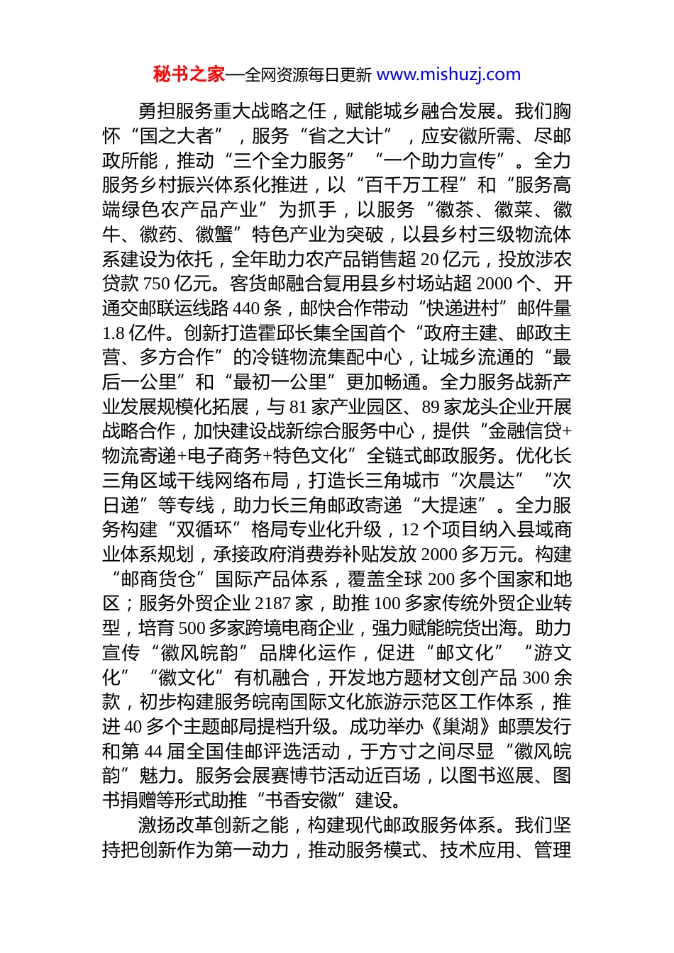秘书之家—全网资源每日更新 www.mishuzj.com第 56 届世界邮政日致辞:践行初心使命 谱写为民新篇在全国上下喜迎中华人民共和国成立 76 周年之际,我们迎来了第 56 届世界邮政日。在此,我谨代表中国邮政集团有限公司安徽省分公司,向长期以来关心支持安徽邮政事业发展的各级党委政府、社会各界朋友致以最诚挚的感谢!向全省邮政干部员工、离退休老同志致以节日的祝贺和崇高的敬意!中国邮政始终坚守“人民邮政为人民”的初心使命,在助力公共服务均等化、畅通经济循环、促进要素流通等方面发挥着不可替代的重要作用。作为中国邮政在皖分支机构,过去一年,安徽邮政坚持以习近平新时代中国特色社会主义思想为指导,深入学习贯彻党的二十大和二十届二中、三中全会精神以及习近平总书记考察安徽重要讲话精神,紧紧围绕集团公司发展战略和安徽打造“三地一区”战略定位,持续打造核心竞争优势,加快推进战略任务落地,守正创新、应需尽能、见行见效,为奋力谱写中国式现代化安徽篇章贡献了邮政力量。恪守普遍服务之责,厚植民生发展基础。我们坚持普遍服务优先投入、优先保障、优先发展,重点普服指标全面达标。全省乡镇局所覆盖率、建制村直接通邮率、营业时长达标率、县及县以上城市党政机关《人民日报》《安徽日报》当日见报率均保持 100%。机要通信连续 34 年万无一失。我们全面深化网点转型,丰富普遍服务内涵,网点业态日益丰富。全省 344 个网点叠加 11 大类 95 项高频政务便民服务,助力群众“少跑腿,一次办”。建设就业、社保、工会、健康等公益驿站,积极拓展助军、助学、助农、助困等公益服务,进一步兜牢民生保障底线。秘书之家—全网资源每日更新 www.mishuzj.com勇担服务重大战略之任,赋能城乡融合发展。我们胸怀“国之大者”,服务“省之大计”,应安徽所需、尽邮政所能,推动“三个全力服务”“一个助力宣传”。全力服务乡村振兴体系化推进,以“百千万工程”和“服务高端绿色农产品产业”为抓手,以服务“徽茶、徽菜、徽牛、徽药、徽蟹”特色产业为突破,以县乡村三级物流体系建设为依托,全年助力农产品销售超 20 亿元,投放涉农贷款 750 亿元。客货邮融合复用县乡村场站超 2000 个、开通交邮联运线路 440 条,邮快合作带动“快递进村”邮件量1.8 亿件。创新打造霍邱长集全国首个“政府主建、邮政主营、多方合作”的冷链物流集配中心,让城乡流通的“最后一公里”和“最初一公里”更加畅通。全力服务战新产业发展规模化拓展,与 81 家产业园区、89 家龙头企业开展战略合作,加快建设战新综合服务中心,提供“金融信贷+物流寄递+电子商务+特色文化”全链式邮政服务。优化长三角区域干线网络布局,打造长三角城市“次晨达”“次日递”等专线,助力长三角邮政寄递“大提速”。全力服务构建“双循环”格局专业化升级,12 个项目纳入县域商业体系规划,承接政府消费券补贴发放 2000 多万元。构建“邮商货仓”国际产品体系,覆盖全球 200 多个国家和地区;服务外贸企业 2187 家,助推 100 多家传统外贸企业转型,培育 500 多家跨境电商企业,强力赋能皖货出海。助力宣传“徽风皖韵”品牌化运作,促进“邮文化”“游文化”“徽文化”有机融合,开发地方题材文创产品 300 余款,初步构建服务皖南国际文化旅游示范区工作体系,推进 40 多个主题邮局提档升级。成功举办《巢湖》邮票发行和第 44 届全国佳邮评选活动,于方寸之间尽显“徽风皖韵”魅力。服务会展赛博节活动近百场,以图书巡展、图书捐赠等形式助推“书香安徽”建设。激扬改革创新之能,构建现代邮政服务体系。我们坚持把创新作为第一动力,推动服务模式、技术应用、管理秘书之家—全网资源每日更新 www.mishuzj.com机制全方位升级,加快培育新质生产力,跑出“智慧邮政”加速度。自主研发服务乡村振兴管理系统、寄递“次晨达”平台、金融智能报表等系统,数字邮政建设迈出新步伐。依托数字寄递科技创新基地,打造合肥邮区中心全感知、全可视、全智能的数字化处理中心。先行先试无人化技术应用,投放无人车 181 辆、建设无人驿站 91 个、开通无人机邮路 8...