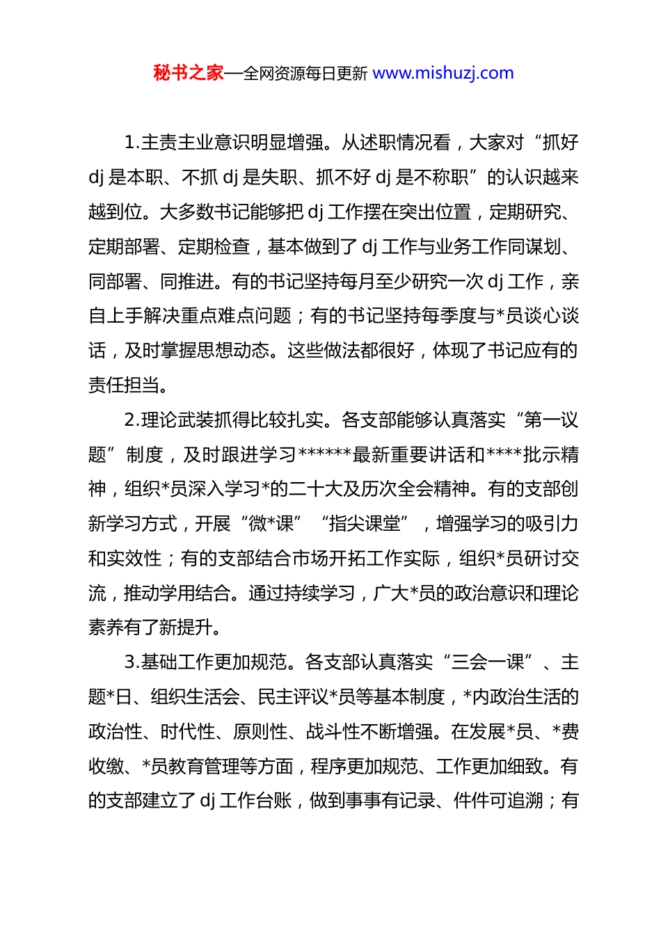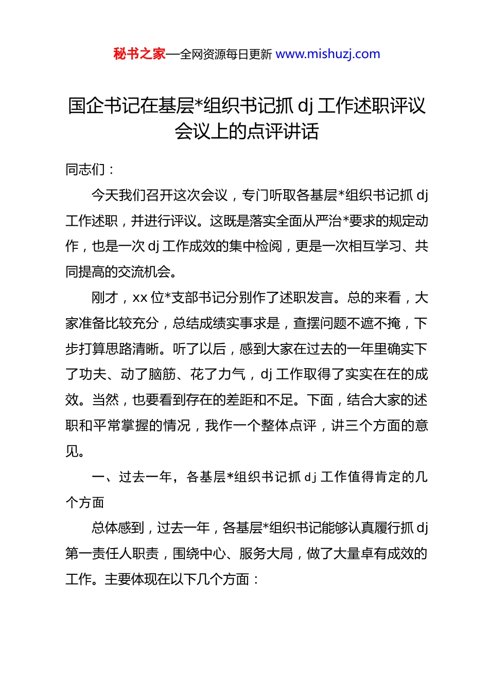 秘书之家—全网资源每日更新 www.mishuzj.com国企书记在基层*组织书记抓 dj 工作述职评议会议上的点评讲话同志们:今天我们召开这次会议,专门听取各基层*组织书记抓 dj工作述职,并进行评议。这既是落实全面从严治*要求的规定动作,也是一次 dj 工作成效的集中检阅,更是一次相互学习、共同提高的交流机会。刚才,xx 位*支部书记分别作了述职发言。总的来看,大家准备比较充分,总结成绩实事求是,查摆问题不遮不掩,下步打算思路清晰。听了以后,感到大家在过去的一年里确实下了功夫、动了脑筋、花了力气,dj 工作取得了实实在在的成效。当然,也要看到存在的差距和不足。下面,结合大家的述职和平常掌握的情况,我作一个整体点评,讲三个方面的意见。一、过去一年,各基层*组织书记抓 dj 工作值得肯定的几个方面总体感到,过去一年,各基层*组织书记能够认真履行抓 dj第一责任人职责,围绕中心、服务大局,做了大量卓有成效的工作。主要体现在以下几个方面:秘书之家—全网资源每日更新 www.mishuzj.com1.主责主业意识明显增强。从述职情况看,大家对“抓好dj 是本职、不抓 dj 是失职、抓不好 dj 是不称职”的认识越来越到位。大多数书记能够把 dj 工作摆在突出位置,定期研究、定期部署、定期检查,基本做到了 dj 工作与业务工作同谋划、同部署、同推进。有的书记坚持每月至少研究一次 dj 工作,亲自上手解决重点难点问题;有的书记坚持每季度与*员谈心谈话,及时掌握思想动态。这些做法都很好,体现了书记应有的责任担当。2.理论武装抓得比较扎实。各支部能够认真落实“第一议题”制度,及时跟进学习******最新重要讲话和****批示精神,组织*员深入学习*的二十大及历次全会精神。有的支部创新学习方式,开展“微*课”“指尖课堂”,增强学习的吸引力和实效性;有的支部结合市场开拓工作实际,组织*员研讨交流,推动学用结合。通过持续学习,广大*员的政治意识和理论素养有了新提升。3.基础工作更加规范。各支部认真落实“三会一课”、主题*日、组织生活会、民主评议*员等基本制度,*内政治生活的政治性、时代性、原则性、战斗性不断增强。在发展*员、*费收缴、*员教育管理等方面,程序更加规范、工作更加细致。有的支部建立了 dj 工作台账,做到事事有记录、件件可追溯;有秘书之家—全网资源每日更新 www.mishuzj.com的支部规范*员发展流程,严把入口关,保证发展质量。4.dj 与业务融合有了新探索。各支部能够围绕市场开拓中心任务,积极探索 dj 与业务融合的有效途径。有的支部在重点项目组建*员突击队,在急难险重任务中发挥*员作用;有的支部开展“*员示范岗”创建活动,引导*员在岗位上亮身份、作表率;有的支部与重要客户开展 dj 联建活动,以 dj 交流促进业务合作。这些探索虽然还处在初级阶段,但方向是对的,要继续深化。5.服务职工群众用心用力。各支部能够坚持以职工为中心的发展思想,认真倾听职工呼声,积极回应职工关切,努力解决职工实际困难。有的支部建立困难职工帮扶机制,及时送去组织温暖;有的支部开展丰富多彩的文体活动,营造团结和谐的氛围;有的支部关注青年职工成长,帮助他们解决工作生活中的问题。通过这些实实在在的工作,*组织的凝聚力和向心力不断增强。在此,我代表公司*委,对各位书记过去一年的辛勤付出表示衷心的感谢!二、存在的问题和不足在肯定成绩的同时,我们也要清醒地看到工作中存在的差距和不足。结合大家的述职和平常掌握的情况,我梳理了几个秘书之家—全网资源每日更新 www.mishuzj.com共性问题:1.dj 责任落实还不够到位。有的书记对 dj 工作思想上重视,但行动上不够有力,存在“说起来重要、做起来次要、忙起来不要”的现象。有的书记把 dj 工作交给副书记或*务干事,自己当“甩手掌柜”。有的书记对 dj 工作研究不深、思考不多,满足于按部就班、照搬照抄。有的书记对*员教育管理抓得不严,对苗头性、倾向性问题发现不及时、提醒不到位。2.理论学习深度还不够。有的支部学习形式单一,念文件、读报纸多,深入研讨、交流体会少,学习效果打了折扣。有的*员学习存在“实用主义”倾...