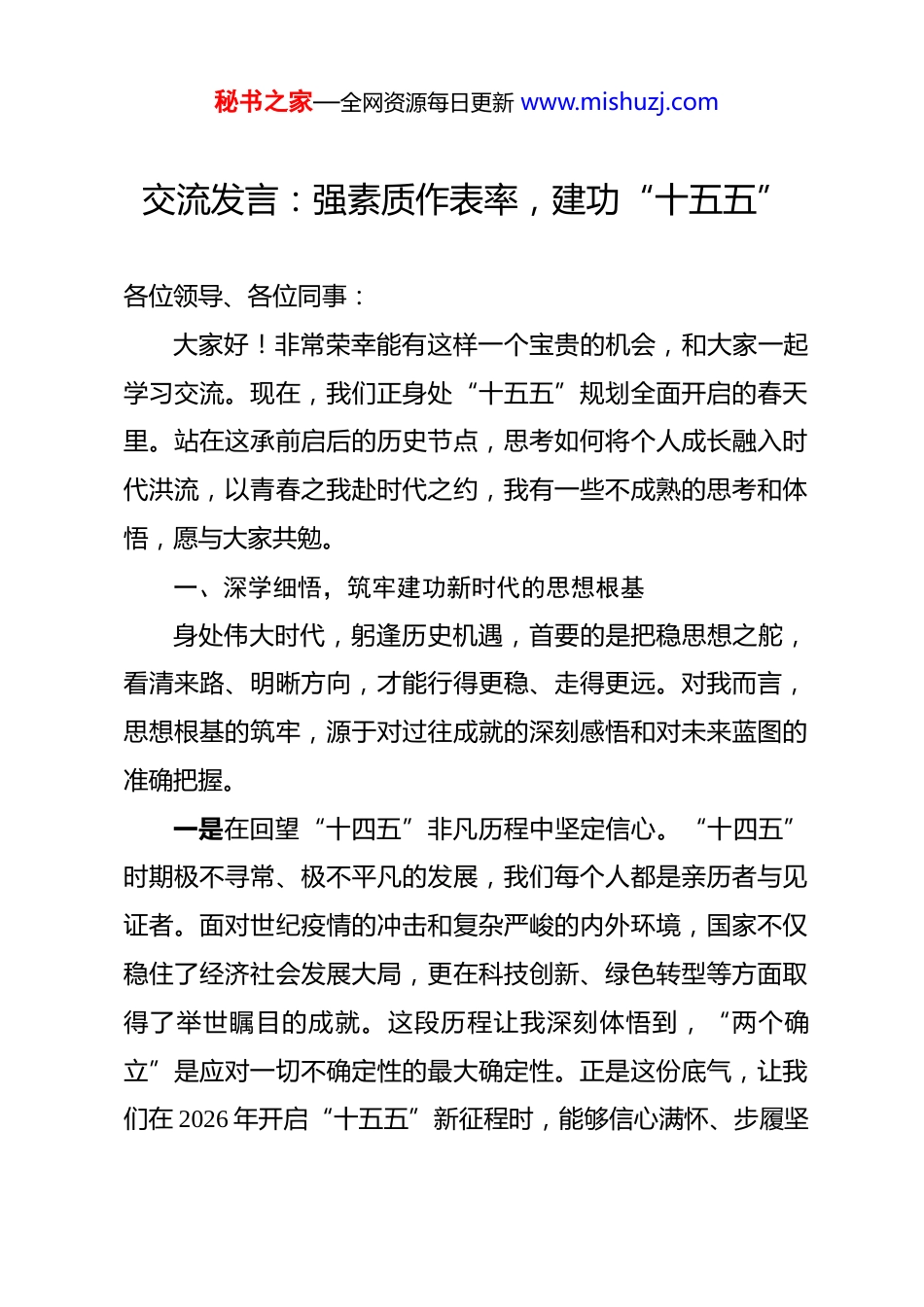 秘书之家—全网资源每日更新 www.mishuzj.com交流发言:强素质作表率,建功“十五五” 各位领导、各位同事:大家好!非常荣幸能有这样一个宝贵的机会,和大家一起学习交流。现在,我们正身处“十五五”规划全面开启的春天里。站在这承前启后的历史节点,思考如何将个人成长融入时代洪流,以青春之我赴时代之约,我有一些不成熟的思考和体悟,愿与大家共勉。一、深学细悟,筑牢建功新时代的思想根基身处伟大时代,躬逢历史机遇,首要的是把稳思想之舵,看清来路、明晰方向,才能行得更稳、走得更远。对我而言,思想根基的筑牢,源于对过往成就的深刻感悟和对未来蓝图的准确把握。一是在回望“十四五”非凡历程中坚定信心。“十四五”时期极不寻常、极不平凡的发展,我们每个人都是亲历者与见证者。面对世纪疫情的冲击和复杂严峻的内外环境,国家不仅稳住了经济社会发展大局,更在科技创新、绿色转型等方面取得了举世瞩目的成就。这段历程让我深刻体悟到,“两个确立”是应对一切不确定性的最大确定性。正是这份底气,让我们在 2026 年开启“十五五”新征程时,能够信心满怀、步履坚秘书之家—全网资源每日更新 www.mishuzj.com实。二是在学习“十五五”宏伟蓝图中校准航向。党的二十届四中全会为未来五年乃至更长时期的发展擘画了清晰的路线图。学习全会精神,我有一个很深的感触,就是“中国式长期主义”的战略智慧与定力。规划一以贯之的主题,是一代接着一代干的恒心与韧劲。特别是规划将科技创新置于核心地位,旨在攻克“卡脖子”技术、培育新质生产力,聚焦人工智能、量子信息、生命科学等未来产业重点领域。这启示我,个人的奋斗必须与国家战略同频共振,找准自身定位,才能在服务大局中实现价值。三是在融入**“支点”建设中找准定位。宏伟蓝图的实现,最终要落到一域一地的具体实践中。**省正全力推进的“支点”建设,就是我们将国家战略转化为地方行动的关键牵引。作为身处其中的一名年轻干部,我深感责任重大。这要求我必须跳出个人的一亩三分地,站位全局思考问题,自觉将本职工作与“支点”建设的目标任务紧密结合,在服务**高质量发展的壮阔征程中,找准自己的坐标,贡献绵薄之力。二、勤学苦练,夯实建功新征程的过硬本领蓝图绘就,关键在落实;重任在肩,根本靠本领。“十五五”时期是基本实现社会主义现代化夯实基础、全面发力的关秘书之家—全网资源每日更新 www.mishuzj.com键五年,对干部能力素质提出了新的更高要求。面对新形势新任务,唯有勤学不辍、苦练内功,才能不负时代、不负韶华。一是在深耕主业中锤炼专业素养。打铁必须自身硬。近年来,全省深入推进“干部素质提升年”,营造了比学赶超、争先进位的浓厚氛围。进入 2026 年,我注意到干部素质提升的方式方法更加精准务实,各地纷纷推出岗位胜任能力培训、人工智能通识素养培训、强化一线实践历练等一系列新举措。这提醒我,必须克服本领恐慌,把学习作为一种生活态度和政治责任,钻研业务知识,熟悉政策法规,努力成为本职岗位的“行家里手”,把学历变能力、把经历变经验,在平凡岗位上做出不平凡的业绩。二是在应对挑战中提升综合能力。当前发展面临的环境更趋复杂,工作中时常会遇到“一难两难多难”“既要又要还要”的复杂局面。这考验的不仅仅是业务能力,更是系统观念、辩证思维和统筹协调的综合能力。特别是随着“十五五”规划的深入实施,许多工作都是开创性的,没有现成经验可循。这就要求我必须主动跳出舒适区,敢于到急难险重的任务中去磨砺,在处理复杂问题、应对风险挑战的实践中,不断提升政治判断力、政治领悟力、政治执行力,锻造能扛重活、敢打硬仗的“宽肩膀”秘书之家—全网资源每日更新 www.mishuzj.com三是在服务群众中砥砺实干作风。我们一切工作的出发点和落脚点,都是为了人民。衡量能力高低、作风好坏的最终标尺,是群众的口碑。2026 年以来,一个明显的趋势是干部考核评价体系更加注重实绩,特别是将群众满意度作为核心指标,不合格者甚至会被召回调整。这促使我时刻反思,自己的工作是否真正接了地气、惠及了民生。我将始终牢记单位的政治属性,当好委员的“服务...