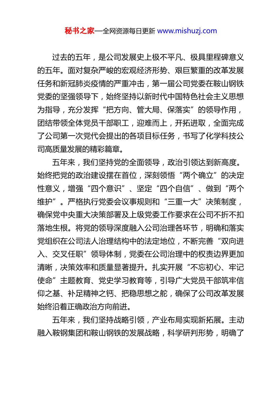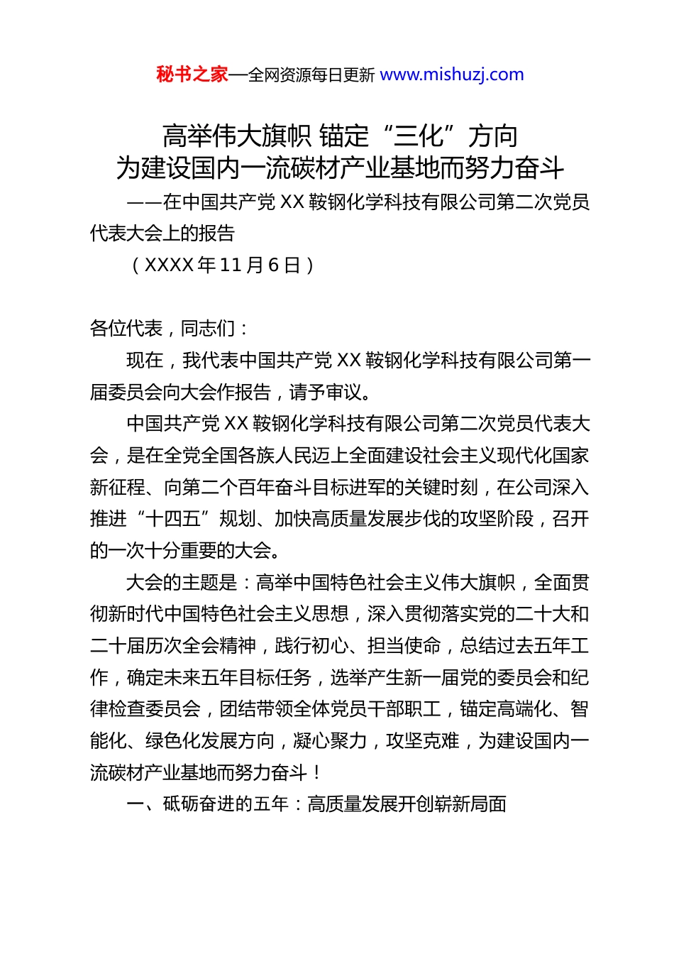 秘书之家—全网资源每日更新 www.mishuzj.com高举伟大旗帜 锚定“三化”方向为建设国内一流碳材产业基地而努力奋斗——在中国共产党 XX 鞍钢化学科技有限公司第二次党员代表大会上的报告(XXXX 年 11 月 6 日)各位代表,同志们:现在,我代表中国共产党 XX 鞍钢化学科技有限公司第一届委员会向大会作报告,请予审议。中国共产党 XX 鞍钢化学科技有限公司第二次党员代表大会,是在全党全国各族人民迈上全面建设社会主义现代化国家新征程、向第二个百年奋斗目标进军的关键时刻,在公司深入推进“十四五”规划、加快高质量发展步伐的攻坚阶段,召开的一次十分重要的大会。大会的主题是:高举中国特色社会主义伟大旗帜,全面贯彻新时代中国特色社会主义思想,深入贯彻落实党的二十大和二十届历次全会精神,践行初心、担当使命,总结过去五年工作,确定未来五年目标任务,选举产生新一届党的委员会和纪律检查委员会,团结带领全体党员干部职工,锚定高端化、智能化、绿色化发展方向,凝心聚力,攻坚克难,为建设国内一流碳材产业基地而努力奋斗!一、砥砺奋进的五年:高质量发展开创崭新局面秘书之家—全网资源每日更新 www.mishuzj.com过去的五年,是公司发展史上极不平凡、极具里程碑意义的五年。面对复杂严峻的宏观经济形势、艰巨繁重的改革发展任务和新冠肺炎疫情的严重冲击,第一届公司党委在鞍山钢铁党委的坚强领导下,始终坚持以新时代中国特色社会主义思想为指导,充分发挥“把方向、管大局、保落实”的领导作用,团结带领全体党员干部职工,迎难而上,开拓进取,全面完成了公司第一次党代会提出的各项目标任务,书写了化学科技公司高质量发展的精彩篇章。五年来,我们坚持党的全面领导,政治引领达到新高度。始终把党的政治建设摆在首位,深刻领悟“两个确立”的决定性意义,增强“四个意识”、坚定“四个自信”、做到“两个维护”。严格执行党委会议事规则和“三重一大”决策制度,确保党中央重大决策部署及上级党委工作要求在公司不折不扣落地生根。将党的领导深度融入公司治理各环节,明确和落实党组织在公司法人治理结构中的法定地位,不断完善“双向进入、交叉任职”领导体制,党委在公司治理中的权责边界更加清晰,决策效率和质量显著提升。扎实开展“不忘初心、牢记使命”主题教育、党史学习教育等,引导广大党员干部筑牢信仰之基、补足精神之钙、把稳思想之舵,确保了公司改革发展始终沿着正确政治方向前进。五年来,我们坚持战略引领,产业布局实现新拓展。主动融入鞍钢集团和鞍山钢铁的发展战略,科学研判形势,明确了秘书之家—全网资源每日更新 www.mishuzj.com打造国内一流碳材产业基地的宏伟目标。通过强化生产运营管理,焦油加工规模稳步提升 13%,粗苯加工能力提高 3%。市场营销成果丰硕,客户群体由过去的几十家增长到 130 余家,东北区域市场占有率稳固在 80%以上,形成了较强的区域市场话语权。国际化经营迈出坚实步伐,精萘、工业萘等产品成功打入巴西、韩国、泰国等国际市场,中温沥青产品实现出口“零的突破”,公司品牌国际影响力初步显现。特别是坚决落实鞍钢集团碳材产业专业化整合战略部署,取得了突破性进展:成功实现对本钢 50%以上化产资源的回运加工,完成对凌钢100%相关资源的整合,并在西南地区战略布局,成立四川绿鑫鼎碳业有限公司,初步构建了辐射“鞍、本、凌、攀”的跨区域产业布局,为公司长远发展打开了广阔空间,资产总值较五年前增加 10.26 亿元。五年来,我们坚持创新驱动,科技实力迈上新台阶。将创新视为引领发展的第一动力。在技术研发上,累计投入研发经费数亿元,成功建成省级企业技术中心,配套建设了 9 个专业方向实验室和 2 条中试线,研发硬件条件达到行业先进水平。积极承担国家级、省部级科研项目,成功揭榜辽宁省“揭榜挂帅”项目,获得政府资金支持 500 万元。五年来,共获得全国发明展览会银奖 6 项、铜奖 6 项,1 项成果荣获中央企业 QC小组成果二等奖,申请专利百余项,自主创新能力显著增强。在降本增效上,大力实施成本变革项目攻关,聚焦工艺优化、秘书之家—全网资源每日...