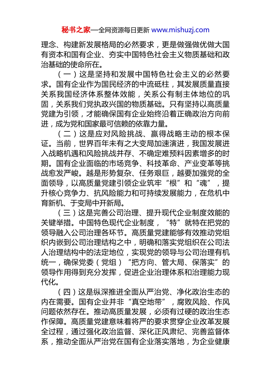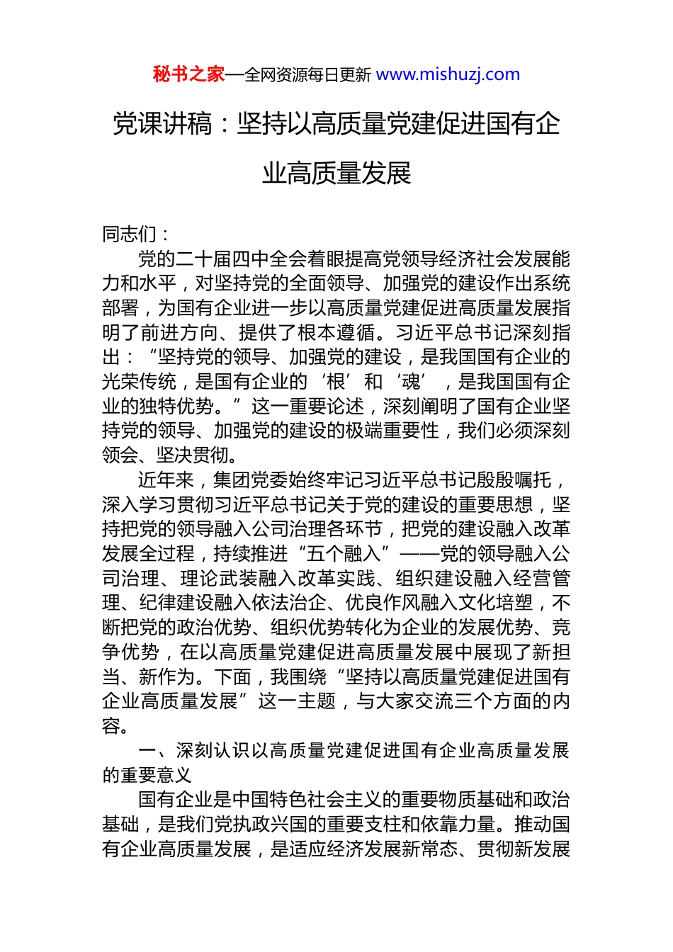 秘书之家—全网资源每日更新 www.mishuzj.com党课讲稿:坚持以高质量党建促进国有企业高质量发展同志们:党的二十届四中全会着眼提高党领导经济社会发展能力和水平,对坚持党的全面领导、加强党的建设作出系统部署,为国有企业进一步以高质量党建促进高质量发展指明了前进方向、提供了根本遵循。习近平总书记深刻指出:“坚持党的领导、加强党的建设,是我国国有企业的光荣传统,是国有企业的‘根’和‘魂’,是我国国有企业的独特优势。”这一重要论述,深刻阐明了国有企业坚持党的领导、加强党的建设的极端重要性,我们必须深刻领会、坚决贯彻。近年来,集团党委始终牢记习近平总书记殷殷嘱托,深入学习贯彻习近平总书记关于党的建设的重要思想,坚持把党的领导融入公司治理各环节,把党的建设融入改革发展全过程,持续推进“五个融入”——党的领导融入公司治理、理论武装融入改革实践、组织建设融入经营管理、纪律建设融入依法治企、优良作风融入文化培塑,不断把党的政治优势、组织优势转化为企业的发展优势、竞争优势,在以高质量党建促进高质量发展中展现了新担当、新作为。下面,我围绕“坚持以高质量党建促进国有企业高质量发展”这一主题,与大家交流三个方面的内容。一、深刻认识以高质量党建促进国有企业高质量发展的重要意义国有企业是中国特色社会主义的重要物质基础和政治基础,是我们党执政兴国的重要支柱和依靠力量。推动国有企业高质量发展,是适应经济发展新常态、贯彻新发展秘书之家—全网资源每日更新 www.mishuzj.com理念、构建新发展格局的必然要求,更是做强做优做大国有资本和国有企业、夯实中国特色社会主义物质基础和政治基础的使命所在。(一)这是坚持和发展中国特色社会主义的必然要求。国有企业作为国民经济的中流砥柱,其发展质量直接关系我国经济体系整体效能,关系公有制主体地位的巩固,关系我们党执政兴国的物质基础。只有坚持以高质量党建为引领,才能确保国有企业始终沿着正确政治方向前进,成为党和国家最可信赖的依靠力量。(二)这是应对风险挑战、赢得战略主动的根本保证。当前,世界百年未有之大变局加速演进,我国发展进入战略机遇和风险挑战并存、不确定难预料因素增多的时期。国有企业面临的市场竞争、科技革命、产业变革等挑战愈发严峻。越是形势复杂、任务艰巨,越要加强党的全面领导,以高质量党建引领企业筑牢“根”和“魂”,提升核心竞争力、抗风险能力和可持续发展能力,在危机中育新机、于变局中开新局。(三)这是完善公司治理、提升现代企业制度效能的关键举措。中国特色现代企业制度,“特”就特在把党的领导融入公司治理各环节。高质量党建能够有效推动党组织内嵌到公司治理结构之中,明确和落实党组织在公司法人治理结构中的法定地位,实现党的领导与公司治理有机统一,确保党委(党组)“把方向、管大局、保落实”的领导作用得到充分发挥,促进企业治理体系和治理能力现代化。(四)这是纵深推进全面从严治党、净化政治生态的内在需要。国有企业并非“真空地带”,腐败风险、作风问题依然存在。推动高质量发展,必须有过硬的政治生态作保障。高质量党建意味着将严的要求贯穿企业改革发展全过程,通过强化政治监督、深化正风肃纪、完善监督体系,推动全面从严治党在国有企业落实落地,为企业健康秘书之家—全网资源每日更新 www.mishuzj.com发展营造风清气正的良好环境。二、充分肯定公司党委坚持以高质量党建促进高质量发展的实践成果近年来,集团党委坚决贯彻党中央决策部署和上级党组织工作要求,紧紧围绕企业改革发展中心任务,扎实推进党的建设各项工作,取得了一系列扎实成效,为集团高质量发展提供了坚强政治保证和组织保证。(一)推进党的领导融入公司治理,促进更好发挥“三个作用”。党的二十届四中全会明确了“十五五”时期经济社会发展必须遵循的“六个坚持”重要原则,首要的就是“坚持党的全面领导”。集团党委坚持把加强党的领导和完善公司治理统一起来,推动党的领导融入公司治理全领域、各环节,在发挥党委“把方向、管大局、保落实”领导作用上持续用力、务求实效。一是对标对表把方向。始终将...