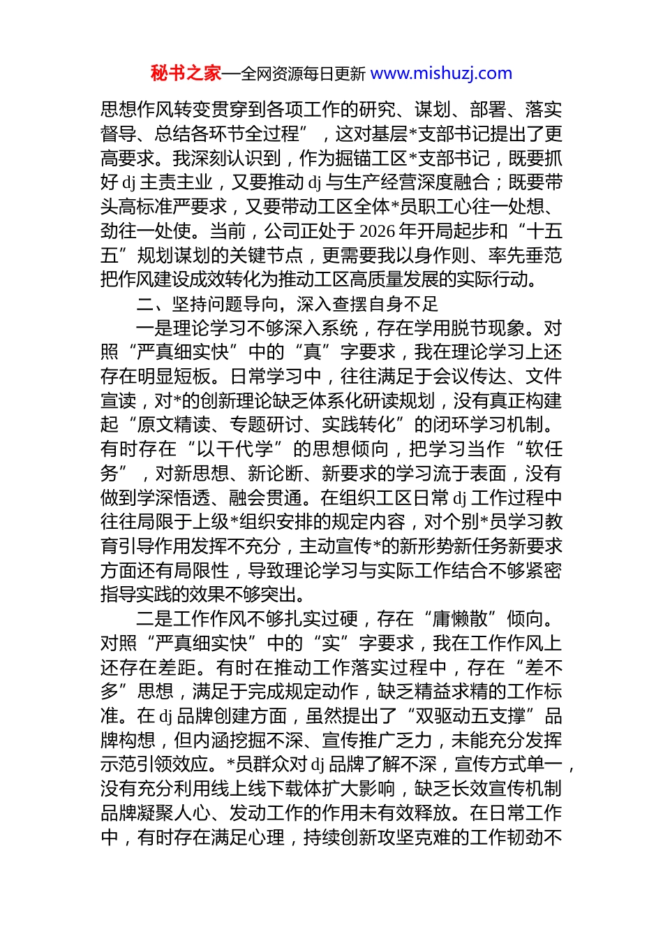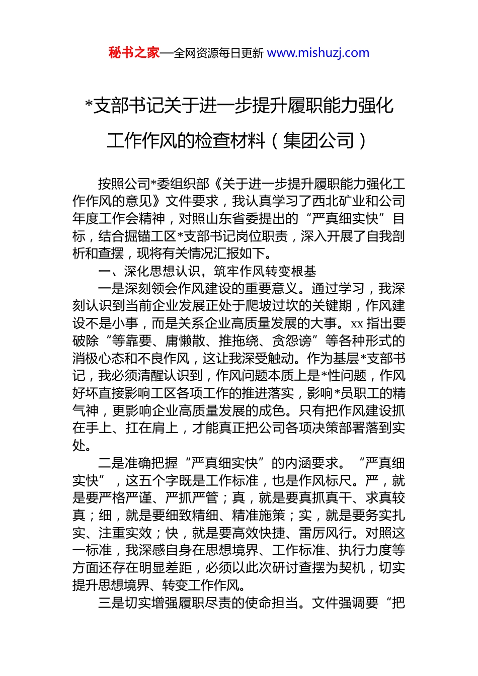秘书之家—全网资源每日更新 www.mishuzj.com*支部书记关于进一步提升履职能力强化工作作风的检查材料(集团公司)按照公司*委组织部《关于进一步提升履职能力强化工作作风的意见》文件要求,我认真学习了西北矿业和公司年度工作会精神,对照山东省委提出的“严真细实快”目标,结合掘锚工区*支部书记岗位职责,深入开展了自我剖析和查摆,现将有关情况汇报如下。一、深化思想认识,筑牢作风转变根基一是深刻领会作风建设的重要意义。通过学习,我深刻认识到当前企业发展正处于爬坡过坎的关键期,作风建设不是小事,而是关系企业高质量发展的大事。xx 指出要破除“等靠要、庸懒散、推拖绕、贪怨谤”等各种形式的消极心态和不良作风,这让我深受触动。作为基层*支部书记,我必须清醒认识到,作风问题本质上是*性问题,作风好坏直接影响工区各项工作的推进落实,影响*员职工的精气神,更影响企业高质量发展的成色。只有把作风建设抓在手上、扛在肩上,才能真正把公司各项决策部署落到实处。二是准确把握“严真细实快”的内涵要求。“严真细实快”,这五个字既是工作标准,也是作风标尺。严,就是要严格严谨、严抓严管;真,就是要真抓真干、求真较真;细,就是要细致精细、精准施策;实,就是要务实扎实、注重实效;快,就是要高效快捷、雷厉风行。对照这一标准,我深感自身在思想境界、工作标准、执行力度等方面还存在明显差距,必须以此次研讨查摆为契机,切实提升思想境界、转变工作作风。三是切实增强履职尽责的使命担当。文件强调要“把秘书之家—全网资源每日更新 www.mishuzj.com思想作风转变贯穿到各项工作的研究、谋划、部署、落实督导、总结各环节全过程”,这对基层*支部书记提出了更高要求。我深刻认识到,作为掘锚工区*支部书记,既要抓好 dj 主责主业,又要推动 dj 与生产经营深度融合;既要带头高标准严要求,又要带动工区全体*员职工心往一处想、劲往一处使。当前,公司正处于 2026 年开局起步和“十五五”规划谋划的关键节点,更需要我以身作则、率先垂范把作风建设成效转化为推动工区高质量发展的实际行动。二、坚持问题导向,深入查摆自身不足一是理论学习不够深入系统,存在学用脱节现象。对照“严真细实快”中的“真”字要求,我在理论学习上还存在明显短板。日常学习中,往往满足于会议传达、文件宣读,对*的创新理论缺乏体系化研读规划,没有真正构建起“原文精读、专题研讨、实践转化”的闭环学习机制。有时存在“以干代学”的思想倾向,把学习当作“软任务”,对新思想、新论断、新要求的学习流于表面,没有做到学深悟透、融会贯通。在组织工区日常 dj 工作过程中往往局限于上级*组织安排的规定内容,对个别*员学习教育引导作用发挥不充分,主动宣传*的新形势新任务新要求方面还有局限性,导致理论学习与实际工作结合不够紧密指导实践的效果不够突出。二是工作作风不够扎实过硬,存在“庸懒散”倾向。对照“严真细实快”中的“实”字要求,我在工作作风上还存在差距。有时在推动工作落实过程中,存在“差不多”思想,满足于完成规定动作,缺乏精益求精的工作标准。在 dj 品牌创建方面,虽然提出了“双驱动五支撑”品牌构想,但内涵挖掘不深、宣传推广乏力,未能充分发挥示范引领效应。*员群众对 dj 品牌了解不深,宣传方式单一,没有充分利用线上线下载体扩大影响,缺乏长效宣传机制品牌凝聚人心、发动工作的作用未有效释放。在日常工作中,有时存在满足心理,持续创新攻坚克难的工作韧劲不秘书之家—全网资源每日更新 www.mishuzj.com足,工作创新力度不够,以新思想新理论指导具体实践工作的结合度不够、针对性不强。三是履职担当不够积极主动,存在“等靠要”心态。对照“严真细实快”中的“快”字要求,我在工作主动性上还有不足。在推进支部建设过程中,有时存在“等上级安排、靠上级推动”的被动思想,主动谋划、提前布局的意识不够强。在人才队伍建设方面,虽然培养预备*员 2 人、积极分子 5 人,但对青年职工的跟踪培养、实践锻炼还不够系统,让优秀人才在实践磨砺中快速成长的机制还不够完善。在安全生产与 dj 融合方面,推...