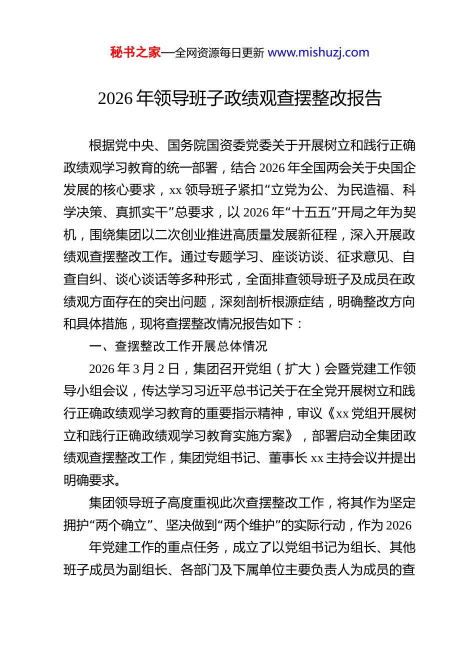 秘书之家—全网资源每日更新 www.mishuzj.com2026 年领导班子政绩观查摆整改报告 根据党中央、国务院国资委党委关于开展树立和践行正确政绩观学习教育的统一部署,结合 2026 年全国两会关于央国企发展的核心要求,xx“领导班子紧扣 立党为公、为民造福、科”学决策、真抓实干 总要求,以 2026“”年 十五五 开局之年为契机,围绕集团以二次创业推进高质量发展新征程,深入开展政绩观查摆整改工作。通过专题学习、座谈访谈、征求意见、自查自纠、谈心谈话等多种形式,全面排查领导班子及成员在政绩观方面存在的突出问题,深刻剖析根源症结,明确整改方向和具体措施,现将查摆整改情况报告如下:一、查摆整改工作开展总体情况2026 年 3 月 2 日,集团召开党组(扩大)会暨党建工作领导小组会议,传达学习习近平总书记关于在全党开展树立和践行正确政绩观学习教育的重要指示精神,审议《xx 党组开展树立和践行正确政绩观学习教育实施方案》,部署启动全集团政绩观查摆整改工作,集团党组书记、董事长 xx 主持会议并提出明确要求。集团领导班子高度重视此次查摆整改工作,将其作为坚定“”“”拥护 两个确立 、坚决做到 两个维护 的实际行动,作为 2026年党建工作的重点任务,成立了以党组书记为组长、其他班子成员为副组长、各部门及下属单位主要负责人为成员的查秘书之家—全网资源每日更新 www.mishuzj.com摆整改工作领导小组,明确职责分工、工作流程和时间节点,“形成 党组统一领导、领导小组统筹协调、各部门分工负责、全”员协同参与 的工作格局。“”结合集团 二次创业、奋斗有我 形势任务教育,班子成员带头深入学习习近平总书记关于树立和践行正确政绩观的重要论述,认真研读《习近平关于树立和践行正确政绩观论述摘编》,结合国务院国资委关于中管企业学习教育的部署要求,开展专题学习研讨 4 次,撰写学习心得 12 篇。通过集团官“”“”网、 党组信箱码上减负 等平台载体,广泛征求下属单位、基层员工、服务对象及社会各界意见建议 86 条,梳理汇总形成意见清单;班子成员之间、班子成员与分管部门负责人之间开展谈心谈话 32“人次,坦诚交流思想、沟通问题不足;对照 三”“”个对照 要求,结合集团 一基两翼三链四新 产业新格局建设实际,深入开展自查自纠,全面查摆政绩观方面存在的突出问题,形成自查报告和问题清单,确保查摆工作走深走实、不走过场。“”此次查摆整改工作严格遵循 学查改一体推进 原则,坚持边学边改、边查边改、立行立改,既注重解决当前突出问题,又着力构建长效机制,切实把学习教育成果转化为推动集团高质量发展的实际成效,为集团 2026 年各项重点工作开好局、起好步提供坚强保障。秘书之家—全网资源每日更新 www.mishuzj.com二、存在的主要问题通过全面查摆,结合征求意见和谈心谈话情况,集团领导班子及成员在政绩观方面总体呈现良好态势,能够始终坚持以习近平新时代中国特色社会主义思想为指导,立足央企职责使“命,聚焦高质量发展首要任务,践行 爱我中华、振兴 xx”“为”美好生活加油 的初心使命,但对照党中央要求、国务院国资委部署和职工群众期盼,仍存在一些不容忽视的问题,主要体现在以下五个方面:(一)政治站位不够高,政绩导向存在偏差部分班子成员对树立和践行正确政绩观的政治意义认识不“”“够深刻,未能始终从坚定拥护 两个确立 、坚决做到 两个维”“”护 的高度看待政绩工作,存在 重业务、轻政治 的倾向,将经济指标完成情况作为衡量政绩的主要标准,对政治建设、党建引领、意识形态等工作重视程度不够,投入精力不足。在贯彻“落实党中央决策部署和国务院国资委工作要求时,有时存在 上”热中温下冷 的现象,结合集团实际创造性落实的力度不够,比“”如在推进新型能源体系建设、落实 双碳 目标要求时,更多关注项目落地进度和投资规模,对政策落地的政治效果、社会效果考虑不够周全,未能充分体现央企的政治担当和社会责任。“”部分成员对 功成不必在我、功成必定有我 的境界把握不够精秘书之家—全网资源每日更新 www.mishuzj.com准,存在急...