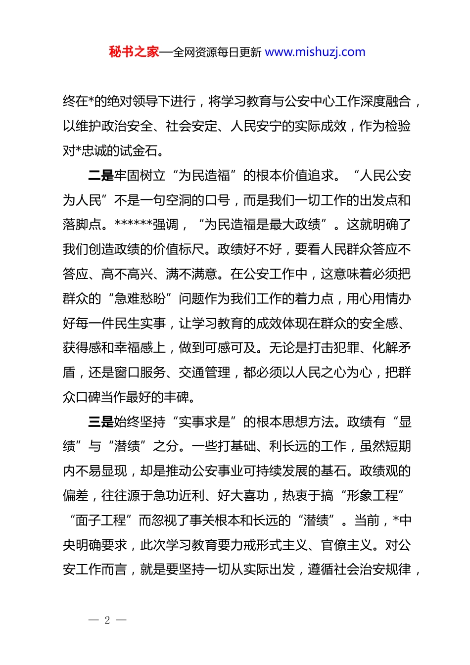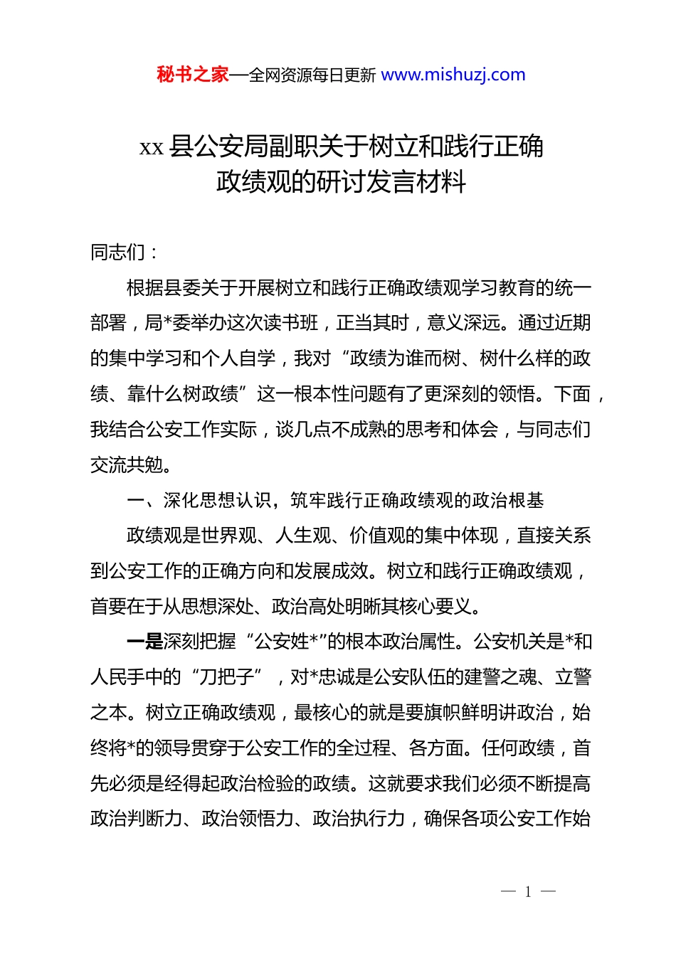 秘书之家—全网资源每日更新 www.mishuzj.comxx 县公安局副职关于树立和践行正确政绩观的研讨发言材料同志们:根据县委关于开展树立和践行正确政绩观学习教育的统一部署,局*委举办这次读书班,正当其时,意义深远。通过近期的集中学习和个人自学,我对“政绩为谁而树、树什么样的政绩、靠什么树政绩”这一根本性问题有了更深刻的领悟。下面,我结合公安工作实际,谈几点不成熟的思考和体会,与同志们交流共勉。一、深化思想认识,筑牢践行正确政绩观的政治根基政绩观是世界观、人生观、价值观的集中体现,直接关系到公安工作的正确方向和发展成效。树立和践行正确政绩观,首要在于从思想深处、政治高处明晰其核心要义。一是深刻把握“公安姓*”的根本政治属性。公安机关是*和人民手中的“刀把子”,对*忠诚是公安队伍的建警之魂、立警之本。树立正确政绩观,最核心的就是要旗帜鲜明讲政治,始终将*的领导贯穿于公安工作的全过程、各方面。任何政绩,首先必须是经得起政治检验的政绩。这就要求我们必须不断提高政治判断力、政治领悟力、政治执行力,确保各项公安工作始— 1 —秘书之家—全网资源每日更新 www.mishuzj.com终在*的绝对领导下进行,将学习教育与公安中心工作深度融合,以维护政治安全、社会安定、人民安宁的实际成效,作为检验对*忠诚的试金石。二是牢固树立“为民造福”的根本价值追求。“人民公安为人民”不是一句空洞的口号,而是我们一切工作的出发点和落脚点。******强调,“为民造福是最大政绩”。这就明确了我们创造政绩的价值标尺。政绩好不好,要看人民群众答应不答应、高不高兴、满不满意。在公安工作中,这意味着必须把群众的“急难愁盼”问题作为我们工作的着力点,用心用情办好每一件民生实事,让学习教育的成效体现在群众的安全感、获得感和幸福感上,做到可感可及。无论是打击犯罪、化解矛盾,还是窗口服务、交通管理,都必须以人民之心为心,把群众口碑当作最好的丰碑。三是始终坚持“实事求是”的根本思想方法。政绩有“显绩”与“潜绩”之分。一些打基础、利长远的工作,虽然短期内不易显现,却是推动公安事业可持续发展的基石。政绩观的偏差,往往源于急功近利、好大喜功,热衷于搞“形象工程”“面子工程”而忽视了事关根本和长远的“潜绩”。当前,*中央明确要求,此次学习教育要力戒形式主义、官僚主义。对公安工作而言,就是要坚持一切从实际出发,遵循社会治安规律,— 2 —秘书之家—全网资源每日更新 www.mishuzj.com科学决策、真抓实干,既要抓好当前显性成果,更要注重抓好基层基础、队伍建设、机制创新等需要久久为功的“潜绩”,一步一个脚印地推动平安 xx 建设迈向更高水平。二、坚持问题导向,深刻检视政绩观偏差的现实表现开展学习教育,一项重要任务就是对照*章*规、群众期待,刀刃向内,深入查摆自身在政绩观上存在的偏差和不足。结合工作实际和思想反思,我认为在公安系统,一些政绩观偏差问题仍需高度警惕和深刻检视。一是在执法办案中,存在“数据”与“民意”的错位。个别单位和民警在执法绩效考核的压力下,可能出现重破案率、打击数等“数字政绩”的倾向,而对案件办理的程序公正、法律效果和社会效果关注不够。有时甚至出现为了完成指标而“挑案办案”,或是在执法中存在“重处罚、轻服务”的现象,忽视了执法的根本目的是维护公平正义、化解社会矛盾。这种以数据论英雄的片面政绩观,偏离了“让人民群众在每一个司法案件中感受到公平正义”的根本目标,损害了公安机关的执法公信力。二是在服务群众中,存在“形式”与“实效”的落差。随着“放管服”改革的深入,公安机关推出了许多便民利民举措,但有时也存在“盆景式”服务现象:即打造一两个光鲜亮丽的— 3 —秘书之家—全网资源每日更新 www.mishuzj.com服务窗口或“明星”应用作为展示品,而普惠性、常态化的服务机制建设却跟不上。一些服务举措看似热闹,实则流程繁琐,群众体验感不佳,不能真正触及群众办事的痛点、难点和堵点。这种重形式、轻实效的做法,本质上是服务群众意识淡薄的表现,与“人民至上”的理念背道而驰。三是在队伍管理中,存在“...