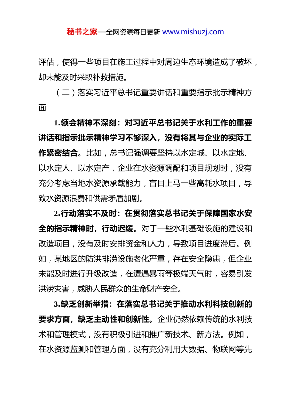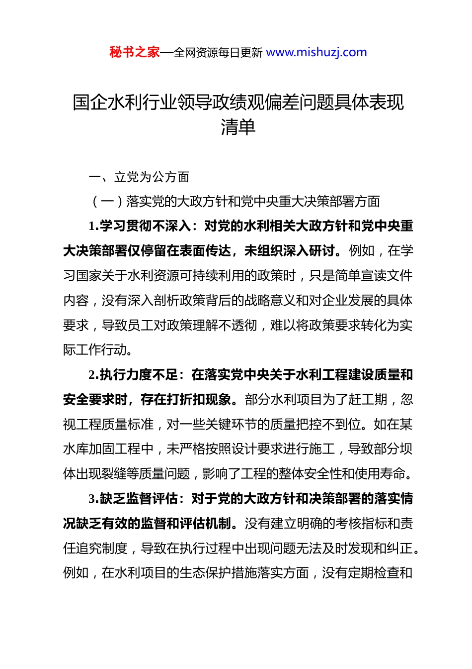秘书之家—全网资源每日更新 www.mishuzj.com国企水利行业领导政绩观偏差问题具体表现清单 一、立党为公方面(一)落实党的大政方针和党中央重大决策部署方面1.学习贯彻不深入:对党的水利相关大政方针和党中央重大决策部署仅停留在表面传达,未组织深入研讨。例如,在学习国家关于水利资源可持续利用的政策时,只是简单宣读文件内容,没有深入剖析政策背后的战略意义和对企业发展的具体要求,导致员工对政策理解不透彻,难以将政策要求转化为实际工作行动。2.执行力度不足:在落实党中央关于水利工程建设质量和安全要求时,存在打折扣现象。部分水利项目为了赶工期,忽视工程质量标准,对一些关键环节的质量把控不到位。如在某水库加固工程中,未严格按照设计要求进行施工,导致部分坝体出现裂缝等质量问题,影响了工程的整体安全性和使用寿命。3.缺乏监督评估:对于党的大政方针和决策部署的落实情况缺乏有效的监督和评估机制。没有建立明确的考核指标和责任追究制度,导致在执行过程中出现问题无法及时发现和纠正。例如,在水利项目的生态保护措施落实方面,没有定期检查和秘书之家—全网资源每日更新 www.mishuzj.com评估,使得一些项目在施工过程中对周边生态环境造成了破坏,却未能及时采取补救措施。(二)落实习近平总书记重要讲话和重要指示批示精神方面1.领会精神不深刻:对习近平总书记关于水利工作的重要讲话和指示批示精神学习不够深入,没有将其与企业的实际工作紧密结合。比如,总书记强调要坚持以水定城、以水定地、以水定人、以水定产,企业在水资源调配和项目规划时,没有充分考虑当地水资源承载能力,盲目上马一些高耗水项目,导致水资源浪费和供需矛盾加剧。2.行动落实不及时:在贯彻落实总书记关于保障国家水安全的指示精神时,行动迟缓。对于一些水利基础设施的建设和改造项目,没有及时安排资金和人力,导致项目进度滞后。例如,某地区的防洪排涝设施老化严重,存在安全隐患,但企业未能及时进行升级改造,在遭遇暴雨等极端天气时,容易引发洪涝灾害,威胁人民群众的生命财产安全。3.缺乏创新举措:在落实总书记关于推动水利科技创新的要求方面,缺乏主动性和创新性。企业仍然依赖传统的水利技术和管理模式,没有积极引进和推广新技术、新方法。例如,在水资源监测和管理方面,没有充分利用大数据、物联网等先秘书之家—全网资源每日更新 www.mishuzj.com进技术,导致监测数据不准确、管理效率低下。(三)树立“全国一盘棋”思想、服务服从大局方面1.局部利益至上:在水利项目规划和建设中,过于关注本企业的局部利益,忽视了国家整体利益和区域协调发展。例如,在跨区域水资源调配项目中,为了追求本企业的经济效益,擅自调整水资源分配方案,影响了其他地区的用水需求,破坏了区域水资源的合理配置。2.缺乏协同合作:在与其他水利企业或相关部门合作时,缺乏协同意识和合作精神。各自为政,信息不共享,导致在水利工程建设和管理中出现重复建设、资源浪费等问题。例如,在某流域的水利治理项目中,不同企业和部门之间没有进行有效的沟通和协调,各自开展治理工作,导致治理效果不佳,增加了治理成本。3.大局意识淡薄:对国家水利发展战略和宏观政策缺乏深入了解,不能从全局的角度思考和谋划企业的发展。在制定企业发展规划时,没有充分考虑国家对水利行业的整体布局和要求,导致企业发展方向与国家战略脱节。例如,在国家大力推进节水型社会建设的背景下,企业仍然将重点放在传统的水利工程建设上,忽视了节水技术的研发和应用。(四)对照岗位职责履职方面秘书之家—全网资源每日更新 www.mishuzj.com1.专业能力不足:部分领导干部对水利行业的专业知识和技能掌握不够扎实,在项目决策和管理中缺乏科学性和专业性。例如,在水利工程设计和施工过程中,由于对水利工程的技术标准和规范不熟悉,导致设计方案不合理、施工质量不达标。2.责任意识不强:在工作中存在推诿扯皮现象,对一些重要工作任务和问题不敢担当、不愿负责。例如,在处理水利项目中的质量问题和安全事故时,相互推卸责任,导致问题得不到及时解决,影响了企业的形象和声誉。3.工作...
