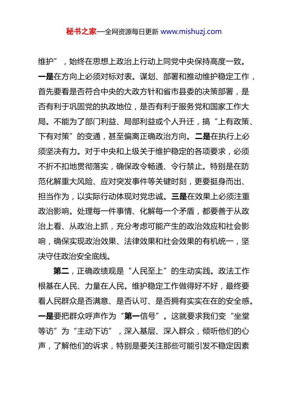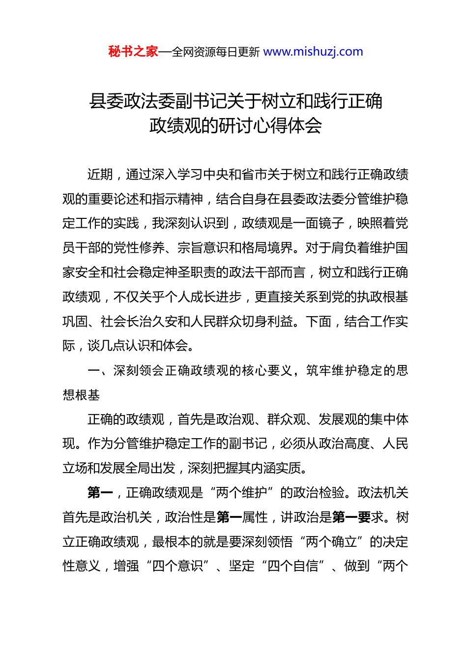 秘书之家—全网资源每日更新 www.mishuzj.com县委政法委副书记关于树立和践行正确政绩观的研讨心得体会 近期,通过深入学习中央和省市关于树立和践行正确政绩观的重要论述和指示精神,结合自身在县委政法委分管维护稳定工作的实践,我深刻认识到,政绩观是一面镜子,映照着党员干部的党性修养、宗旨意识和格局境界。对于肩负着维护国家安全和社会稳定神圣职责的政法干部而言,树立和践行正确政绩观,不仅关乎个人成长进步,更直接关系到党的执政根基巩固、社会长治久安和人民群众切身利益。下面,结合工作实际,谈几点认识和体会。一、深刻领会正确政绩观的核心要义,筑牢维护稳定的思想根基正确的政绩观,首先是政治观、群众观、发展观的集中体现。作为分管维护稳定工作的副书记,必须从政治高度、人民立场和发展全局出发,深刻把握其内涵实质。第一,正确政绩观是“两个维护”的政治检验。政法机关首先是政治机关,政治性是第一属性,讲政治是第一要求。树立正确政绩观,最根本的就是要深刻领悟“两个确立”的决定性意义,增强“四个意识”、坚定“四个自信”、做到“两个秘书之家—全网资源每日更新 www.mishuzj.com维护”,始终在思想上政治上行动上同党中央保持高度一致。一是在方向上必须对标对表。谋划、部署和推动维护稳定工作,首先要看是否符合中央的大政方针和省市县委的决策部署,是否有利于巩固党的执政地位,是否有利于服务党和国家工作大局。不能为了部门利益、局部利益或个人升迁,搞“上有政策、下有对策”的变通,甚至偏离正确政治方向。二是在执行上必须坚决有力。对于中央和上级关于维护稳定的各项要求,必须不折不扣地贯彻落实,确保政令畅通、令行禁止。特别是在防范化解重大风险、应对突发事件等关键时刻,更要挺身而出、担当作为,以实际行动体现对党忠诚。三是在效果上必须注重政治影响。处理每一件事情、化解每一个矛盾,都要善于从政治上看、从政治上抓,充分考虑可能产生的政治效应和社会影响,确保实现政治效果、法律效果和社会效果的有机统一,坚决守住政治安全底线。第二,正确政绩观是“人民至上”的生动实践。政法工作根基在人民、力量在人民。维护稳定工作做得好不好,最终要看人民群众是否满意、是否认可、是否拥有实实在在的安全感。一是要把群众呼声作为“第一信号”。这就要求我们变“坐堂等访”为“主动下访”,深入基层、深入群众,倾听他们的心声,了解他们的诉求,特别是要关注那些可能引发不稳定因素秘书之家—全网资源每日更新 www.mishuzj.com的苗头性、倾向性问题,做到早发现、早介入、早化解。二是要把群众满意作为“第一标准”。衡量维稳工作的成效,不能仅仅看数据是否好看、报表是否齐全,更要看群众的烦心事、揪心事有没有真正解决,社会矛盾是否真正得到缓和,邻里关系是否更加和谐。不能搞“数字维稳”、“指标维稳”,让群众在“被稳定”中感受不到温度。三是要把群众参与作为“第一动力”。维护稳定不是政法一家的事,要充分发动群众、依靠群众,完善基层社会治理体系,推广新时代“枫桥经验”,引导群众自我管理、自我服务、自我教育、自我监督,筑牢维护社会稳定的铜墙铁壁。第三,正确政绩观是“求真务实”的必然要求。政绩是干出来的,不是喊出来的,更不是编出来的。维护稳定工作直面矛盾、考验担当,必须坚持实事求是,力戒形式主义、官僚主义。一是要有“功成不必在我”的胸怀。维护稳定往往难以立竿见影,很多工作都是打基础、利长远的事。比如,法治宣传教育、基层基础建设、社会心理服务体系建设等,需要久久为功、持续用力。要甘于做铺垫性的工作,甘于抓未成之事,不贪一时之功,不图一时之名。二是要有“功成必定有我”的担当。面对影响安全稳定的突出问题和风险挑战,要敢于动真碰硬,勇于攻坚克难。不能因为怕出问题、怕担责任就畏首畏尾、秘书之家—全网资源每日更新 www.mishuzj.com回避矛盾。要深入调查研究,掌握真实情况,找准问题症结,拿出管用举措,切实解决影响安全稳定的深层次问题。三是要有“真抓实干”的作风。部署工作要结合实际,不能照搬照抄;落实任务要一抓到底,不能虎头蛇尾;检...