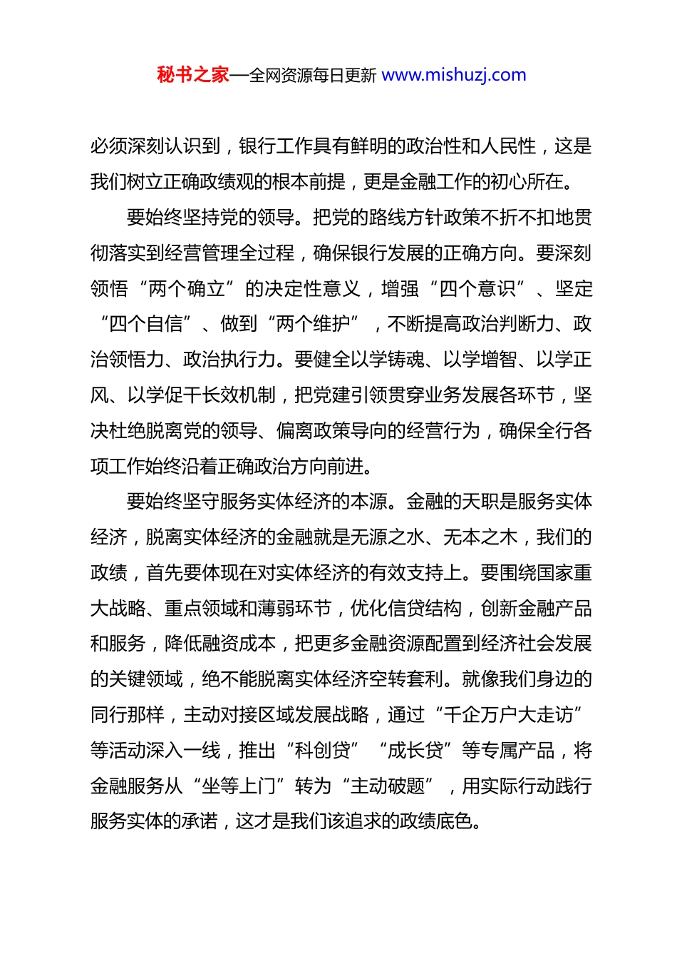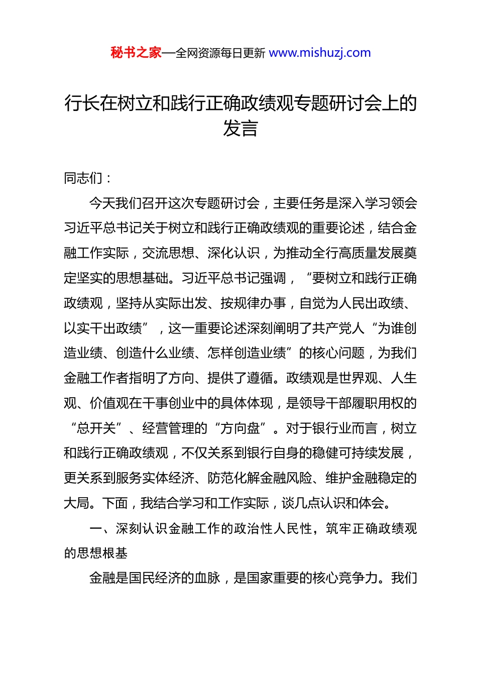 秘书之家—全网资源每日更新 www.mishuzj.com行长在树立和践行正确政绩观专题研讨会上的发言 同志们:今天我们召开这次专题研讨会,主要任务是深入学习领会习近平总书记关于树立和践行正确政绩观的重要论述,结合金融工作实际,交流思想、深化认识,为推动全行高质量发展奠定坚实的思想基础。习近平总书记强调,“要树立和践行正确政绩观,坚持从实际出发、按规律办事,自觉为人民出政绩、以实干出政绩”,这一重要论述深刻阐明了共产党人“为谁创造业绩、创造什么业绩、怎样创造业绩”的核心问题,为我们金融工作者指明了方向、提供了遵循。政绩观是世界观、人生观、价值观在干事创业中的具体体现,是领导干部履职用权的“总开关”、经营管理的“方向盘”。对于银行业而言,树立和践行正确政绩观,不仅关系到银行自身的稳健可持续发展,更关系到服务实体经济、防范化解金融风险、维护金融稳定的大局。下面,我结合学习和工作实际,谈几点认识和体会。一、深刻认识金融工作的政治性人民性,筑牢正确政绩观的思想根基金融是国民经济的血脉,是国家重要的核心竞争力。我们秘书之家—全网资源每日更新 www.mishuzj.com必须深刻认识到,银行工作具有鲜明的政治性和人民性,这是我们树立正确政绩观的根本前提,更是金融工作的初心所在。要始终坚持党的领导。把党的路线方针政策不折不扣地贯彻落实到经营管理全过程,确保银行发展的正确方向。要深刻领悟“两个确立”的决定性意义,增强“四个意识”、坚定“四个自信”、做到“两个维护”,不断提高政治判断力、政治领悟力、政治执行力。要健全以学铸魂、以学增智、以学正风、以学促干长效机制,把党建引领贯穿业务发展各环节,坚决杜绝脱离党的领导、偏离政策导向的经营行为,确保全行各项工作始终沿着正确政治方向前进。要始终坚守服务实体经济的本源。金融的天职是服务实体经济,脱离实体经济的金融就是无源之水、无本之木,我们的政绩,首先要体现在对实体经济的有效支持上。要围绕国家重大战略、重点领域和薄弱环节,优化信贷结构,创新金融产品和服务,降低融资成本,把更多金融资源配置到经济社会发展的关键领域,绝不能脱离实体经济空转套利。就像我们身边的同行那样,主动对接区域发展战略,通过“千企万户大走访”等活动深入一线,推出“科创贷”“成长贷”等专属产品,将金融服务从“坐等上门”转为“主动破题”,用实际行动践行服务实体的承诺,这才是我们该追求的政绩底色。秘书之家—全网资源每日更新 www.mishuzj.com要始终践行金融为民的宗旨。为民造福是最大政绩,银行联系千家万户,服务亿万客户,我们的每一项工作都与群众的切身利益紧密相关。要坚持以人民为中心的发展思想,把客户满意不满意、群众方便不方便作为衡量工作成效的重要标准。要持续提升金融服务普惠性、可得性和便利性,借助科技赋能破解小微企业融资难题,将企业“数据流”转化为“信用流”,推出线上信用贷款产品,填补小微企业抵质押不足的空白;聚焦新市民、三农、老年群体等重点对象,着力解决人民群众在金融服务中的急难愁盼问题,保护好金融消费者合法权益,让金融活水真正润泽千家万户。二、准确把握银行业高质量发展的内涵,树立符合规律的政绩导向推动高质量发展是银行业当前和今后一个时期的主题。正确的政绩观必须与高质量发展要求同频共振,不能急功近利、急于求成,更不能搞花架子、做表面文章,要始终坚持实事求是、按规律办事,追求经得住实践、人民和历史检验的业绩。要追求“稳”的政绩。金融安全是国家安全的重要组成部分,“稳”是银行业发展的生命线。必须坚持稳中求进工作总基调,把防控风险放在更加突出的位置。要树立审慎经营理念,健全全面风险管理体系,加强内控合规建设,运用科技手段优秘书之家—全网资源每日更新 www.mishuzj.com化风险监测流程,牢牢守住不发生系统性金融风险的底线。不能为了追求短期规模和利润增长而忽视风险、盲目扩张,坚决摒弃“重规模、轻质量”“重速度、轻风控”的错误倾向,以稳健经营守护全行发展根基。要追求“实”的政绩。习近平总书记指出,“业绩都是干出来的,真干才能真出业绩、出...