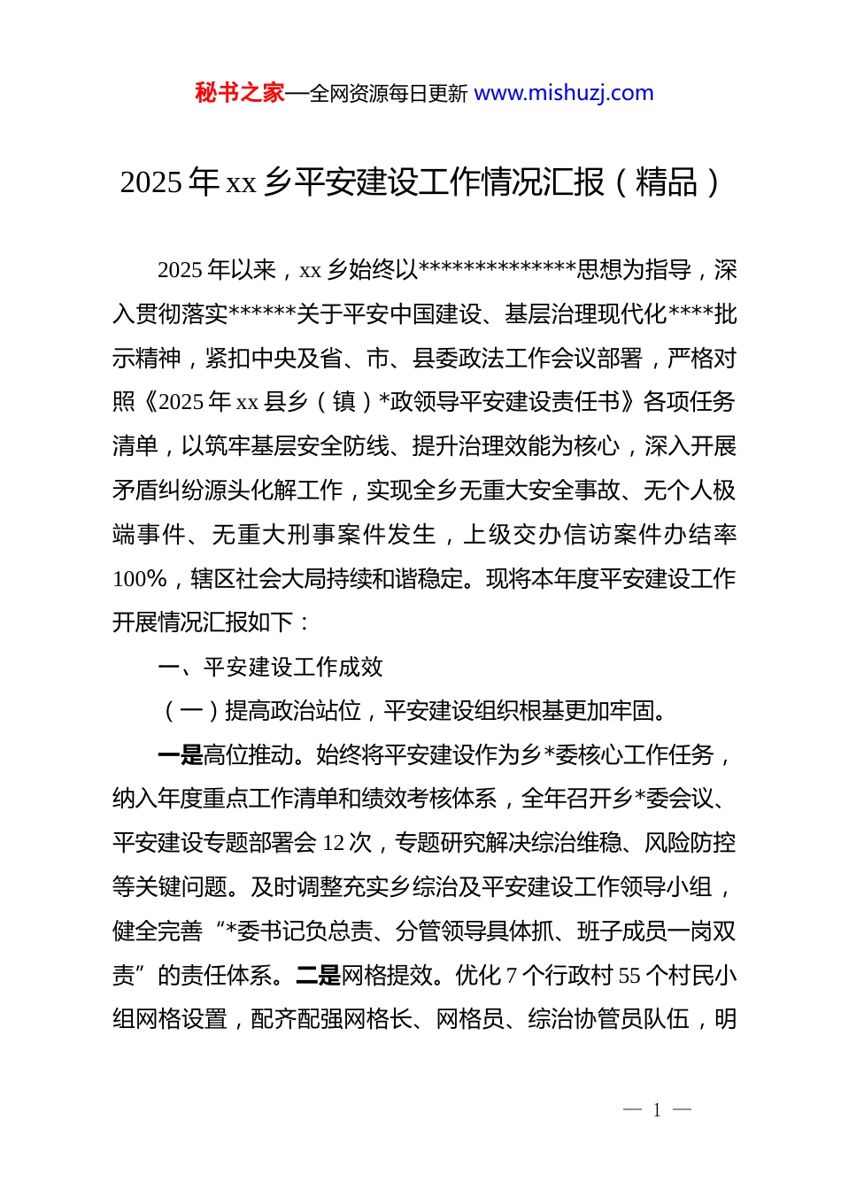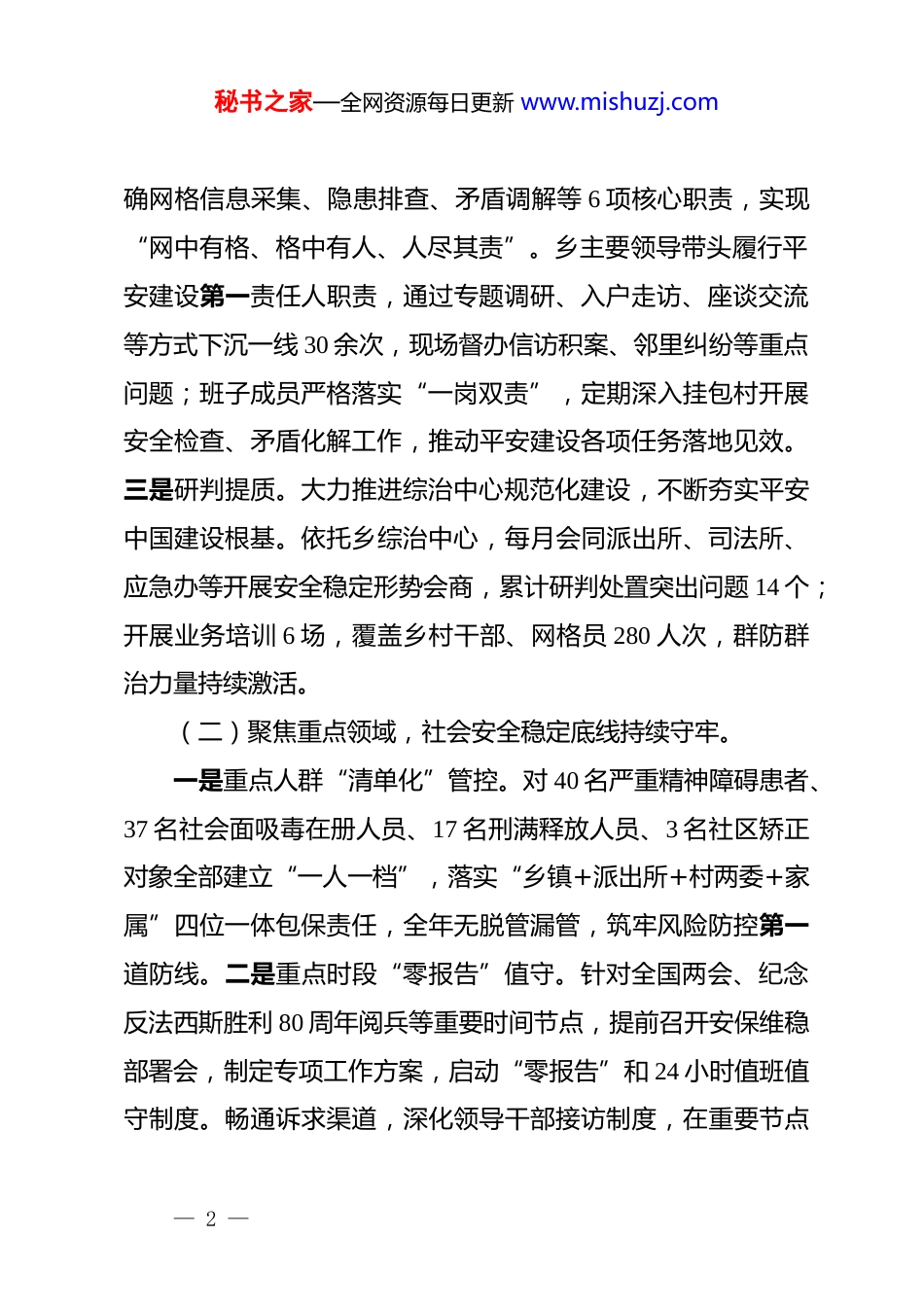 秘书之家—全网资源每日更新 www.mishuzj.com2025 年 xx 乡平安建设工作情况汇报(精品)2025 年以来,xx 乡始终以**************思想为指导,深入贯彻落实******关于平安中国建设、基层治理现代化****批示精神,紧扣中央及省、市、县委政法工作会议部署,严格对照《2025 年 xx 县乡(镇)*政领导平安建设责任书》各项任务清单,以筑牢基层安全防线、提升治理效能为核心,深入开展矛盾纠纷源头化解工作,实现全乡无重大安全事故、无个人极端事件、无重大刑事案件发生,上级交办信访案件办结率100%,辖区社会大局持续和谐稳定。现将本年度平安建设工作开展情况汇报如下:一、平安建设工作成效(一)提高政治站位,平安建设组织根基更加牢固。一是高位推动。始终将平安建设作为乡*委核心工作任务,纳入年度重点工作清单和绩效考核体系,全年召开乡*委会议、平安建设专题部署会 12 次,专题研究解决综治维稳、风险防控等关键问题。及时调整充实乡综治及平安建设工作领导小组,健全完善“*委书记负总责、分管领导具体抓、班子成员一岗双责”的责任体系。二是网格提效。优化 7 个行政村 55 个村民小组网格设置,配齐配强网格长、网格员、综治协管员队伍,明— 1 —秘书之家—全网资源每日更新 www.mishuzj.com确网格信息采集、隐患排查、矛盾调解等 6 项核心职责,实现“网中有格、格中有人、人尽其责”。乡主要领导带头履行平安建设第一责任人职责,通过专题调研、入户走访、座谈交流等方式下沉一线 30 余次,现场督办信访积案、邻里纠纷等重点问题;班子成员严格落实“一岗双责”,定期深入挂包村开展安全检查、矛盾化解工作,推动平安建设各项任务落地见效。三是研判提质。大力推进综治中心规范化建设,不断夯实平安中国建设根基。依托乡综治中心,每月会同派出所、司法所、应急办等开展安全稳定形势会商,累计研判处置突出问题 14 个;开展业务培训 6 场,覆盖乡村干部、网格员 280 人次,群防群治力量持续激活。(二)聚焦重点领域,社会安全稳定底线持续守牢。一是重点人群“清单化”管控。对 40 名严重精神障碍患者、37 名社会面吸毒在册人员、17 名刑满释放人员、3 名社区矫正对象全部建立“一人一档”,落实“乡镇+派出所+村两委+家属”四位一体包保责任,全年无脱管漏管,筑牢风险防控第一道防线。二是重点时段“零报告”值守。针对全国两会、纪念反法西斯胜利 80 周年阅兵等重要时间节点,提前召开安保维稳部署会,制定专项工作方案,启动“零报告”和 24 小时值班值守制度。畅通诉求渠道,深化领导干部接访制度,在重要节点— 2 —秘书之家—全网资源每日更新 www.mishuzj.com增设接访场次,全年开展领导接访 24 次,2025 年共受理信访件4 件、“12345”平台投诉建议 11 件,均按期办结,群众满意率100%。三是重点领域“滚动式”整治。深化涉稳风险隐患排查化解,开展“沉下去、厘清楚、处置好”专项行动,排查梳理重点涉稳风险隐患 11 项;联合派出所、道安办开展交通违法专项整治行动 4 次,严查酒驾、超速、疲劳驾驶等违法行为,营造安全畅通的出行环境;持续强化铁路沿线安全环境治理工作,配齐 2 名道路巡查员、8 名护路员,实行日常养护与隐患排查“双同步”,排查发现 5 处隐患并全部整改销号。(三)创新治理模式,基层治理现代化水平稳步提升。一是矛盾纠纷“联动联调”。践行新时代“枫桥经验”,创新构建“*政领导、综治牵头、站所联动、群众参与”的联动联调体系,整合司法所、派出所、村调委会等调解力量,组建“379”特色服务队、老兵调解服务队等特色调解队伍,吸纳乡贤、妇女、老*员、老兵、法律顾问等 86 人,实现“小事不出村、大事不出乡、矛盾不上交”。2025 年以来,通过联动联调机制成功化解各类矛盾纠纷 36 件,其中疑难纠纷 4 件,无重大群体性事件发生。二是暖心服务“精准派单”。充分发挥*员先锋模范作用,整合*员志愿服务队、老兵调解服务队、“379”特色服务队等力量,以近邻恳谈、说理议事为载体,收集群众心— 3 —秘书之家—全网资源每日更新 www.mishuzj.com愿清单 86...