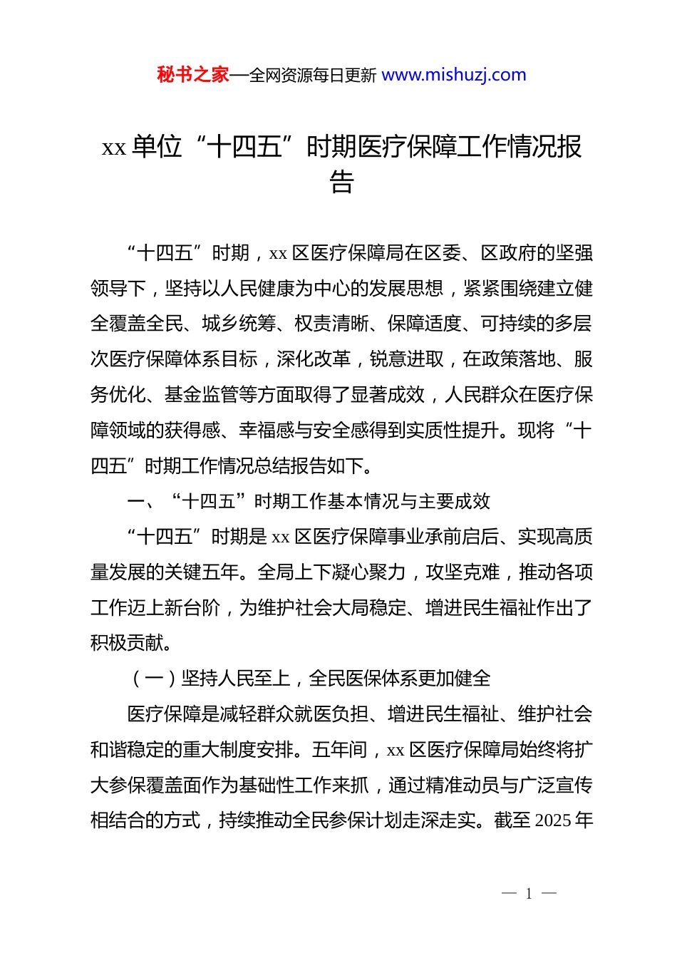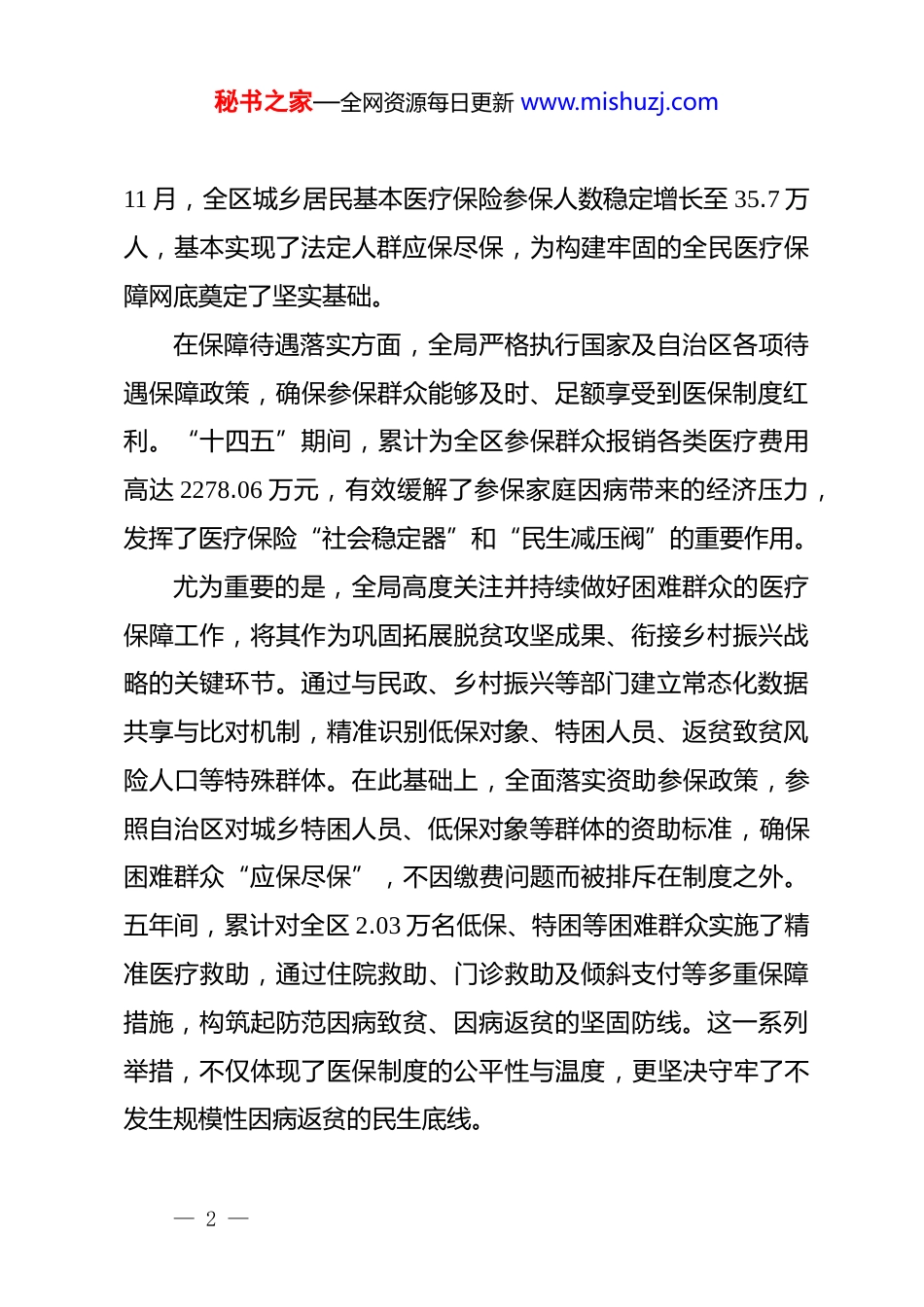 秘书之家—全网资源每日更新 www.mishuzj.comxx 单位“十四五”时期医疗保障工作情况报告“十四五”时期,xx 区医疗保障局在区委、区政府的坚强领导下,坚持以人民健康为中心的发展思想,紧紧围绕建立健全覆盖全民、城乡统筹、权责清晰、保障适度、可持续的多层次医疗保障体系目标,深化改革,锐意进取,在政策落地、服务优化、基金监管等方面取得了显著成效,人民群众在医疗保障领域的获得感、幸福感与安全感得到实质性提升。现将“十四五”时期工作情况总结报告如下。一、“十四五”时期工作基本情况与主要成效“十四五”时期是 xx 区医疗保障事业承前启后、实现高质量发展的关键五年。全局上下凝心聚力,攻坚克难,推动各项工作迈上新台阶,为维护社会大局稳定、增进民生福祉作出了积极贡献。(一)坚持人民至上,全民医保体系更加健全医疗保障是减轻群众就医负担、增进民生福祉、维护社会和谐稳定的重大制度安排。五年间,xx 区医疗保障局始终将扩大参保覆盖面作为基础性工作来抓,通过精准动员与广泛宣传相结合的方式,持续推动全民参保计划走深走实。截至 2025 年— 1 —秘书之家—全网资源每日更新 www.mishuzj.com11 月,全区城乡居民基本医疗保险参保人数稳定增长至 35.7 万人,基本实现了法定人群应保尽保,为构建牢固的全民医疗保障网底奠定了坚实基础。在保障待遇落实方面,全局严格执行国家及自治区各项待遇保障政策,确保参保群众能够及时、足额享受到医保制度红利。“十四五”期间,累计为全区参保群众报销各类医疗费用高达 2278.06 万元,有效缓解了参保家庭因病带来的经济压力,发挥了医疗保险“社会稳定器”和“民生减压阀”的重要作用。尤为重要的是,全局高度关注并持续做好困难群众的医疗保障工作,将其作为巩固拓展脱贫攻坚成果、衔接乡村振兴战略的关键环节。通过与民政、乡村振兴等部门建立常态化数据共享与比对机制,精准识别低保对象、特困人员、返贫致贫风险人口等特殊群体。在此基础上,全面落实资助参保政策,参照自治区对城乡特困人员、低保对象等群体的资助标准,确保困难群众“应保尽保”,不因缴费问题而被排斥在制度之外。五年间,累计对全区 2.03 万名低保、特困等困难群众实施了精准医疗救助,通过住院救助、门诊救助及倾斜支付等多重保障措施,构筑起防范因病致贫、因病返贫的坚固防线。这一系列举措,不仅体现了医保制度的公平性与温度,更坚决守牢了不发生规模性因病返贫的民生底线。— 2 —秘书之家—全网资源每日更新 www.mishuzj.com(二)聚焦改革创新,医疗保障服务效能显著提升为顺应人民群众对更加便捷、高效、优质医保服务的新期待,xx 区医疗保障局将数字化转型作为推动服务模式变革的核心驱动力,大力推进“智慧医保”建设,服务体验实现跨越式提升。在经办服务标准化、便捷化方面,对线下服务大厅进行了系统性优化升级,全面推行“一窗受理”和综合柜员制,打破了以往按业务分设窗口的壁生硬隔阂,将多个单一业务整合为一个综合窗口,有效减少了群众排队等候时间和“来回跑”现象,办事效率得到极大提升。同时,积极推动服务重心下移、服务关口前置,将参保登记、信息查询、异地就医备案等十余项高频业务下沉至各镇、街道便民服务中心,构建了“一刻钟医保服务圈”,实现了群众在家门口“就近办、快捷办”。在“互联网+医疗健康”服务领域,xx 区医疗保障局展现了高度的前瞻性与创新力,在全市范围内率先探索并成功推动了互联网医院的建设与应用。此项工作的核心在于打通了在线复诊、电子处方流转、医保在线支付及线下药店配药的全流程闭环。截至目前,已与区内 938 家定点零售药店签订了电子处方流转服务协议,构建了广泛的线下承接网络。自系统上线以来,累计完成电子处方流转业务量高达 40 万单,日均处理量稳— 3 —秘书之家—全网资源每日更新 www.mishuzj.com定在 4000 单以上。这一创新模式,真正实现了“让数据多跑路、群众少跑腿”,尤其为慢性病、常见病复诊患者提供了极大的便利,让他们足不出户即可完成复诊、开药、报销全过程,群众的就医体验得到革命性改善。此外,为进一步提升...
