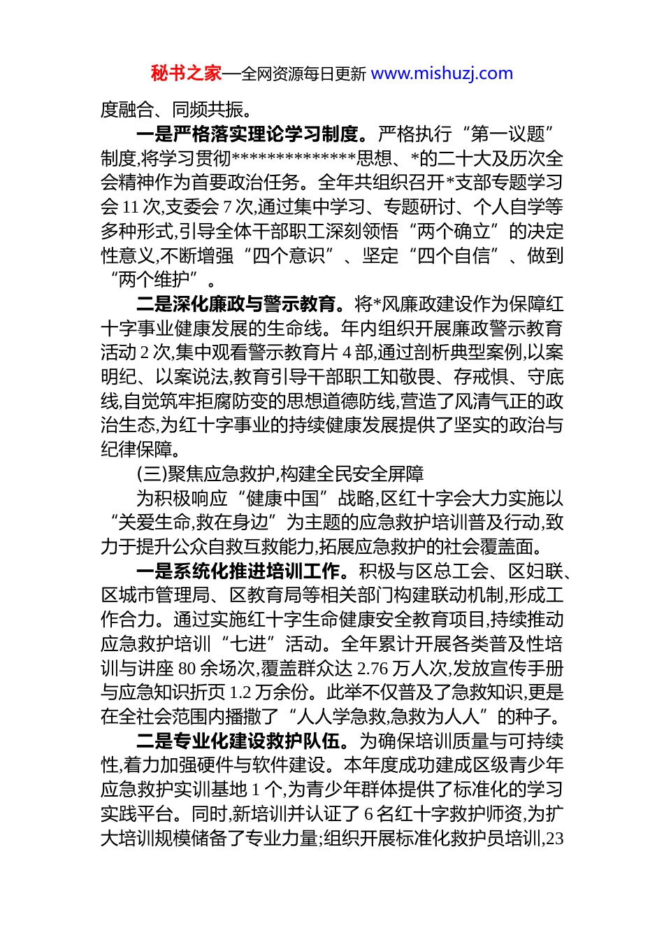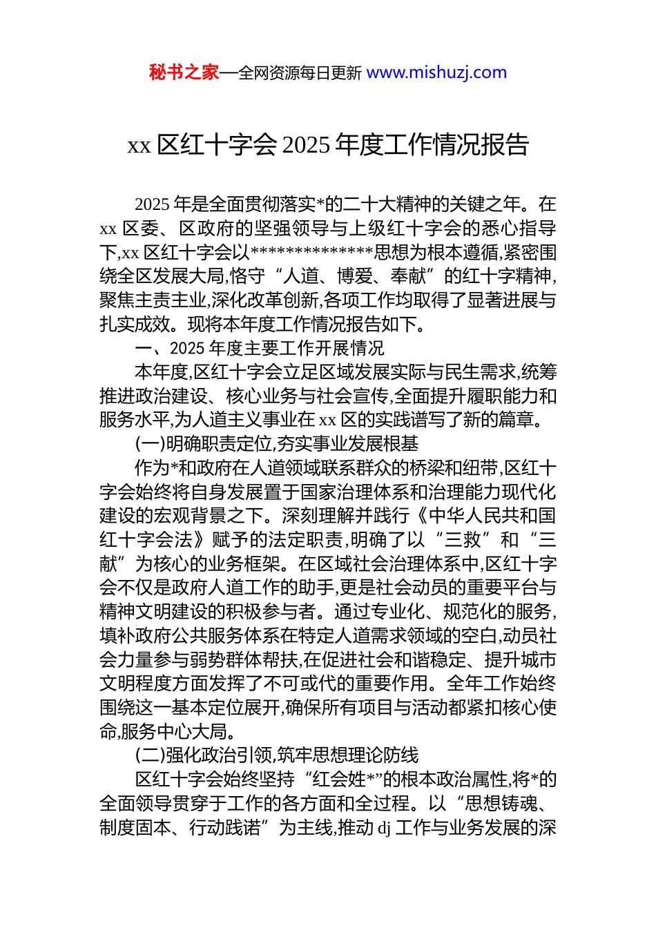 秘书之家—全网资源每日更新 www.mishuzj.comxx 区红十字会 2025 年度工作情况报告2025 年是全面贯彻落实*的二十大精神的关键之年。在xx 区委、区政府的坚强领导与上级红十字会的悉心指导下,xx 区红十字会以**************思想为根本遵循,紧密围绕全区发展大局,恪守“人道、博爱、奉献”的红十字精神,聚焦主责主业,深化改革创新,各项工作均取得了显著进展与扎实成效。现将本年度工作情况报告如下。一、2025 年度主要工作开展情况本年度,区红十字会立足区域发展实际与民生需求,统筹推进政治建设、核心业务与社会宣传,全面提升履职能力和服务水平,为人道主义事业在 xx 区的实践谱写了新的篇章。(一)明确职责定位,夯实事业发展根基作为*和政府在人道领域联系群众的桥梁和纽带,区红十字会始终将自身发展置于国家治理体系和治理能力现代化建设的宏观背景之下。深刻理解并践行《中华人民共和国红十字会法》赋予的法定职责,明确了以“三救”和“三献”为核心的业务框架。在区域社会治理体系中,区红十字会不仅是政府人道工作的助手,更是社会动员的重要平台与精神文明建设的积极参与者。通过专业化、规范化的服务,填补政府公共服务体系在特定人道需求领域的空白,动员社会力量参与弱势群体帮扶,在促进社会和谐稳定、提升城市文明程度方面发挥了不可或代的重要作用。全年工作始终围绕这一基本定位展开,确保所有项目与活动都紧扣核心使命,服务中心大局。(二)强化政治引领,筑牢思想理论防线区红十字会始终坚持“红会姓*”的根本政治属性,将*的全面领导贯穿于工作的各方面和全过程。以“思想铸魂、制度固本、行动践诺”为主线,推动 dj 工作与业务发展的深秘书之家—全网资源每日更新 www.mishuzj.com度融合、同频共振。一是严格落实理论学习制度。严格执行“第一议题”制度,将学习贯彻**************思想、*的二十大及历次全会精神作为首要政治任务。全年共组织召开*支部专题学习会 11 次,支委会 7 次,通过集中学习、专题研讨、个人自学等多种形式,引导全体干部职工深刻领悟“两个确立”的决定性意义,不断增强“四个意识”、坚定“四个自信”、做到“两个维护”。二是深化廉政与警示教育。将*风廉政建设作为保障红十字事业健康发展的生命线。年内组织开展廉政警示教育活动 2 次,集中观看警示教育片 4 部,通过剖析典型案例,以案明纪、以案说法,教育引导干部职工知敬畏、存戒惧、守底线,自觉筑牢拒腐防变的思想道德防线,营造了风清气正的政治生态,为红十字事业的持续健康发展提供了坚实的政治与纪律保障。(三)聚焦应急救护,构建全民安全屏障为积极响应“健康中国”战略,区红十字会大力实施以“关爱生命,救在身边”为主题的应急救护培训普及行动,致力于提升公众自救互救能力,拓展应急救护的社会覆盖面。一是系统化推进培训工作。积极与区总工会、区妇联、区城市管理局、区教育局等相关部门构建联动机制,形成工作合力。通过实施红十字生命健康安全教育项目,持续推动应急救护培训“七进”活动。全年累计开展各类普及性培训与讲座 80 余场次,覆盖群众达 2.76 万人次,发放宣传手册与应急知识折页 1.2 万余份。此举不仅普及了急救知识,更是在全社会范围内播撒了“人人学急救,急救为人人”的种子。二是专业化建设救护队伍。为确保培训质量与可持续性,着力加强硬件与软件建设。本年度成功建成区级青少年应急救护实训基地 1 个,为青少年群体提供了标准化的学习实践平台。同时,新培训并认证了 6 名红十字救护师资,为扩大培训规模储备了专业力量;组织开展标准化救护员培训,23秘书之家—全网资源每日更新 www.mishuzj.com名学员通过考核并成功取证,成为基层应急救护的骨干力量。三是精细化布局公共急救设施。针对人员密集公共场所的急救需求,科学规划并成功在重点区域布设了 4 台自动体外除颤器(aed),并配套开展了设备使用培训。这一举措极大地缩短了心脏骤停等突发事件的黄金救援时间,为挽救生命提供了关键设备支持。在本年度的评选中,区红十字会积极推荐 xx 街道 xx 社区参评,该社区最终获评“全国红十字优秀社区”荣誉称号,成为区域应急救護体系建设的典范。(四)深耕...