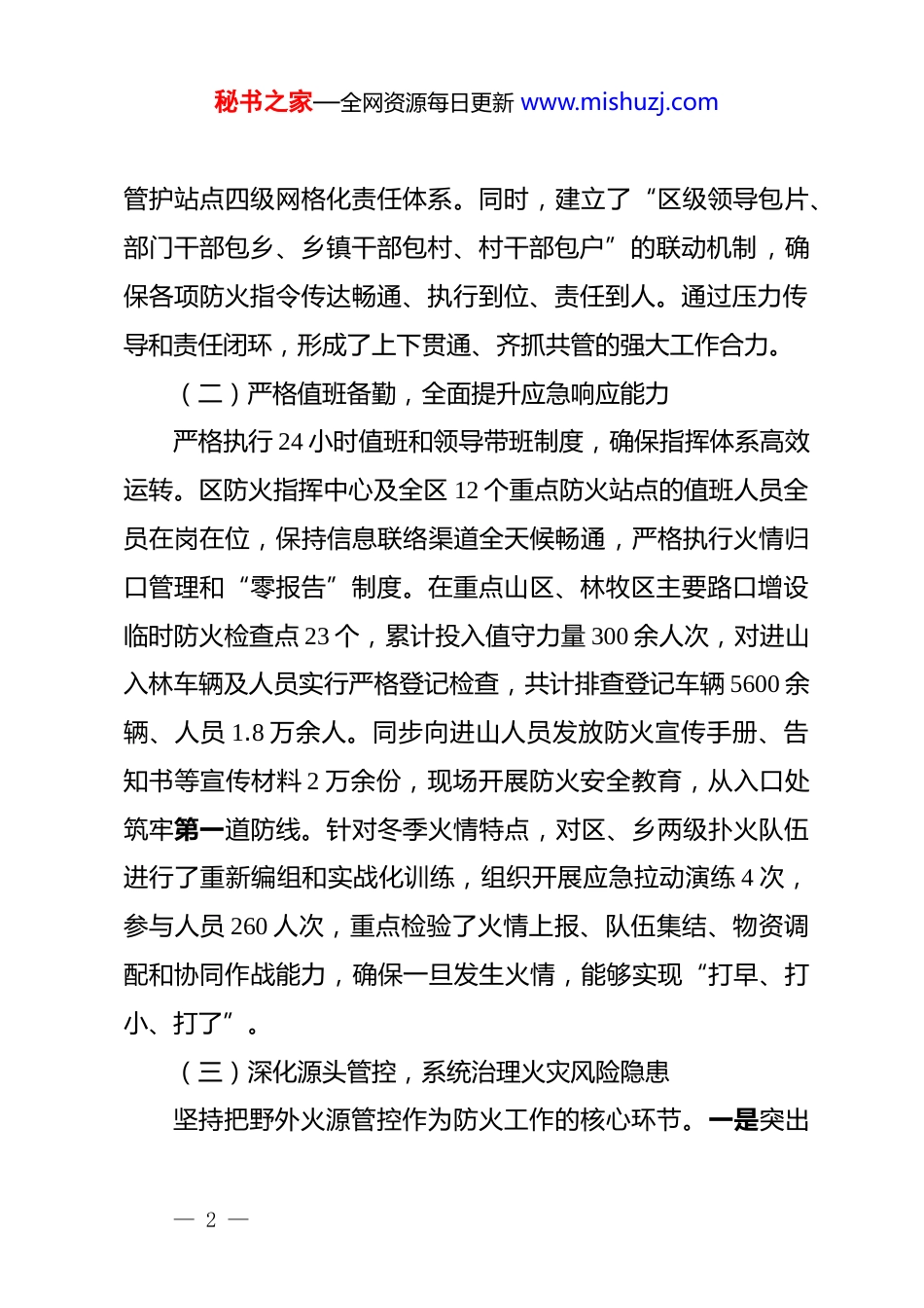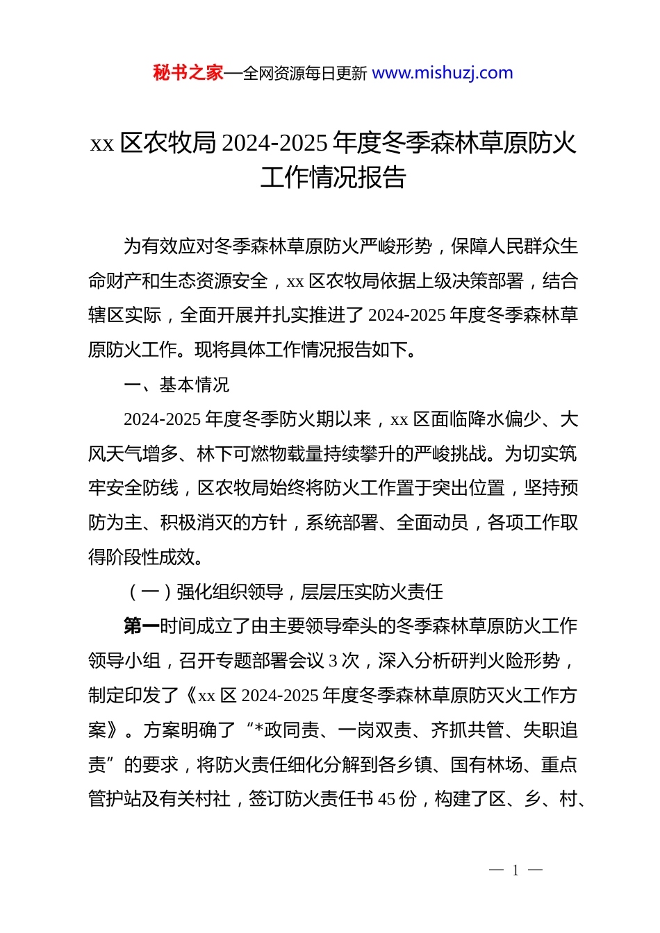 秘书之家—全网资源每日更新 www.mishuzj.comxx 区农牧局 2024-2025 年度冬季森林草原防火工作情况报告为有效应对冬季森林草原防火严峻形势,保障人民群众生命财产和生态资源安全,xx 区农牧局依据上级决策部署,结合辖区实际,全面开展并扎实推进了 2024-2025 年度冬季森林草原防火工作。现将具体工作情况报告如下。一、基本情况2024-2025 年度冬季防火期以来,xx 区面临降水偏少、大风天气增多、林下可燃物载量持续攀升的严峻挑战。为切实筑牢安全防线,区农牧局始终将防火工作置于突出位置,坚持预防为主、积极消灭的方针,系统部署、全面动员,各项工作取得阶段性成效。(一)强化组织领导,层层压实防火责任第一时间成立了由主要领导牵头的冬季森林草原防火工作领导小组,召开专题部署会议 3 次,深入分析研判火险形势,制定印发了《xx 区 2024-2025 年度冬季森林草原防灭火工作方案》。方案明确了“*政同责、一岗双责、齐抓共管、失职追责”的要求,将防火责任细化分解到各乡镇、国有林场、重点管护站及有关村社,签订防火责任书 45 份,构建了区、乡、村、— 1 —秘书之家—全网资源每日更新 www.mishuzj.com管护站点四级网格化责任体系。同时,建立了“区级领导包片、部门干部包乡、乡镇干部包村、村干部包户”的联动机制,确保各项防火指令传达畅通、执行到位、责任到人。通过压力传导和责任闭环,形成了上下贯通、齐抓共管的强大工作合力。(二)严格值班备勤,全面提升应急响应能力严格执行 24 小时值班和领导带班制度,确保指挥体系高效运转。区防火指挥中心及全区 12 个重点防火站点的值班人员全员在岗在位,保持信息联络渠道全天候畅通,严格执行火情归口管理和“零报告”制度。在重点山区、林牧区主要路口增设临时防火检查点 23 个,累计投入值守力量 300 余人次,对进山入林车辆及人员实行严格登记检查,共计排查登记车辆 5600 余辆、人员 1.8 万余人。同步向进山人员发放防火宣传手册、告知书等宣传材料 2 万余份,现场开展防火安全教育,从入口处筑牢第一道防线。针对冬季火情特点,对区、乡两级扑火队伍进行了重新编组和实战化训练,组织开展应急拉动演练 4 次,参与人员 260 人次,重点检验了火情上报、队伍集结、物资调配和协同作战能力,确保一旦发生火情,能够实现“打早、打小、打了”。(三)深化源头管控,系统治理火灾风险隐患坚持把野外火源管控作为防火工作的核心环节。一是突出— 2 —秘书之家—全网资源每日更新 www.mishuzj.com重点时段、重点区域的布防。在元旦、春节等重要节假日和高火险时段,增设巡护人员,加密巡护频次,对坟场墓地、田间地头、旅游景区等关键区域实施重点看护。二是组织开展清山清林专项行动。组织护林员、乡镇干部及志愿者,对林缘地带、道路两侧、输配电线路下的枯枝、杂草、落叶等可燃物进行集中清理,累计完成清理面积达 3200 公顷,开设防火隔离带约 45公里,有效降低了林缘火险等级。三是严厉打击野外违规用火行为。联合区公安分局、应急管理局等部门开展野外火源专项治理行动,动态巡查与设卡检查相结合,严厉查处农事用火、祭祀用火、吸烟等违规行为,劝导制止违规用火行为 140 余起,从源头上极大减少了人为火灾隐患。(四)创新宣传引导,积极构建群防群治格局为从根本上提升全民防火意识,坚持宣传教育先行。一是拓展宣传渠道。充分利用传统媒体与新媒体相结合的方式,通过“村村响”大喇叭、宣传栏、宣传车、微信群、公众号等平台,构建了全方位、立体化的宣传网络。累计发布防火提示、预警信息、法律法规及典型案例等信息 1500 余条。二是丰富宣传内容。结合近年来森林草原火灾典型案例,制作《防火警示录》专题片 3 部,在各乡镇、村社循环播放。组织防火宣传员深入社区、学校、企业,开展防火知识讲座和避险自救技能培— 3 —秘书之家—全网资源每日更新 www.mishuzj.com训 20 余场,受教育群众达 1.2 万人次。三是强化社会动员。积极发挥基层群众组织作用,鼓励“红袖标”巡逻队、志愿者服务队等社会力量参与防火工作,形成了“人人都是防火宣传...