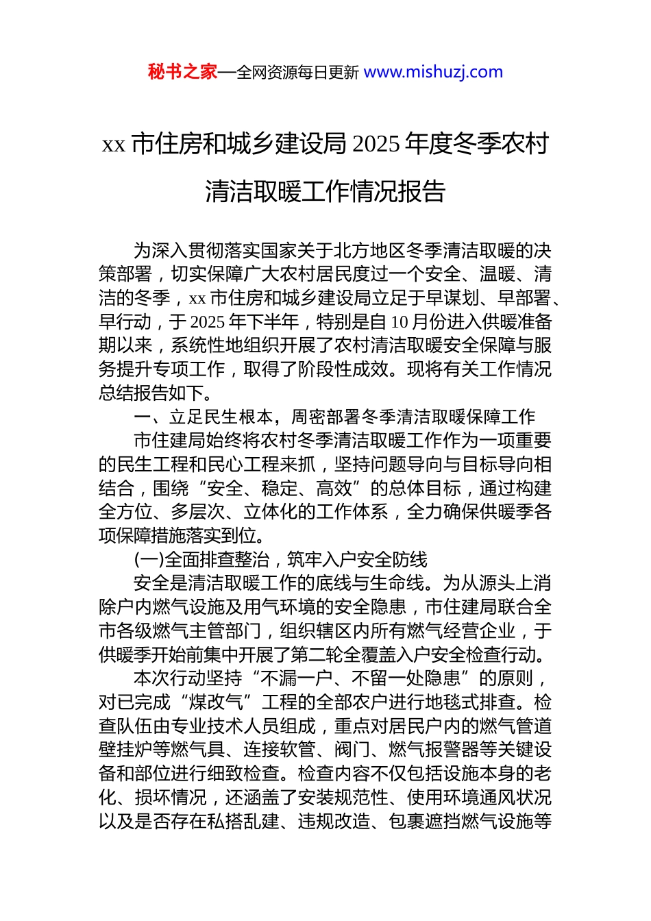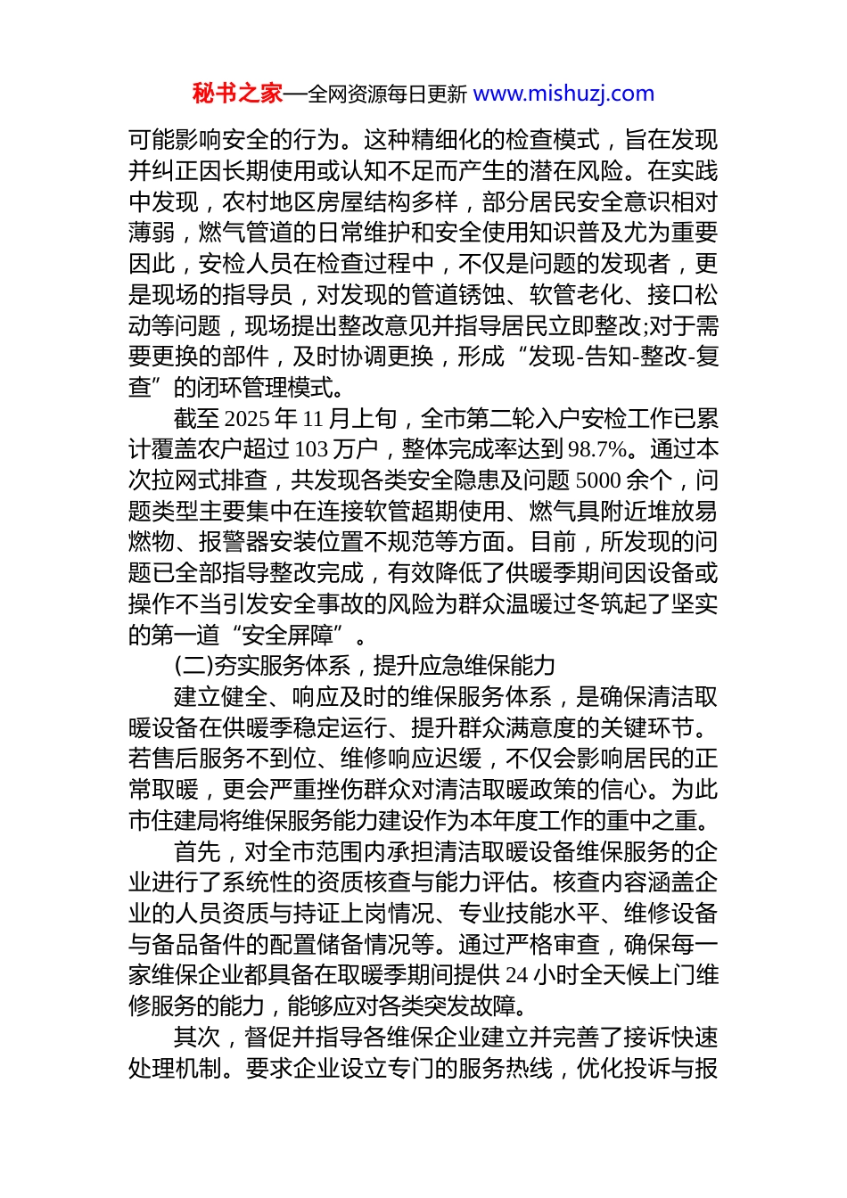 秘书之家—全网资源每日更新 www.mishuzj.comxx 市住房和城乡建设局 2025 年度冬季农村清洁取暖工作情况报告为深入贯彻落实国家关于北方地区冬季清洁取暖的决策部署,切实保障广大农村居民度过一个安全、温暖、清洁的冬季,xx 市住房和城乡建设局立足于早谋划、早部署、早行动,于 2025 年下半年,特别是自 10 月份进入供暖准备期以来,系统性地组织开展了农村清洁取暖安全保障与服务提升专项工作,取得了阶段性成效。现将有关工作情况总结报告如下。一、立足民生根本,周密部署冬季清洁取暖保障工作市住建局始终将农村冬季清洁取暖工作作为一项重要的民生工程和民心工程来抓,坚持问题导向与目标导向相结合,围绕“安全、稳定、高效”的总体目标,通过构建全方位、多层次、立体化的工作体系,全力确保供暖季各项保障措施落实到位。(一)全面排查整治,筑牢入户安全防线安全是清洁取暖工作的底线与生命线。为从源头上消除户内燃气设施及用气环境的安全隐患,市住建局联合全市各级燃气主管部门,组织辖区内所有燃气经营企业,于供暖季开始前集中开展了第二轮全覆盖入户安全检查行动。本次行动坚持“不漏一户、不留一处隐患”的原则,对已完成“煤改气”工程的全部农户进行地毯式排查。检查队伍由专业技术人员组成,重点对居民户内的燃气管道壁挂炉等燃气具、连接软管、阀门、燃气报警器等关键设备和部位进行细致检查。检查内容不仅包括设施本身的老化、损坏情况,还涵盖了安装规范性、使用环境通风状况以及是否存在私搭乱建、违规改造、包裹遮挡燃气设施等秘书之家—全网资源每日更新 www.mishuzj.com可能影响安全的行为。这种精细化的检查模式,旨在发现并纠正因长期使用或认知不足而产生的潜在风险。在实践中发现,农村地区房屋结构多样,部分居民安全意识相对薄弱,燃气管道的日常维护和安全使用知识普及尤为重要因此,安检人员在检查过程中,不仅是问题的发现者,更是现场的指导员,对发现的管道锈蚀、软管老化、接口松动等问题,现场提出整改意见并指导居民立即整改;对于需要更换的部件,及时协调更换,形成“发现-告知-整改-复查”的闭环管理模式。截至 2025 年 11 月上旬,全市第二轮入户安检工作已累计覆盖农户超过 103 万户,整体完成率达到 98.7%。通过本次拉网式排查,共发现各类安全隐患及问题 5000 余个,问题类型主要集中在连接软管超期使用、燃气具附近堆放易燃物、报警器安装位置不规范等方面。目前,所发现的问题已全部指导整改完成,有效降低了供暖季期间因设备或操作不当引发安全事故的风险为群众温暖过冬筑起了坚实的第一道“安全屏障”。(二)夯实服务体系,提升应急维保能力建立健全、响应及时的维保服务体系,是确保清洁取暖设备在供暖季稳定运行、提升群众满意度的关键环节。若售后服务不到位、维修响应迟缓,不仅会影响居民的正常取暖,更会严重挫伤群众对清洁取暖政策的信心。为此市住建局将维保服务能力建设作为本年度工作的重中之重。首先,对全市范围内承担清洁取暖设备维保服务的企业进行了系统性的资质核查与能力评估。核查内容涵盖企业的人员资质与持证上岗情况、专业技能水平、维修设备与备品备件的配置储备情况等。通过严格审查,确保每一家维保企业都具备在取暖季期间提供 24 小时全天候上门维修服务的能力,能够应对各类突发故障。其次,督促并指导各维保企业建立并完善了接诉快速处理机制。要求企业设立专门的服务热线,优化投诉与报秘书之家—全网资源每日更新 www.mishuzj.com修受理流程,并建立详尽的维保服务台账。该台账需完整记录用户的报修时间、故障描述、维修人员、处置过程、完成时间及用户反馈等信息,实现全流程可追溯管理。此举旨在确保群众的报修诉求能够得到及时受理、故障能够得到快速诊断与处置、维修完成后能够按时向用户反馈,从而全面提升群众诉求的响应率、解决率和满意率。目前,全市已在各县(市、区)合理布局设立了 45 个维修服务网点,基本实现了对乡镇及重点村庄的全覆盖,有效缩短了服务半径。共配备了 331 名专业的维保技术人员,所有人员均经过了系统的岗前培训与严格的技能考核,确保了...