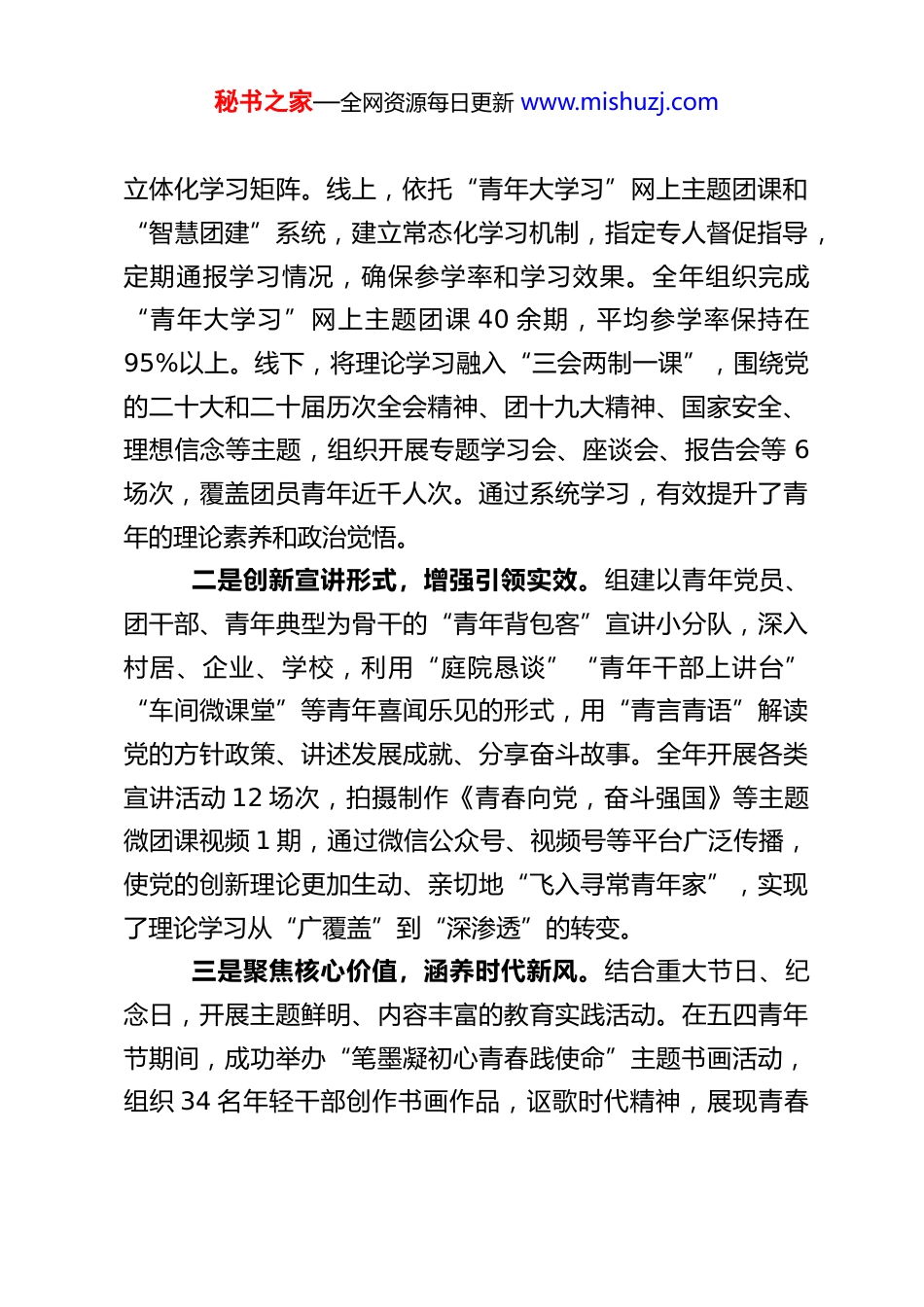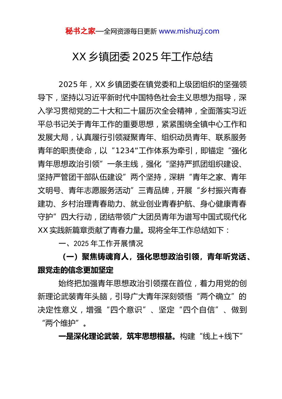 秘书之家—全网资源每日更新 www.mishuzj.comXX 乡镇团委 2025 年工作总结2025 年,XX 乡镇团委在镇党委和上级团组织的坚强领导下,坚持以习近平新时代中国特色社会主义思想为指导,深入学习贯彻党的二十大和二十届历次全会精神,全面落实习近平总书记关于青年工作的重要思想,紧紧围绕全镇中心工作和发展大局,认真履行引领凝聚青年、组织动员青年、联系服务青年的职责使命,以“1234”工作体系为牵引,即锚定“强化青年思想政治引领”一条主线,强化“坚持严抓团组织建设、坚持严管团干部队伍建设”两个坚持,深耕“青年之家、青年文明号、青年志愿服务活动”三青品牌,开展“乡村振兴青春建功、乡村治理青春助力、就业创业青春护航、身心健康青春守护”四大行动,团结带领广大团员青年为谱写中国式现代化XX 实践新篇章贡献了青春力量。现将全年工作总结如下:一、2025 年工作开展情况(一)聚焦铸魂育人,强化思想政治引领,青年听党话、跟党走的信念更加坚定始终把加强青年思想政治引领摆在首位,着力用党的创新理论武装青年头脑,引导广大青年深刻领悟“两个确立”的决定性意义,增强“四个意识”、坚定“四个自信”、做到“两个维护”。一是深化理论武装,筑牢思想根基。构建“线上+线下”秘书之家—全网资源每日更新 www.mishuzj.com立体化学习矩阵。线上,依托“青年大学习”网上主题团课和“智慧团建”系统,建立常态化学习机制,指定专人督促指导,定期通报学习情况,确保参学率和学习效果。全年组织完成“青年大学习”网上主题团课 40 余期,平均参学率保持在95%以上。线下,将理论学习融入“三会两制一课”,围绕党的二十大和二十届历次全会精神、团十九大精神、国家安全、理想信念等主题,组织开展专题学习会、座谈会、报告会等 6场次,覆盖团员青年近千人次。通过系统学习,有效提升了青年的理论素养和政治觉悟。二是创新宣讲形式,增强引领实效。组建以青年党员、团干部、青年典型为骨干的“青年背包客”宣讲小分队,深入村居、企业、学校,利用“庭院恳谈”“青年干部上讲台”“车间微课堂”等青年喜闻乐见的形式,用“青言青语”解读党的方针政策、讲述发展成就、分享奋斗故事。全年开展各类宣讲活动 12 场次,拍摄制作《青春向党,奋斗强国》等主题微团课视频 1 期,通过微信公众号、视频号等平台广泛传播,使党的创新理论更加生动、亲切地“飞入寻常青年家”,实现了理论学习从“广覆盖”到“深渗透”的转变。三是聚焦核心价值,涵养时代新风。结合重大节日、纪念日,开展主题鲜明、内容丰富的教育实践活动。在五四青年节期间,成功举办“笔墨凝初心青春践使命”主题书画活动,组织 34 名年轻干部创作书画作品,讴歌时代精神,展现青春秘书之家—全网资源每日更新 www.mishuzj.com风采。围绕培育和践行社会主义核心价值观,开展“抵制高额彩礼,XX 青年有话说”主题宣传,组织集体签名活动并拍摄主题视频,引导青年树立正确婚恋观,助力移风易俗。通过系列活动的开展,有效坚定了广大青年理想信念,激发了爱国热情和奋斗精神。(二)聚焦强基固本,夯实基层组织建设,团组织的凝聚力和战斗力持续增强坚持“党建带团建”原则,以提升组织力为重点,不断加强团的自身建设,着力打造坚强有力的基层团组织和高素质的团干部队伍。一是规范组织运行,激发支部活力。严格落实“三会两制一课”制度,定期召开支部委员会、支部团员大会,按时上好团课,规范开展组织生活会和民主评议团员工作。全年指导各团支部规范开展“学习二十大、永远跟党走、奋进新征程”等主题团日活动 12 次,有效增强了团组织的政治性和先进性。加强对“智慧团建”系统的应用和管理,实现团组织关系转接、团费收缴、活动记录等工作的信息化、规范化,全年规范转接团员组织关系 94 人。二是加强队伍建设,提升履职能力。健全团干部选拔、培养、管理和考核机制,通过集中培训、以会代训、观摩交流等方式,提升团干部的理论水平和业务能力。全年召开团干部工作例会、培训会 8 次,围绕团务知识、活动策划、宣传写作秘书之家—全网资源每日更新 www.mishuzj.com等内容进...