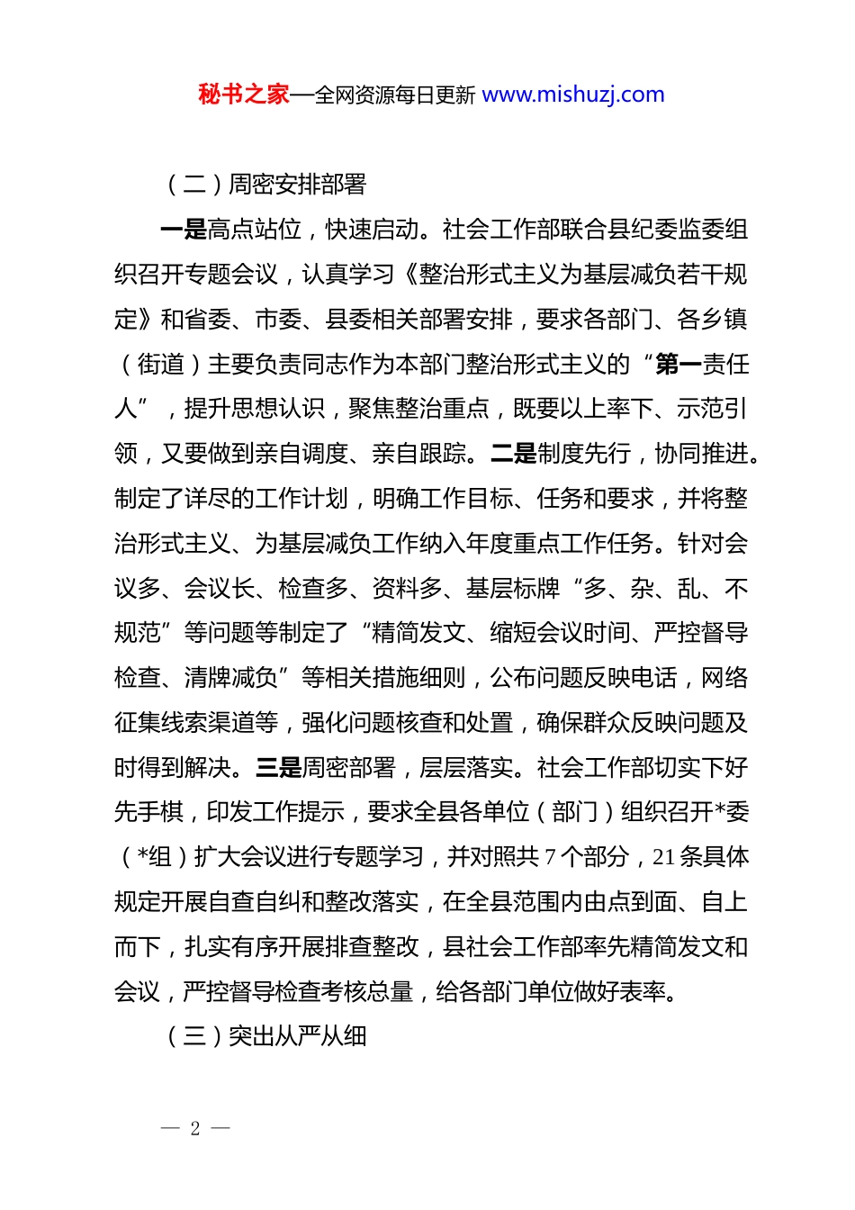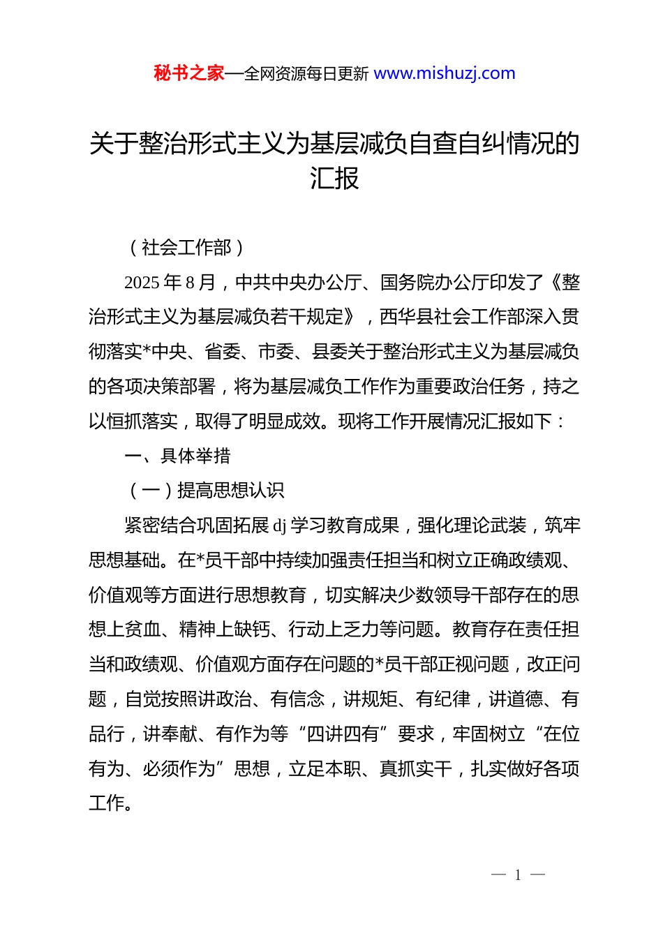 秘书之家—全网资源每日更新 www.mishuzj.com关于整治形式主义为基层减负自查自纠情况的汇报(社会工作部)2025 年 8 月,中共中央办公厅、国务院办公厅印发了《整治形式主义为基层减负若干规定》,西华县社会工作部深入贯彻落实*中央、省委、市委、县委关于整治形式主义为基层减负的各项决策部署,将为基层减负工作作为重要政治任务,持之以恒抓落实,取得了明显成效。现将工作开展情况汇报如下:一、具体举措(一)提高思想认识紧密结合巩固拓展 dj 学习教育成果,强化理论武装,筑牢思想基础。在*员干部中持续加强责任担当和树立正确政绩观、价值观等方面进行思想教育,切实解决少数领导干部存在的思想上贫血、精神上缺钙、行动上乏力等问题。教育存在责任担当和政绩观、价值观方面存在问题的*员干部正视问题,改正问题,自觉按照讲政治、有信念,讲规矩、有纪律,讲道德、有品行,讲奉献、有作为等“四讲四有” 要求,牢固树立“在位有为、必须作为”思想,立足本职、真抓实干,扎实做好各项工作。— 1 —秘书之家—全网资源每日更新 www.mishuzj.com(二)周密安排部署一是高点站位,快速启动。社会工作部联合县纪委监委组织召开专题会议,认真学习《整治形式主义为基层减负若干规定》和省委、市委、县委相关部署安排,要求各部门、各乡镇(街道)主要负责同志作为本部门整治形式主义的“第一责任人”,提升思想认识,聚焦整治重点,既要以上率下、示范引领,又要做到亲自调度、亲自跟踪。二是制度先行,协同推进。制定了详尽的工作计划,明确工作目标、任务和要求,并将整治形式主义、为基层减负工作纳入年度重点工作任务。针对会议多、会议长、检查多、资料多、基层标牌“多、杂、乱、不规范”等问题等制定了“精简发文、缩短会议时间、严控督导检查、清牌减负”等相关措施细则,公布问题反映电话,网络征集线索渠道等,强化问题核查和处置,确保群众反映问题及时得到解决。三是周密部署,层层落实。社会工作部切实下好先手棋,印发工作提示,要求全县各单位(部门)组织召开*委(*组)扩大会议进行专题学习,并对照共 7 个部分,21 条具体规定开展自查自纠和整改落实,在全县范围内由点到面、自上而下,扎实有序开展排查整改,县社会工作部率先精简发文和会议,严控督导检查考核总量,给各部门单位做好表率。(三)突出从严从细— 2 —秘书之家—全网资源每日更新 www.mishuzj.com一是以上率下,从严要求。社会工作部领导干部发挥“关键少数”作用,带头开短会、讲短话,减少一般性调研,更多采用“不打招呼、不听汇报、不用陪同,直奔基层”的“四不两直”模式,深入到农业发展、安全生产等重点项目建设一线,详细了解项目的总体规划、建设进展,推动问题和难题的解决。同时,牵头制定整治形式主义为基层减负领题调研工作机制,统筹开展好 2—3 个突出问题的调研,并要求县直部门重点开展1—2 个突出问题调研,乡镇(街道)重点开展 1—2 个突出问题调研,以更加务实的调研作风,有力推动经济社会高质量发展。二是精简整合、去粗存实。对各类考核考评台账进行科学整合,破除以往县直部门单位对乡镇考核各考核各的项、各打各的分,多部门、多条线考核的情况。同时,扎实开展重点目标任务项目精简工作,对全县各部门单位的重点目标任务进行梳理优化。如《西华县 2024 年在全市率先建设农业强县目标任务》经精简优化后,保留了 15 项涉及 8 个部门单位需要完成的事项,上报材料和工作量大幅下降。三是深挖细找,查摆问题。各单位、乡镇、街道结合各自实际,认真梳理和修改完善单位制度,开展自查自纠存在的突出问题,力求找准找实形式主义、官僚主义等方面存在的问题,一但发现对问题找得不精准,整改措施不实或虚假整改的单位部门,“打回去重来”并通报批评。— 3 —秘书之家—全网资源每日更新 www.mishuzj.com(四)强化督查问责一是统筹整合督查检查考核事项。对督查检查考核事项进行全面梳理,大幅度压缩数量,对内容相近、时间相近的事项进行合并,避免多头督查、重复检查。改进督查检查考核方式方法。更多采用“四不两直”的方式,深...