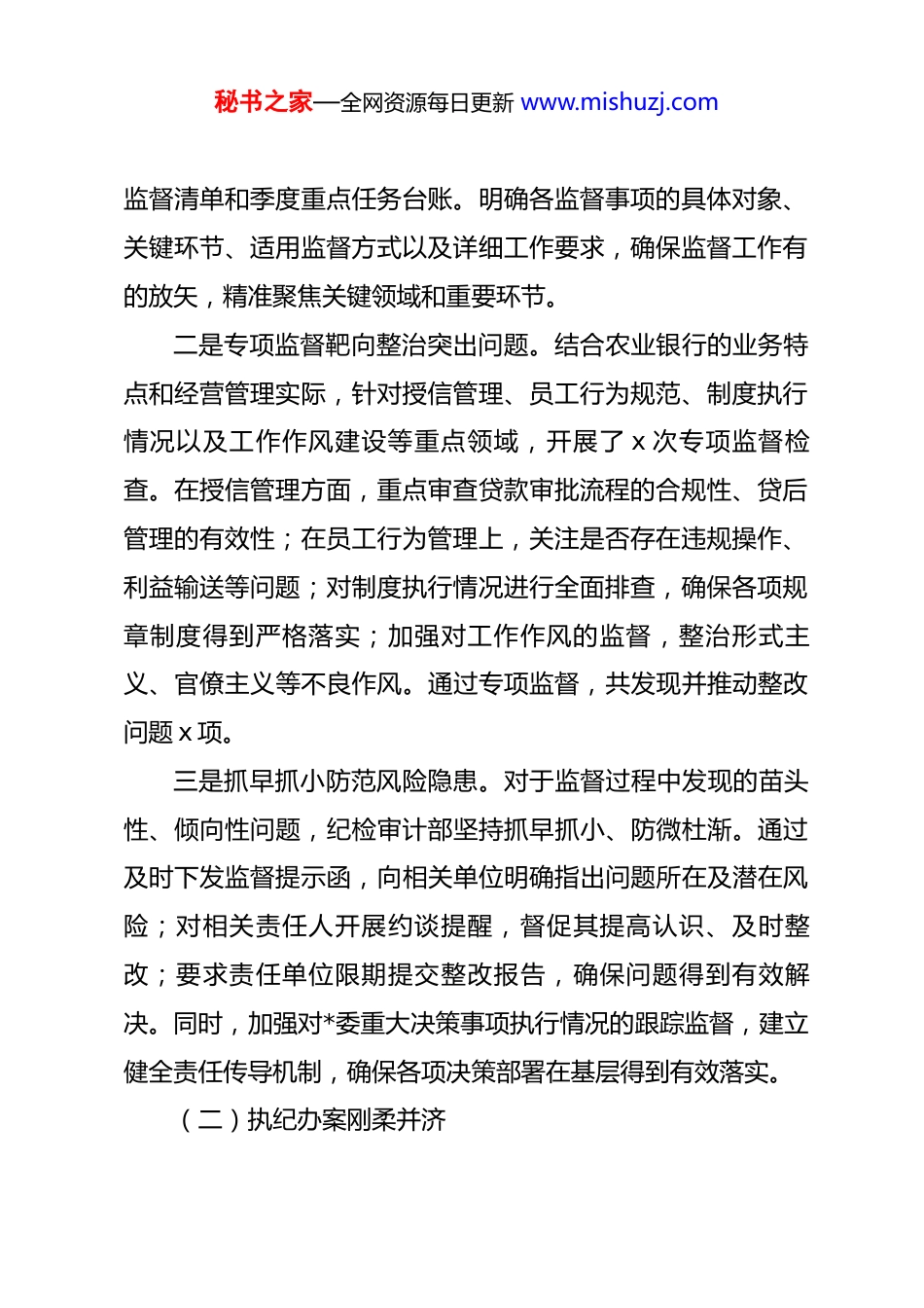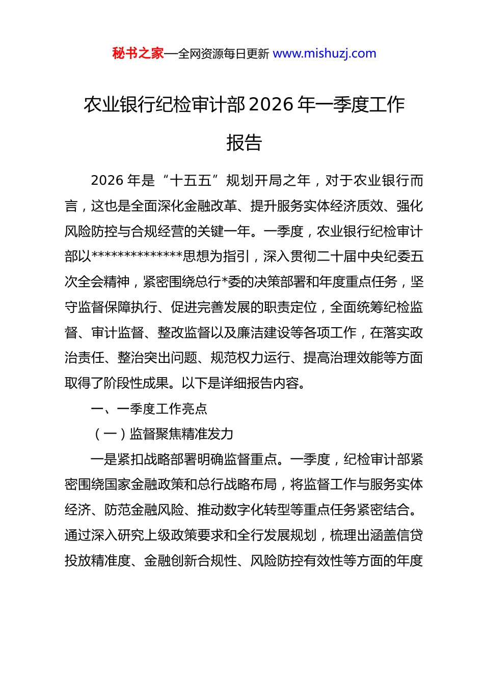 秘书之家—全网资源每日更新 www.mishuzj.com农业银行纪检审计部 2026 年一季度工作报告2026 年是“十五五”规划开局之年,对于农业银行而言,这也是全面深化金融改革、提升服务实体经济质效、强化风险防控与合规经营的关键一年。一季度,农业银行纪检审计部以**************思想为指引,深入贯彻二十届中央纪委五次全会精神,紧密围绕总行*委的决策部署和年度重点任务,坚守监督保障执行、促进完善发展的职责定位,全面统筹纪检监督、审计监督、整改监督以及廉洁建设等各项工作,在落实政治责任、整治突出问题、规范权力运行、提高治理效能等方面取得了阶段性成果。以下是详细报告内容。一、一季度工作亮点(一)监督聚焦精准发力一是紧扣战略部署明确监督重点。一季度,纪检审计部紧密围绕国家金融政策和总行战略布局,将监督工作与服务实体经济、防范金融风险、推动数字化转型等重点任务紧密结合。通过深入研究上级政策要求和全行发展规划,梳理出涵盖信贷投放精准度、金融创新合规性、风险防控有效性等方面的年度秘书之家—全网资源每日更新 www.mishuzj.com监督清单和季度重点任务台账。明确各监督事项的具体对象、关键环节、适用监督方式以及详细工作要求,确保监督工作有的放矢,精准聚焦关键领域和重要环节。二是专项监督靶向整治突出问题。结合农业银行的业务特点和经营管理实际,针对授信管理、员工行为规范、制度执行情况以及工作作风建设等重点领域,开展了 x 次专项监督检查。在授信管理方面,重点审查贷款审批流程的合规性、贷后管理的有效性;在员工行为管理上,关注是否存在违规操作、利益输送等问题;对制度执行情况进行全面排查,确保各项规章制度得到严格落实;加强对工作作风的监督,整治形式主义、官僚主义等不良作风。通过专项监督,共发现并推动整改问题 x 项。三是抓早抓小防范风险隐患。对于监督过程中发现的苗头性、倾向性问题,纪检审计部坚持抓早抓小、防微杜渐。通过及时下发监督提示函,向相关单位明确指出问题所在及潜在风险;对相关责任人开展约谈提醒,督促其提高认识、及时整改;要求责任单位限期提交整改报告,确保问题得到有效解决。同时,加强对*委重大决策事项执行情况的跟踪监督,建立健全责任传导机制,确保各项决策部署在基层得到有效落实。(二)执纪办案刚柔并济秘书之家—全网资源每日更新 www.mishuzj.com一是强化线索排查与分析研判。始终保持严的主基调,将问题线索的排查和分析研判作为执纪办案的重要基础。一季度,聚焦信贷业务、财务收支、集中采购、费用报销以及员工履职等重点领域,通过多种渠道广泛收集问题线索。对巡视巡察反馈、审计检查发现、日常监督掌握以及群众来信来访反映的问题线索进行集中梳理,建立详细的线索台账,逐一进行分类处置和登记管理。运用大数据分析、实地调查等手段,对线索进行深入分析研判,提高线索处置的精准性和时效性。二是规范线索处置与核查程序。对于反映具体、指向明确、可查性较强的问题线索,迅速启动核查程序。严格按照规定的程序和标准开展调查取证工作,确保事实清楚、证据确凿。在核查过程中,注重与相关部门的协作配合,形成工作合力。对查实存在违规违纪行为的,严格依照 dj 行规进行严肃处理;对于尚未构成违纪但存在管理漏洞、履职不到位或作风不实等问题的,综合运用谈话提醒、批评教育、责令检查等方式进行处置,做到宽严相济、精准问责。三是发挥执纪办案的震慑与教育作用。通过严肃查处一批典型案件、通报曝光一批违规行为、开展警示教育活动,进一步强化了执纪办案的震慑效果。选取具有代表性的案例进行深入剖析,组织全行员工开展警示教育活动,引导员工树立正确秘书之家—全网资源每日更新 www.mishuzj.com的价值观和合规意识。同时,通过案例分析总结经验教训,完善相关制度和流程,堵塞管理漏洞,从源头上防范违规违纪行为的发生。(三)审计效能显著提升一是审计工作全面覆盖重点领域。按照年度审计计划,一季度有序推进常规审计、专项审计和重点领域延伸检查工作。审计范围涵盖授信业务、财务收支、柜面运营、消费者权益保护、信息科技管理等多个重点领...