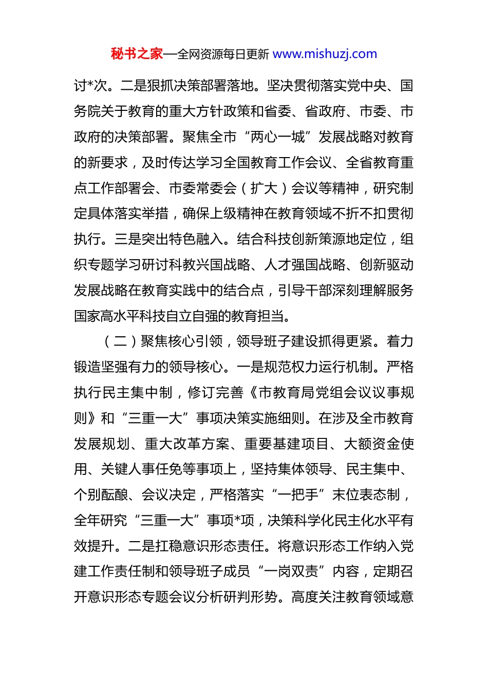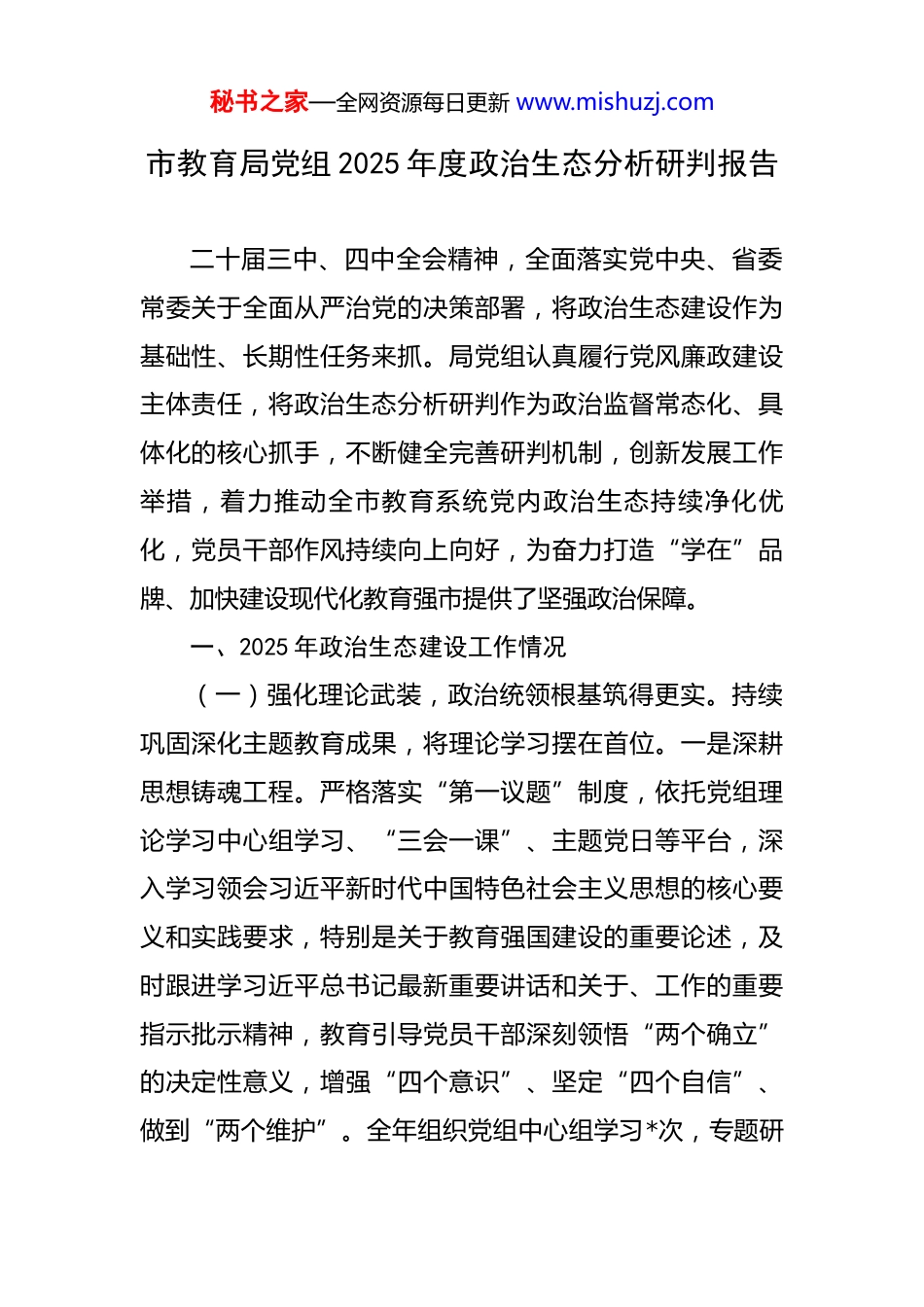 秘书之家—全网资源每日更新 www.mishuzj.com市教育局党组 2025 年度政治生态分析研判报告 二十届三中、四中全会精神,全面落实党中央、省委常委关于全面从严治党的决策部署,将政治生态建设作为基础性、长期性任务来抓。局党组认真履行党风廉政建设主体责任,将政治生态分析研判作为政治监督常态化、具体化的核心抓手,不断健全完善研判机制,创新发展工作举措,着力推动全市教育系统党内政治生态持续净化优化,党员干部作风持续向上向好,为奋力打造“学在”品牌、加快建设现代化教育强市提供了坚强政治保障。一、2025 年政治生态建设工作情况(一)强化理论武装,政治统领根基筑得更实。持续巩固深化主题教育成果,将理论学习摆在首位。一是深耕思想铸魂工程。严格落实“第一议题”制度,依托党组理论学习中心组学习、“三会一课”、主题党日等平台,深入学习领会习近平新时代中国特色社会主义思想的核心要义和实践要求,特别是关于教育强国建设的重要论述,及时跟进学习近平总书记最新重要讲话和关于、工作的重要指示批示精神,教育引导党员干部深刻领悟“两个确立”的决定性意义,增强“四个意识”、坚定“四个自信”、做到“两个维护”。全年组织党组中心组学习*次,专题研秘书之家—全网资源每日更新 www.mishuzj.com讨*次。二是狠抓决策部署落地。坚决贯彻落实党中央、国务院关于教育的重大方针政策和省委、省政府、市委、市政府的决策部署。聚焦全市“两心一城”发展战略对教育的新要求,及时传达学习全国教育工作会议、全省教育重点工作部署会、市委常委会(扩大)会议等精神,研究制定具体落实举措,确保上级精神在教育领域不折不扣贯彻执行。三是突出特色融入。结合科技创新策源地定位,组织专题学习研讨科教兴国战略、人才强国战略、创新驱动发展战略在教育实践中的结合点,引导干部深刻理解服务国家高水平科技自立自强的教育担当。(二)聚焦核心引领,领导班子建设抓得更紧。着力锻造坚强有力的领导核心。一是规范权力运行机制。严格执行民主集中制,修订完善《市教育局党组会议议事规则》和“三重一大”事项决策实施细则。在涉及全市教育发展规划、重大改革方案、重要基建项目、大额资金使用、关键人事任免等事项上,坚持集体领导、民主集中、个别酝酿、会议决定,严格落实“一把手”末位表态制,全年研究“三重一大”事项*项,决策科学化民主化水平有效提升。二是扛稳意识形态责任。将意识形态工作纳入党建工作责任制和领导班子成员“一岗双责”内容,定期召开意识形态专题会议分析研判形势。高度关注教育领域意秘书之家—全网资源每日更新 www.mishuzj.com识形态风险点,加强对教材、课堂、讲座、网络平台的管理。依托教育云平台、官方新媒体矩阵,大力宣传党的教育方针和教育改革发展成就,讲好教育故事,筑牢意识形态安全防线。三是筑牢基层战斗堡垒。制定实施《2025 年市教育系统党建工作要点》,扎实推进基层党组织标准化规范化建设。顺利完成直属学校(单位)党支部换届工作。深化“党建+”融合模式,围绕“学在”核心任务,创新开展“一支部一品牌”创建活动,推动党建工作与教育教学、教研科研、管理服务深度融合,提升党组织政治功能和组织功能。(三)压实主体责任,管党治党担当扛得更牢。坚定不移推进全面从严治党向纵深发展。一是责任链条拧紧压实。年初召开全市教育系统全面从严治党工作会议,制定印发《2025 年市教育局全面从严治党主体责任清单及任务安排》《党风廉政建设和反腐败工作要点》。局党组书记履行第一责任人职责,班子成员认真落实“一岗双责”,层层签订党风廉政建设责任书和廉洁承诺书,将压力传导至基层末梢。二是“两个清单”精准落实。动态更新完善局党组班子、党组书记、班子成员全面从严治党主体责任“两个清单”(责任清单、任务清单),明确具体事项、完成时限和责任主体。定期召开党组会议专题听取主体责秘书之家—全网资源每日更新 www.mishuzj.com任落实情况汇报,研究解决重点难点问题,确保清单任务落地见效。三是监督考核动真碰硬。将全面从严治党、意识形态工作责任制落实情况纳入对直属单位、机关处室年度...