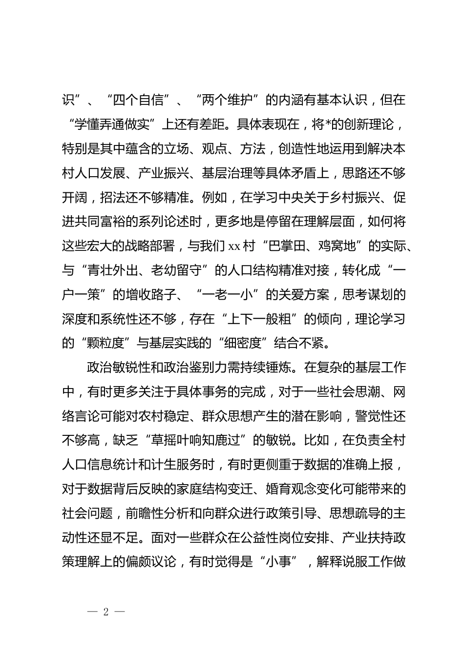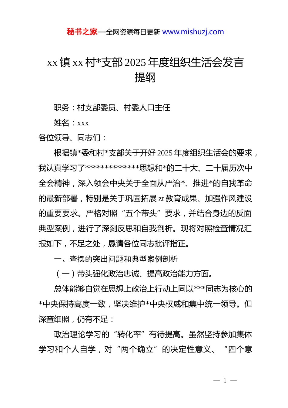 秘书之家—全网资源每日更新 www.mishuzj.comxx 镇 xx 村*支部 2025 年度组织生活会发言提纲职务:村支部委员、村委人口主任姓名:xxx各位领导、同志们:根据镇*委和村*支部关于开好 2025 年度组织生活会的要求,我认真学习了**************思想和*的二十大、二十届历次中全会精神,深入领会中央关于全面从严治*、推进*的自我革命的最新部署,特别是关于巩固拓展 zt 教育成果、加强作风建设的重要要求。严格对照“五个带头”要求,并结合身边的反面典型案例,进行了深刻反思和自我剖析。现将对照检查情况汇报如下,不足之处,恳请各位同志批评指正。一、查摆的突出问题和典型案例剖析(一)带头强化政治忠诚、提高政治能力方面。总体能够自觉在思想上政治上行动上同以***同志为核心的*中央保持高度一致,坚决维护*中央权威和集中统一领导。但深查细照,仍有不足:政治理论学习的“转化率”有待提高。虽然坚持参加集体学习和个人自学,对“两个确立”的决定性意义、“四个意— 1 —识”、“四个自信”、“两个维护”的内涵有基本认识,但在“学懂弄通做实”上还有差距。具体表现在,将*的创新理论,特别是其中蕴含的立场、观点、方法,创造性地运用到解决本村人口发展、产业振兴、基层治理等具体矛盾上,思路还不够开阔,招法还不够精准。例如,在学习中央关于乡村振兴、促进共同富裕的系列论述时,更多地是停留在理解层面,如何将这些宏大的战略部署,与我们 xx 村“巴掌田、鸡窝地”的实际、与“青壮外出、老幼留守”的人口结构精准对接,转化成“一户一策”的增收路子、“一老一小”的关爱方案,思考谋划的深度和系统性还不够,存在“上下一般粗”的倾向,理论学习的“颗粒度”与基层实践的“细密度”结合不紧。政治敏锐性和政治鉴别力需持续锤炼。在复杂的基层工作中,有时更多关注于具体事务的完成,对于一些社会思潮、网络言论可能对农村稳定、群众思想产生的潜在影响,警觉性还不够高,缺乏“草摇叶响知鹿过”的敏锐。比如,在负责全村人口信息统计和计生服务时,有时更侧重于数据的准确上报,对于数据背后反映的家庭结构变迁、婚育观念变化可能带来的社会问题,前瞻性分析和向群众进行政策引导、思想疏导的主动性还显不足。面对一些群众在公益性岗位安排、产业扶持政策理解上的偏颇议论,有时觉得是“小事”,解释说服工作做— 2 —秘书之家—全网资源每日更新 www.mishuzj.com得不够及时、不够透彻,从政治高度认识和处理这些“小事”的意识有待加强。贯彻落实上级决策部署的“穿透力”有欠缺。能够做到令行禁止,但在结合实际创造性地抓落实上,有时存在“中梗阻”。比如,落实镇*委政府关于推广“农业农村产业种植一张表”的工作要求,前期在宣传动员、表格设计上下了功夫,但在推动表格数据动态更新、真实反映田间地头实情,并真正用于指导农户调整种植结构、对接市场方面,督促检查的韧劲不足,导致部分小组的“一张表”成了“静态表”,未能完全发挥其作为产业发展“导航图”的作用。这说明,在将上级部署转化为符合村情、群众认可的“施工图”过程中,穿透到底、一抓到底的狠劲和巧劲还需提升。(二)带头固本培元、增强*性方面。始终牢记*员身份,注重加强*性锻炼,但在一些方面标准还不够高:理想信念的“压舱石”作用在日常磨砺中偶有松动。能够坚守共产*人的精神追求,但在面对基层工作的繁琐、重复以及部分群众工作的反复时,有时会产生疲劳心态、厌战情绪,觉得“年年岁岁花相似”,工作的激情和闯劲有所消退。比如,在对接镇农服中心推广新品种新技术时,遇到部分老辈农户因— 3 —守成思想不愿尝试,多次上门做工作效果不明显后,内心偶尔会闪过一丝“算了吧”的念头,缺乏那种“钉钉子”般反复敲打、直至钉实的执着,这正是理想信念在具体考验面前不够坚如磐石的表现。重温入*誓词、学习先进典型时热血沸腾,回到具体工作中,艰苦奋斗、攻坚克难的精神头有时就打了折扣。*性修养的“日常功”练得不够扎实。对*章*规 dj 的学习,有时满足于“已学过”、“知道了”,将其内化为日用而不觉的言行准则还有差距。在严格执行*的组织生活制度...