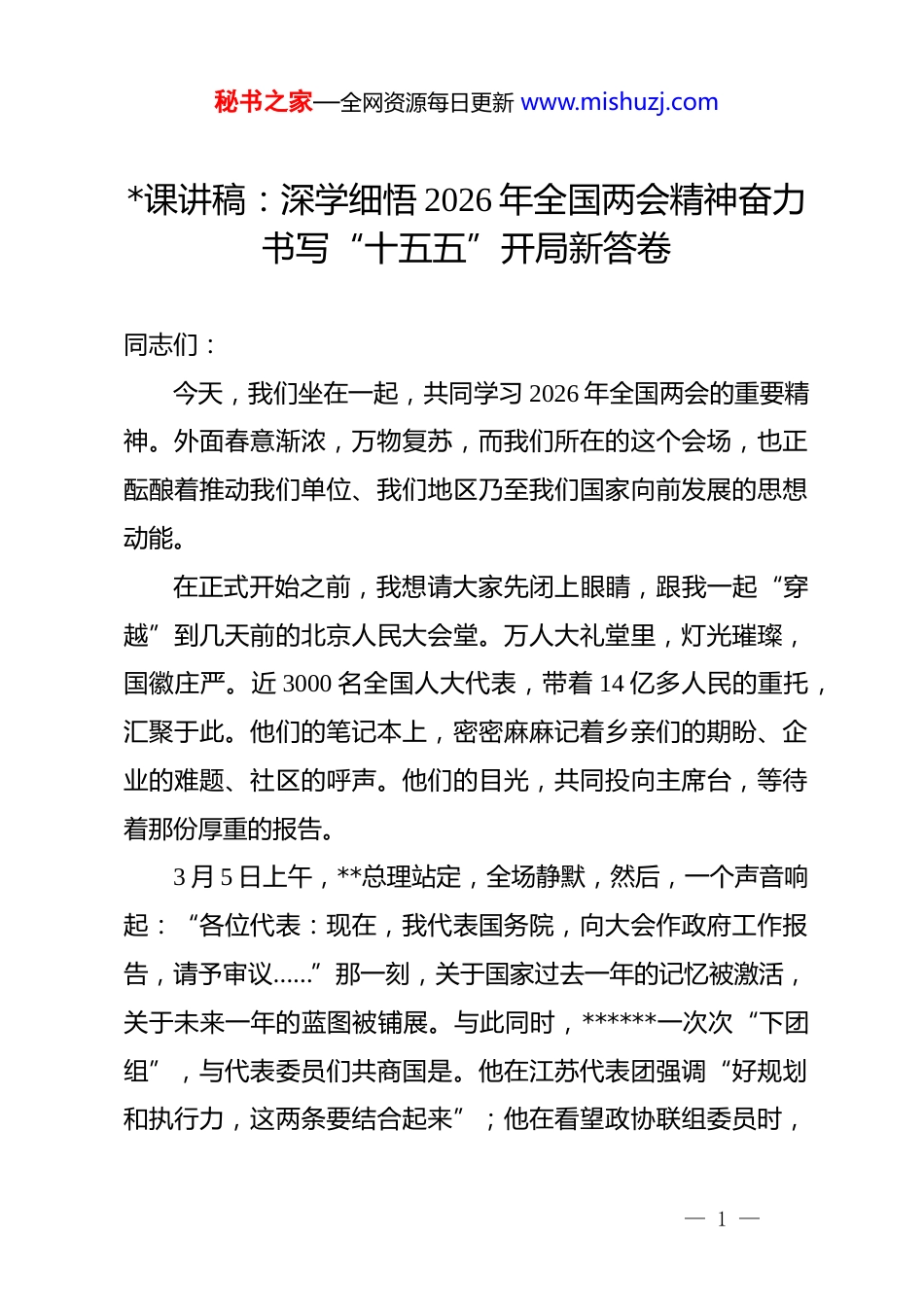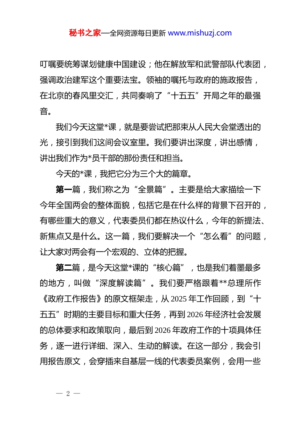 秘书之家—全网资源每日更新 www.mishuzj.com*课讲稿:深学细悟 2026 年全国两会精神奋力书写“十五五”开局新答卷同志们:今天,我们坐在一起,共同学习 2026 年全国两会的重要精神。外面春意渐浓,万物复苏,而我们所在的这个会场,也正酝酿着推动我们单位、我们地区乃至我们国家向前发展的思想动能。在正式开始之前,我想请大家先闭上眼睛,跟我一起“穿越”到几天前的北京人民大会堂。万人大礼堂里,灯光璀璨,国徽庄严。近 3000 名全国人大代表,带着 14 亿多人民的重托,汇聚于此。他们的笔记本上,密密麻麻记着乡亲们的期盼、企业的难题、社区的呼声。他们的目光,共同投向主席台,等待着那份厚重的报告。3 月 5 日上午,**总理站定,全场静默,然后,一个声音响起:“各位代表:现在,我代表国务院,向大会作政府工作报告,请予审议……”那一刻,关于国家过去一年的记忆被激活,关于未来一年的蓝图被铺展。与此同时,******一次次“下团组”,与代表委员们共商国是。他在江苏代表团强调“好规划和执行力,这两条要结合起来”;他在看望政协联组委员时,— 1 —秘书之家—全网资源每日更新 www.mishuzj.com叮嘱要统筹谋划健康中国建设;他在解放军和武警部队代表团,强调政治建军这个重要法宝。领袖的嘱托与政府的施政报告,在北京的春风里交汇,共同奏响了“十五五”开局之年的最强音。我们今天这堂*课,就是要尝试把那束从人民大会堂透出的光,接引到我们这间会议室里。我们要讲出深度,讲出感情,讲出我们作为*员干部的那份责任和担当。今天的*课,我把它分为三个大的篇章。第一篇,我们称之为“全景篇”。主要是给大家描绘一下今年全国两会的整体面貌,包括它是在什么样的背景下召开的,有哪些重大的意义,代表委员们都在热议什么,今年的新提法、新焦点又是什么。这一篇,我们要解决一个“怎么看”的问题,让大家对两会有一个宏观的、立体的把握。第二篇,是今天这堂*课的“核心篇”,也是我们着墨最多的地方,叫做“深度解读篇”。我们要严格跟着**总理所作《政府工作报告》的原文框架走,从 2025 年工作回顾,到“十五五”时期的主要目标和重大任务,再到 2026 年经济社会发展的总体要求和政策取向,最后到 2026 年政府工作的十项具体任务,逐一进行详细、深入、生动的解读。在这一部分,我会引用报告原文,会穿插来自基层一线的代表委员案例,会用一些— 2 —秘书之家—全网资源每日更新 www.mishuzj.com口语化的表达,目的就是让大家不光知道“是什么”,更明白“为什么”,搞清楚“怎么干”。这一篇,我们要解决一个“怎么懂”的问题。第三篇,是“落实篇”。学习的目的是为了运用,解读的终点是行动。蓝图绘就了,号角吹响了,我们作为基层的*员干部,到底该怎么干?怎么把两会精神转化为推动我们本地、本单位发展的强大动力?这一篇,我们要解决一个“怎么干”的问题。好,同志们,话不多说,让我们正式开启今天的学习之旅。第一篇:全景篇——深刻领会两会时代意义,掌握两会基本概况热点聚焦我们先来看第一篇,全景篇。一、非同寻常的“开局之年”:深刻认识 2026 年全国两会的时代坐标要理解一场会议的重要性,首先要看它召开的时间节点。今年的全国两会,也就是十四届全国人大四次会议和全国政协十四届四次会议,它的时代坐标是什么呢?**总理在报告一开篇就点明了:“2025 年是很不平凡的一年。”紧接着,报告又明确指出:“今年是‘十五五’开局之年。”这两个定位,就把今年的两会放在了一个承前启后、继往— 3 —秘书之家—全网资源每日更新 www.mishuzj.com开来的历史关键节点上。首先,它是“十四五”圆满收官后的“成果检阅会”。大家看报告的第一部分“2025 年工作回顾”,其实不仅仅回顾了去年一年的工作,还用相当的篇幅,对整个“十四五”时期(2021-2025 年)的成就做了一个总结。报告里说:“过去 5 年,以***同志为核心的*中央团结带领全国各族人民,有效应对世纪疫情等超乎寻常的冲击挑战,推动*和国家事业取得新的重大成就,第二个百年奋斗目标新征程实现良好开局。”同志们,这五年的路,我们走得并不...