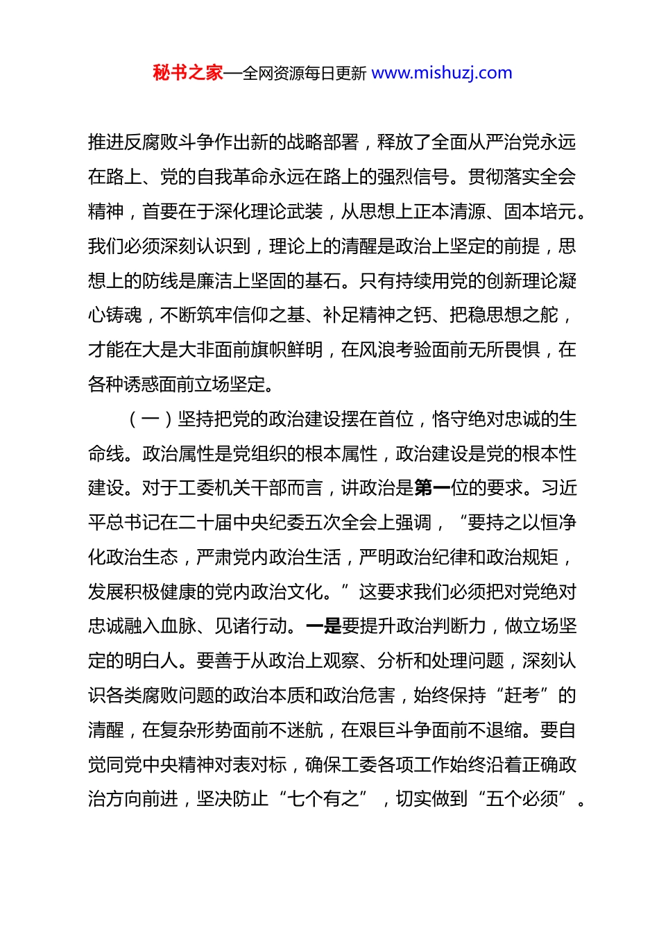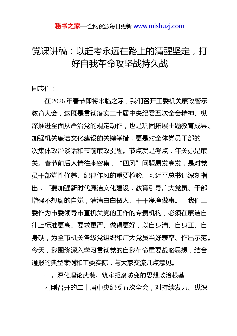 秘书之家—全网资源每日更新 www.mishuzj.com党课讲稿:以赶考永远在路上的清醒坚定,打好自我革命攻坚战持久战 同志们:在 2026 年春节即将来临之际,我们召开工委机关廉政警示教育大会,这既是贯彻落实二十届中央纪委五次全会精神、纵深推进全面从严治党的规定动作,也是巩固拓展主题教育成果、加强机关廉洁文化建设的关键举措,更是对全体党员干部的一次集体政治谈话和节前廉政提醒。节点就是考点,年关亦是廉关。春节前后人情往来密集,“四风”问题易发高发,是对党员干部党性修养、纪律作风的重要检验。习近平总书记深刻指出,“要加强新时代廉洁文化建设,教育引导广大党员、干部增强不想腐的自觉,清清白白做人、干干净净做事。”我们工委作为市委领导市直机关党的工作的专责机构,必须在廉洁自律上标准更高、要求更严、做得更好,以自身清、自身正、自身硬,为全市机关各级党组织和广大党员当好表率、作出示范。今天,我围绕深入学习贯彻党的自我革命重要战略思想,结合通报的典型案例和工委实际,与大家交流几点意见。一、深化理论武装,筑牢拒腐防变的思想政治根基刚刚召开的二十届中央纪委五次全会,对持续发力、纵深秘书之家—全网资源每日更新 www.mishuzj.com推进反腐败斗争作出新的战略部署,释放了全面从严治党永远在路上、党的自我革命永远在路上的强烈信号。贯彻落实全会精神,首要在于深化理论武装,从思想上正本清源、固本培元。我们必须深刻认识到,理论上的清醒是政治上坚定的前提,思想上的防线是廉洁上坚固的基石。只有持续用党的创新理论凝心铸魂,不断筑牢信仰之基、补足精神之钙、把稳思想之舵,才能在大是大非面前旗帜鲜明,在风浪考验面前无所畏惧,在各种诱惑面前立场坚定。(一)坚持把党的政治建设摆在首位,恪守绝对忠诚的生命线。政治属性是党组织的根本属性,政治建设是党的根本性建设。对于工委机关干部而言,讲政治是第一位的要求。习近平总书记在二十届中央纪委五次全会上强调,“要持之以恒净化政治生态,严肃党内政治生活,严明政治纪律和政治规矩,发展积极健康的党内政治文化。”这要求我们必须把对党绝对忠诚融入血脉、见诸行动。一是要提升政治判断力,做立场坚定的明白人。要善于从政治上观察、分析和处理问题,深刻认识各类腐败问题的政治本质和政治危害,始终保持“赶考”的清醒,在复杂形势面前不迷航,在艰巨斗争面前不退缩。要自觉同党中央精神对表对标,确保工委各项工作始终沿着正确政治方向前进,坚决防止“七个有之”,切实做到“五个必须”。秘书之家—全网资源每日更新 www.mishuzj.com二是要提升政治领悟力,做理论武装的践行人。要持续深入学习党的创新理论,特别是关于党的自我革命的战略思想,深刻领悟其核心要义、精神实质、丰富内涵和实践要求。要准确把握党中央关于全面从严治党、党风廉政建设和反腐败斗争的新判断新部署新要求,自觉用以武装头脑、指导实践、推动工作,确保在思想上政治上行动上同以习近平同志为核心的党中央保持高度一致。三是要提升政治执行力,做令行禁止的实干人。要不折不扣贯彻执行党中央各项决策部署和省委、市委工作要求,确保政令畅通、令行禁止。要将讲政治的要求落实到谋划工委工作、制定政策举措、部署机关党建任务、推进督促检查的全过程各方面,坚决反对做选择、搞变通、打折扣,以实际行动诠释对党的忠诚。(二)淬炼坚如磐石的理想信念,夯实清正廉洁的压舱石理想信念是共产党人的精神支柱和政治灵魂。一些党员干部出现这样那样的问题,说到底是信仰迷茫、精神迷失。习近平总书记反复强调,“理想信念是共产党人精神上的‘钙’,没有理想信念,理想信念不坚定,精神上就会‘缺钙’,就会得‘软骨病’。”坚定理想信念是终身课题,需要常修常炼。一是要筑牢信仰之基。要深入学习党的百年奋斗史,从中汲取坚定理想信念的丰厚滋养,深刻认识红色政权来之不易、新中国秘书之家—全网资源每日更新 www.mishuzj.com来之不易、中国特色社会主义来之不易,不断增强对马克思主义、共产主义的信仰,对中国特色社会主义的信念,对实现中华民族伟大复兴中国梦的信心。要用党的光荣传...